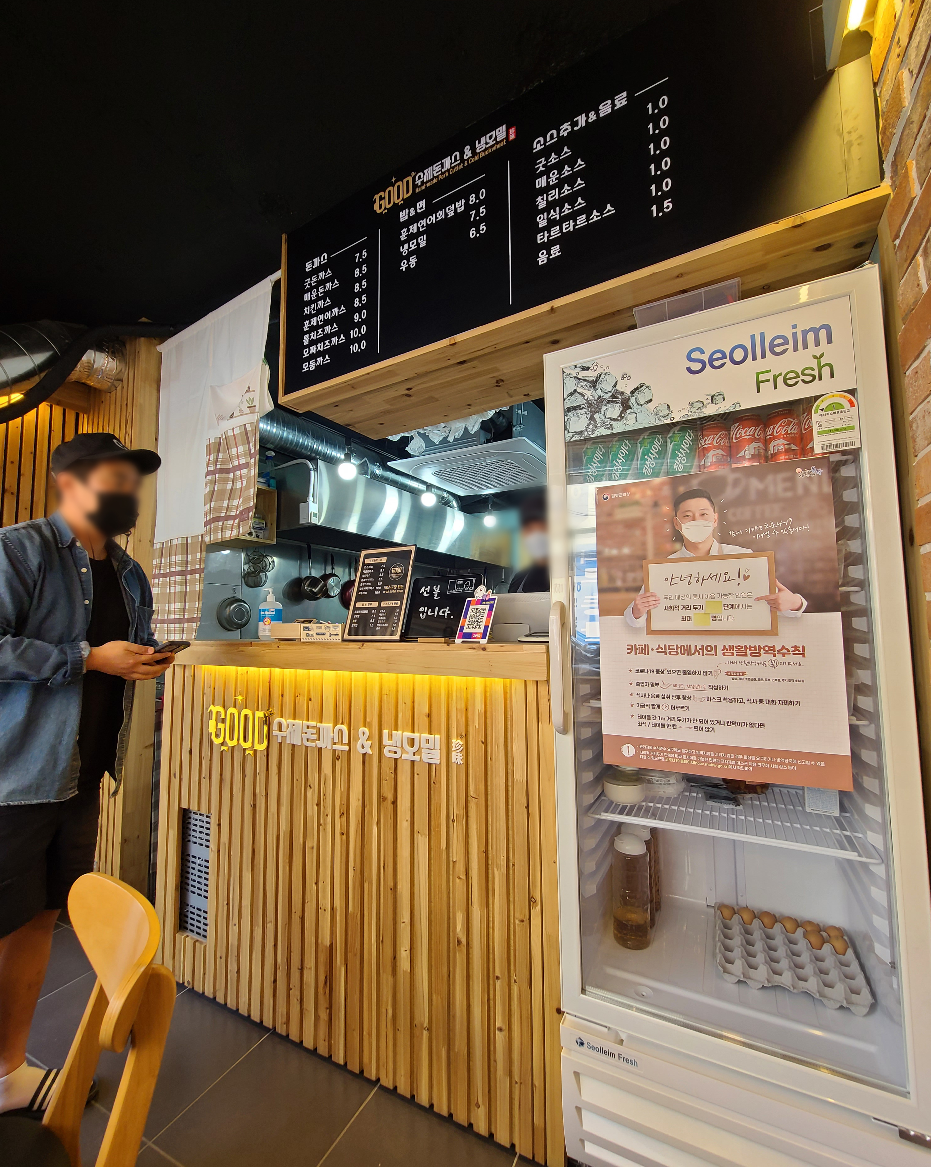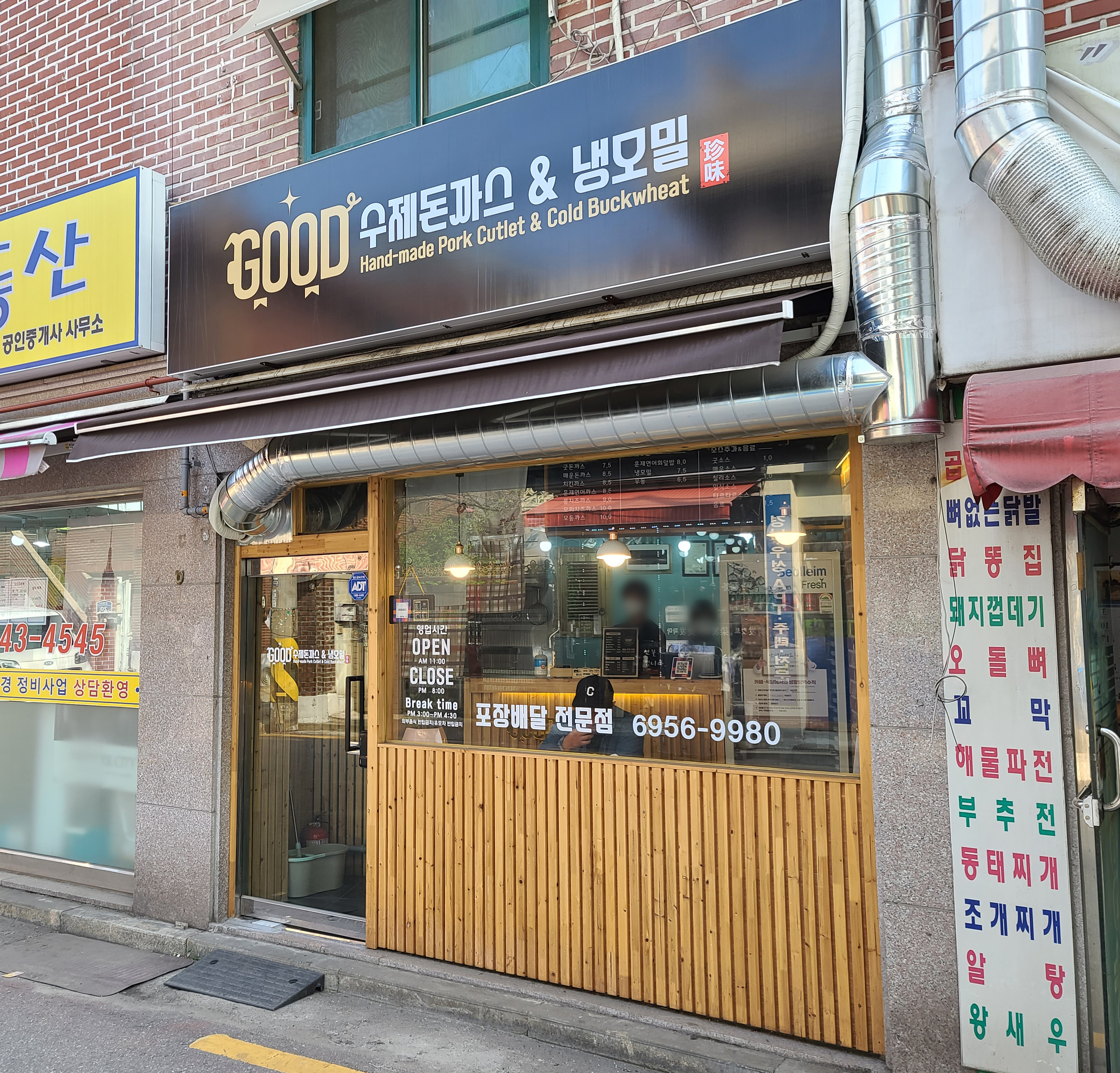 간판에는 'GOOD 수제돈까스&냉모밀' 이라고 표시가 되어있었고, 굿수제돈까스&냉모밀 가게는 포장 배달을 전문으로 하고 있었습니다. 가게에 협소하지만 테이블이 마련되어 있어서, 가게에서 식사를 할 수 있었고, 영업시간은 오전 11시부터 오후 8시까지이며, 중간에 휴식시간은 오후 3시부터 오후 4시 30분 까지였습니다.