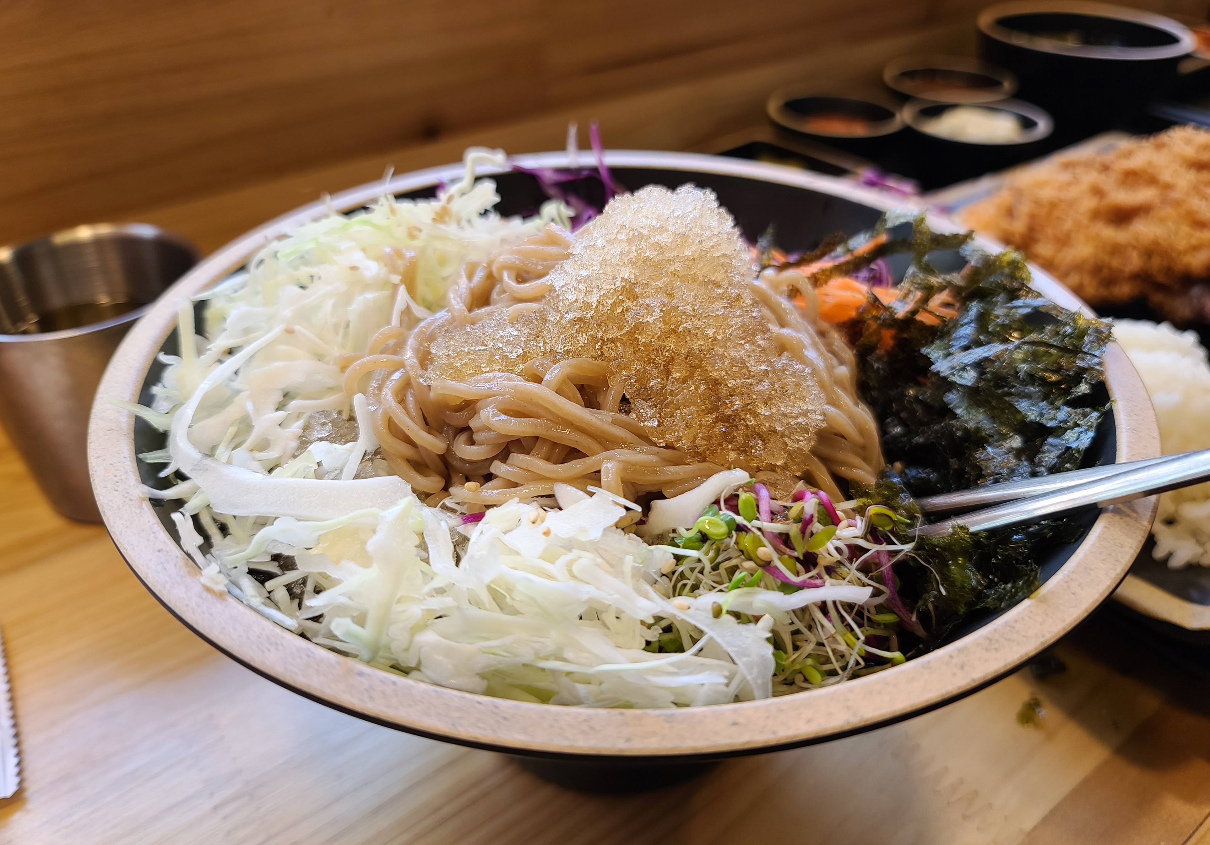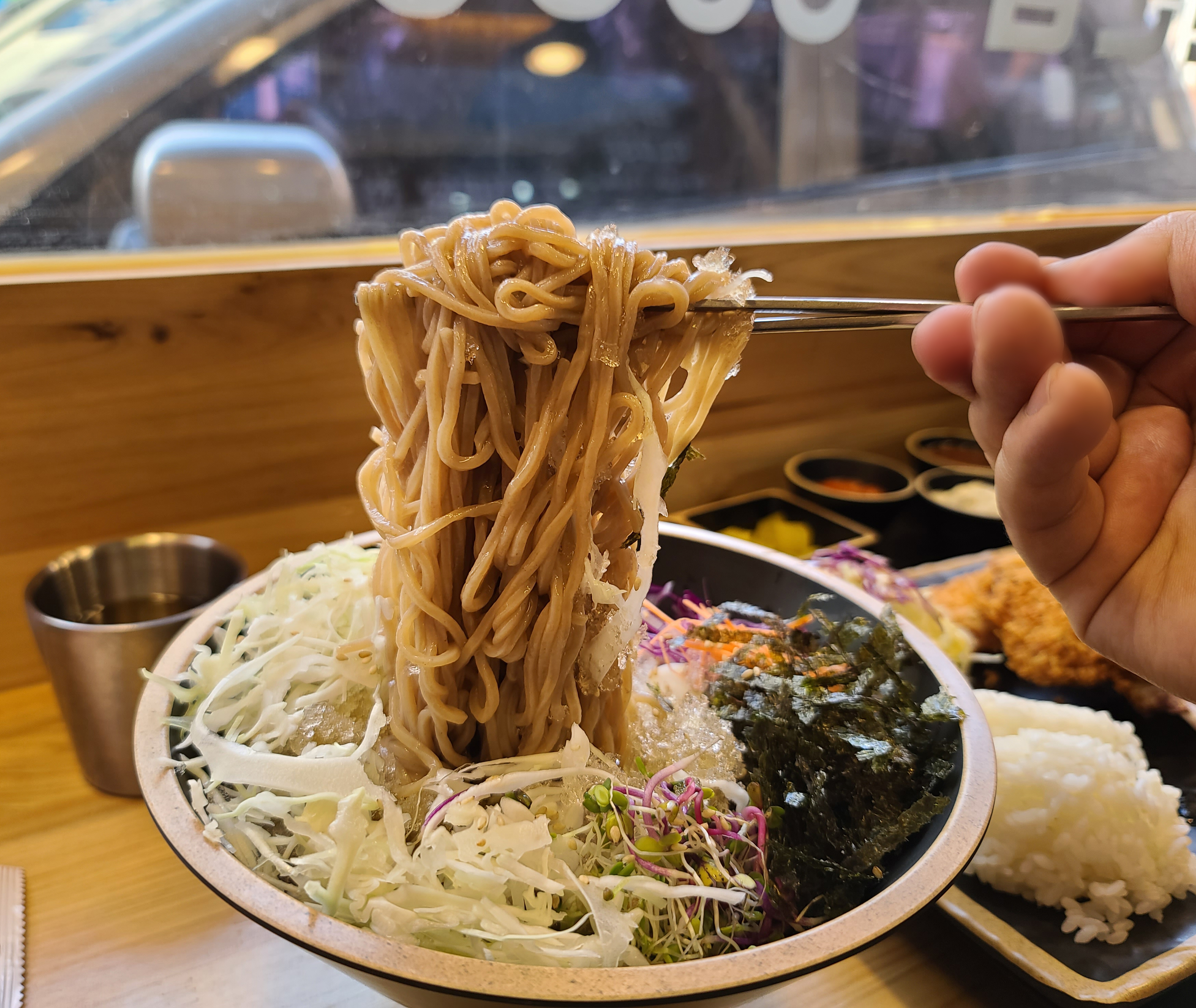 요즘 날씨가 갑자기 더워져서 냉모밀 같이 시원한 메뉴가 당겼는데, 굿수제돈까스&냉모밀 가게는 냉모밀도 잘 하는 것 같더라고요. 시원한 국물에 각종 채소들이 들어가 아삭아삭한 식감과 이가 시릴정도로 차가운 육수가 더위를 식혀주는 것 같았습니다. 길 가다가 우연히 발견하여 방문하게 된 가게인데, 나름 만족스럽게 이용한 곳이고, 이 가게는 새로생긴 곳인지, 지도검색도 안되더라고요. 전체적으로 돈까스와 냉모밀 두루 맛있었던 가게이고, 나중에 또 방문할 의사가 있는 가게입니다.