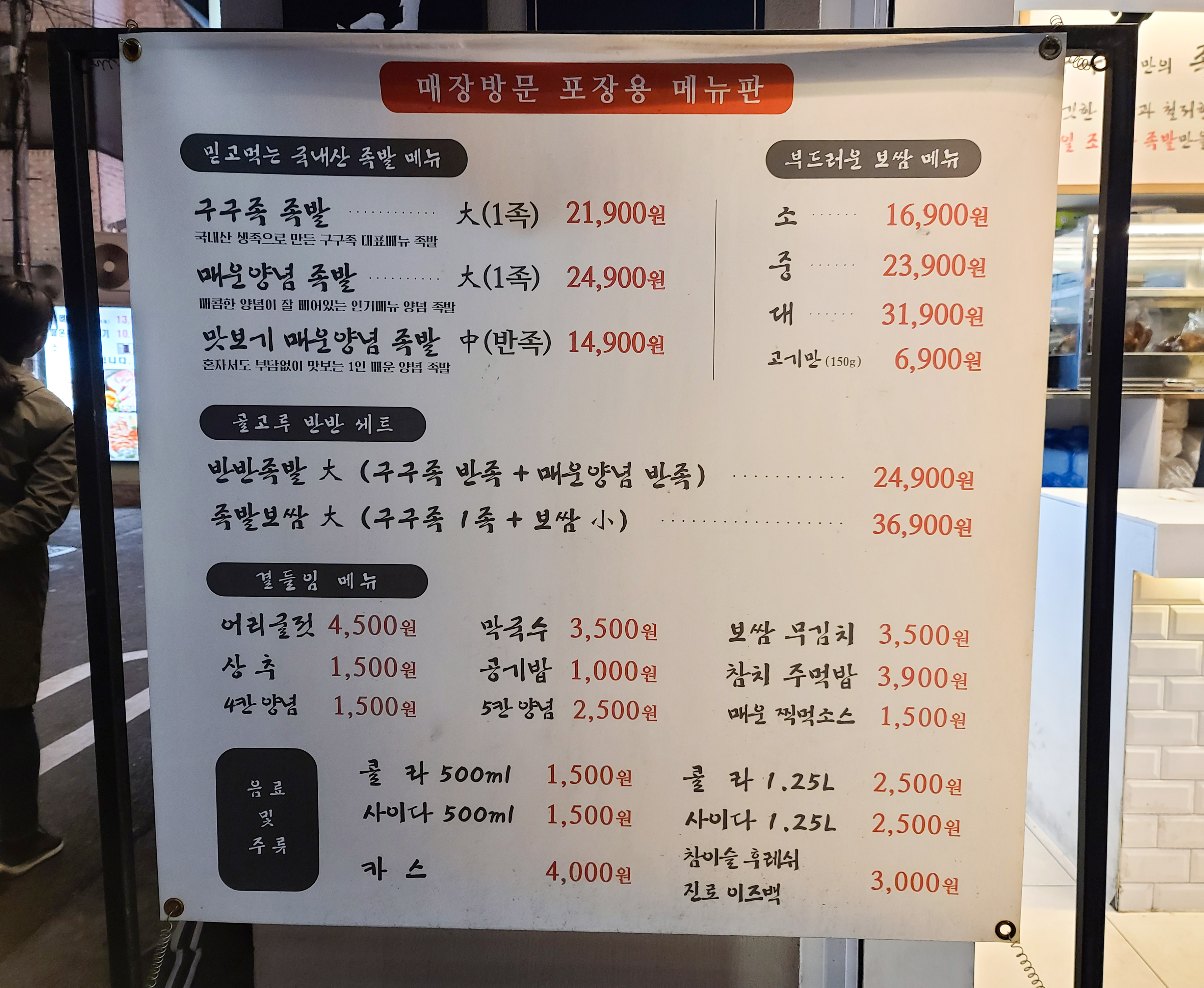 신대방역 1번 출구에서 나와서 100m 정도 걸으면, 구구족을 만날 수 있는데 포장과 배달을 전문으로 하는 가게인데, 번화가에 위치한 가게여서 그런지 손님들이 꽤 많이 대기하는 모습을 볼 수 있었습니다. 우선 메뉴를 함께 살펴보시면 구구족 족발, 매운 양념족발, 맛보기 매운 양념족발, 반반족발, 보쌈, 족발 보쌈이 메인으로 판매되는 메뉴였고, 사이드로 어리굴젓, 막국수, 보쌈 무김치, 상추, 참치 주먹밥 등을 선택할 수 있었습니다. 가격도 족발 대자 기준 21,900원이어서 크게 부담되지 않는 게 매력이었습니다.