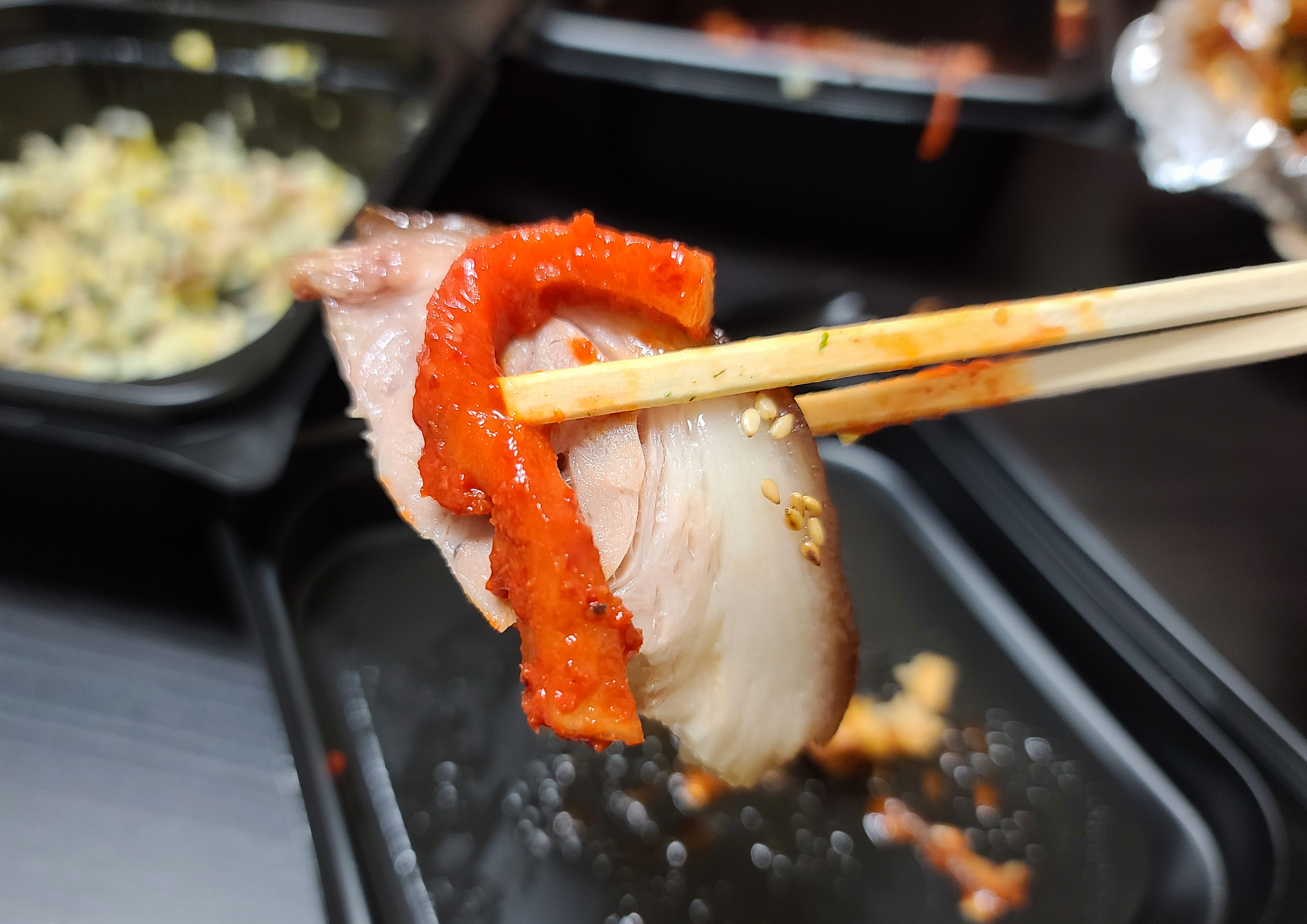 매운 족발은 특히 꽈리고추와 함께 나와서 향이랑 맛이 괜찮았습니다. 기본적인 족발도 윤기가 있고 쫀득한 식감이 꽤 맛있게 먹을 수 있었고요. 매운 양념 족발은 크게 맵지는 않았고, 고추랑 곁들여 먹으니 더욱 맛있더라고요. 전체적으로 가성비도 괜찮고, 요즘같이 매장에서 식사가 어려울 때 이용하기에 더없이 괜찮은 가게인 것 같았습니다.