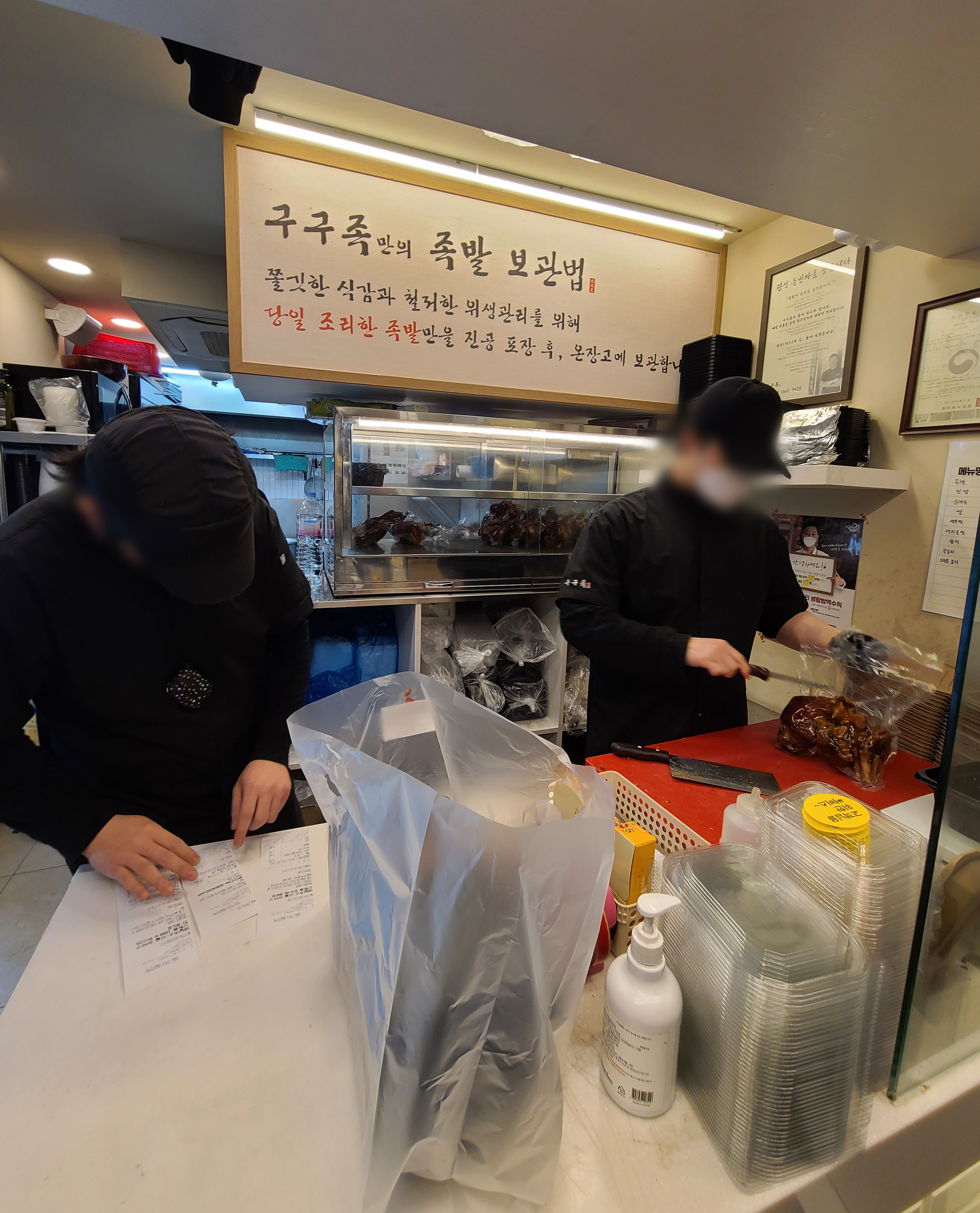 주문 방식은 위와 같이 키오스크를 통해 족발 메뉴와 사이드를 주문한 뒤 카드 또는 현금으로 결제하면 되었습니다. 요즘 키오스크 형태의 무인 주문 기계가 많아져서 주문 과정을 별로 어렵지 않았습니다. 족발은 주문 순서대로 눈 앞에서 족발을 직접 썰어주어 더 믿고 먹을 수 있어 보였습니다.