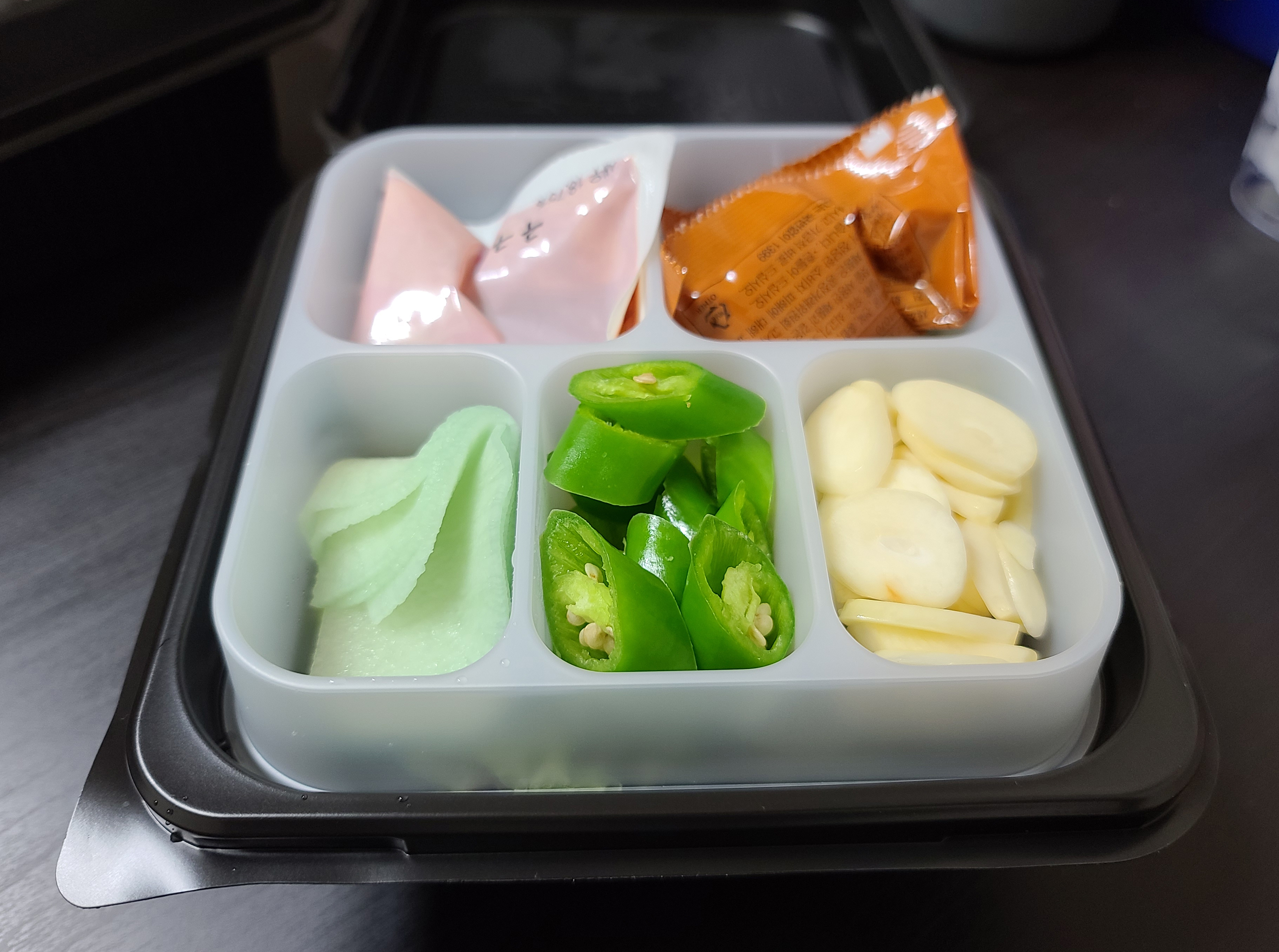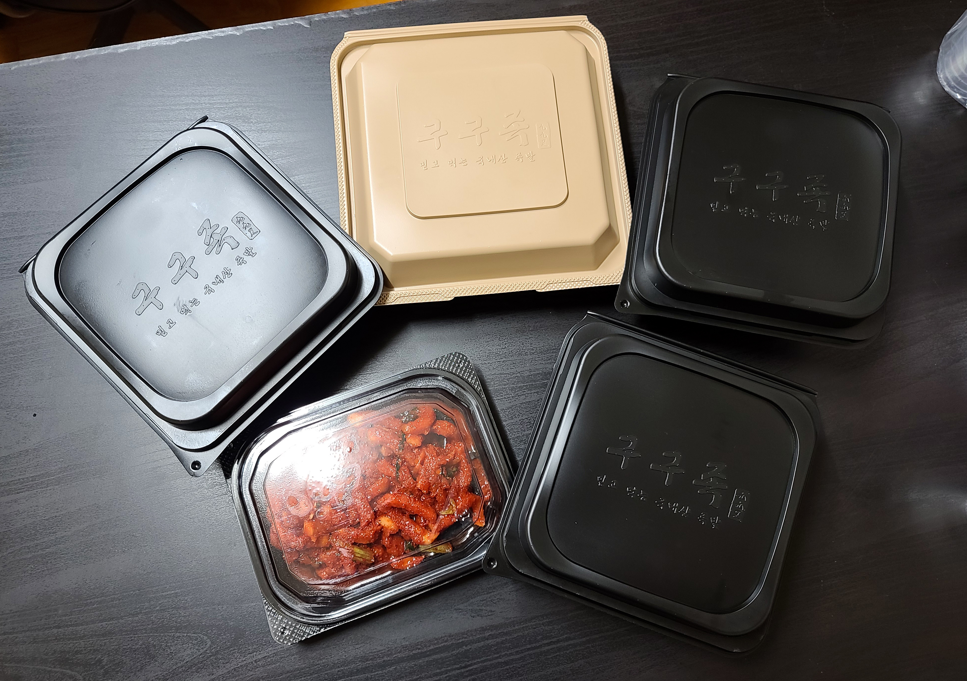 집에 도착해서 테이블에 먹기 좋게 포장을 개봉한 다음 사진을 찍어보았습니다. 족발과 함께 상추와 쌈장, 새우젓, 마늘, 고추 등이 함께 제공되었고, 추가로 주문한 보쌈 무김치, 참치 주먹밥, 막국수도 맛이 있어 보였습니다.