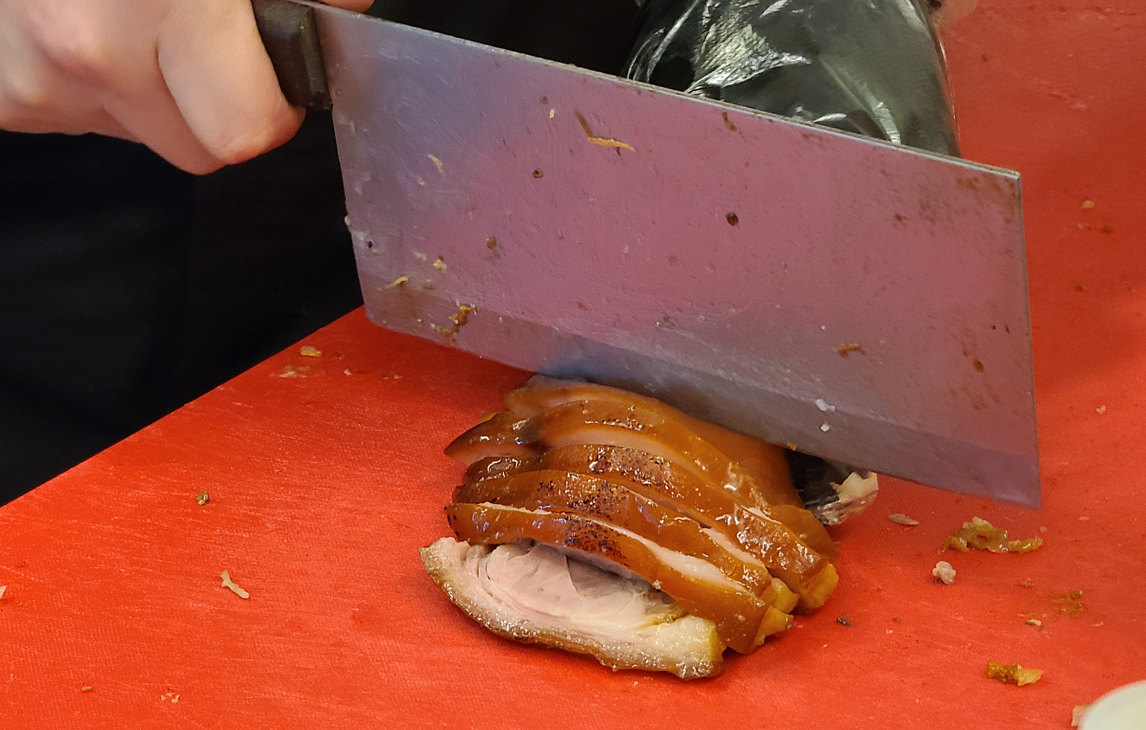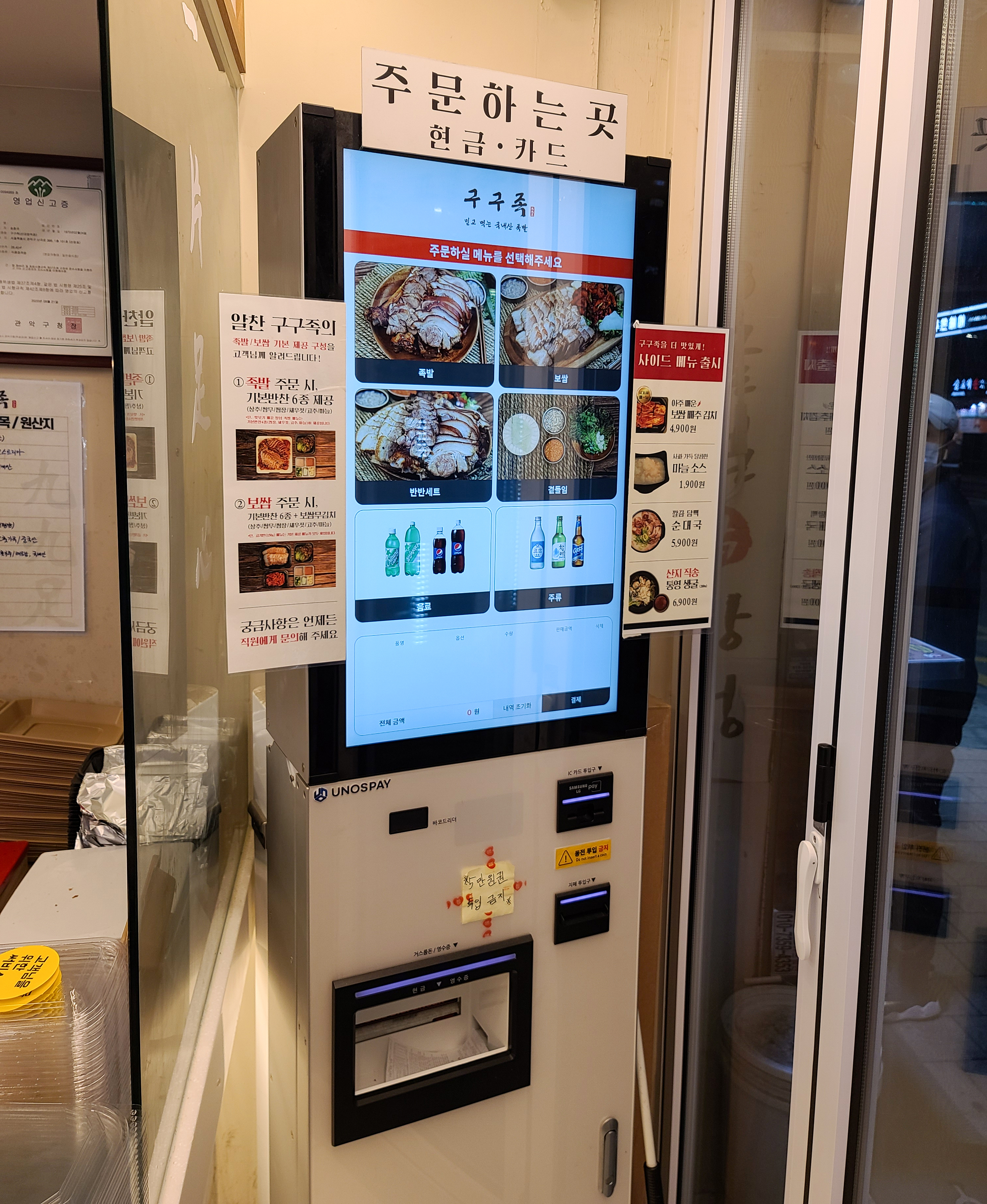 주문 방식은 위와 같이 키오스크를 통해 족발 메뉴와 사이드를 주문한 뒤 카드 또는 현금으로 결제하면 되었습니다. 요즘 키오스크 형태의 무인 주문 기계가 많아져서 주문 과정을 별로 어렵지 않았습니다. 족발은 주문 순서대로 눈 앞에서 족발을 직접 썰어주어 더 믿고 먹을 수 있어 보였습니다.