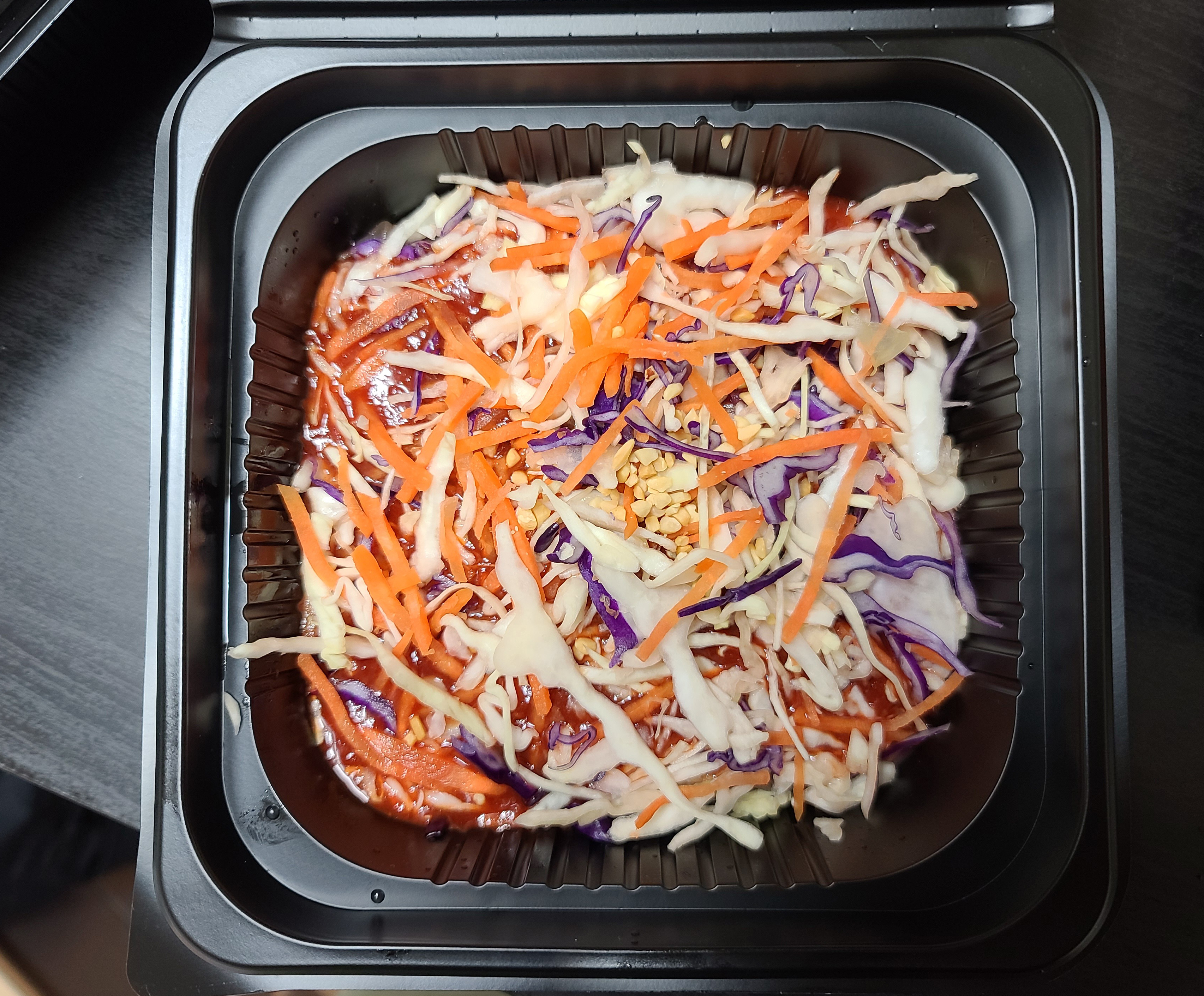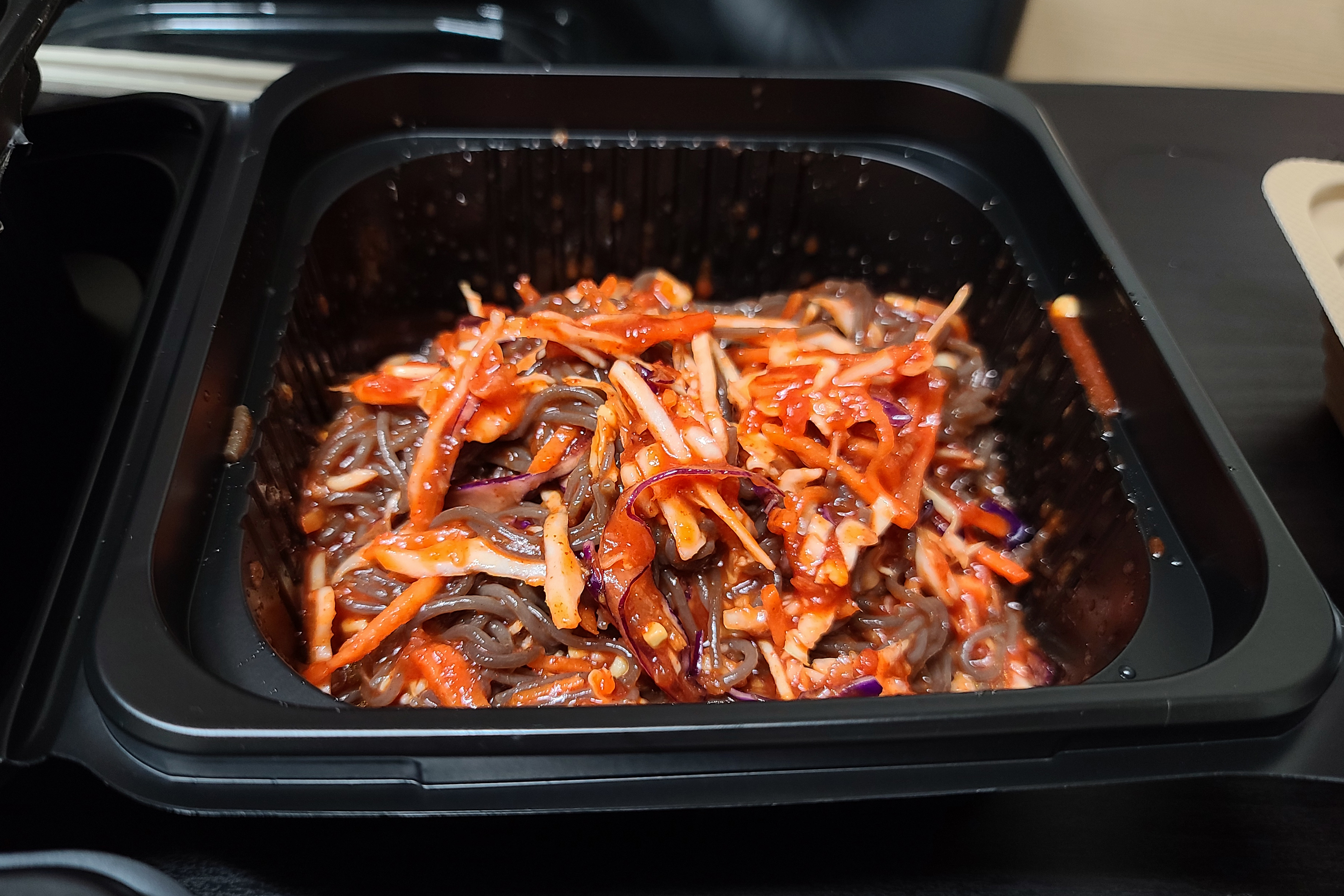 족발과 함께 참치 주먹밥도 먹기 좋게 비벼주었고, 막국수도 젓가락을 이용해 양념을 잘 섞어주었습니다. 저희가 주문한 족발은 반반족발로 구구족의 기본 족발과 매운 양념 족발을 동시에 맛볼 수 있는 메뉴였습니다.