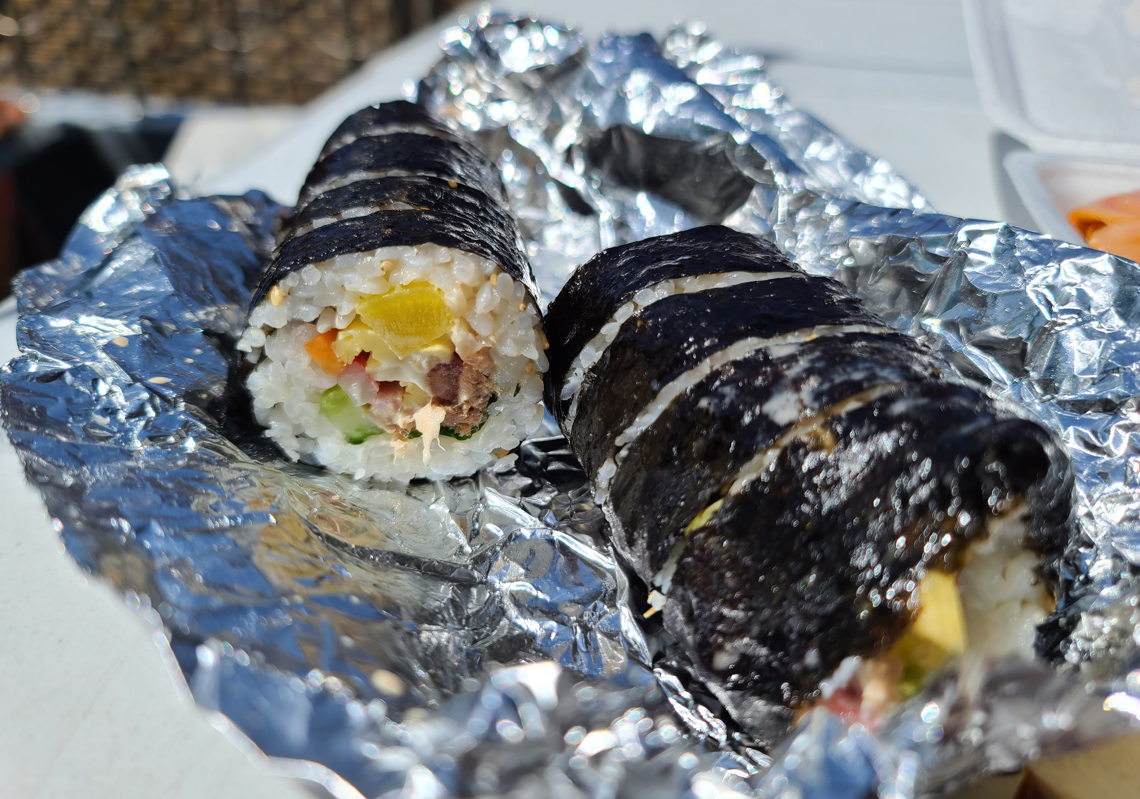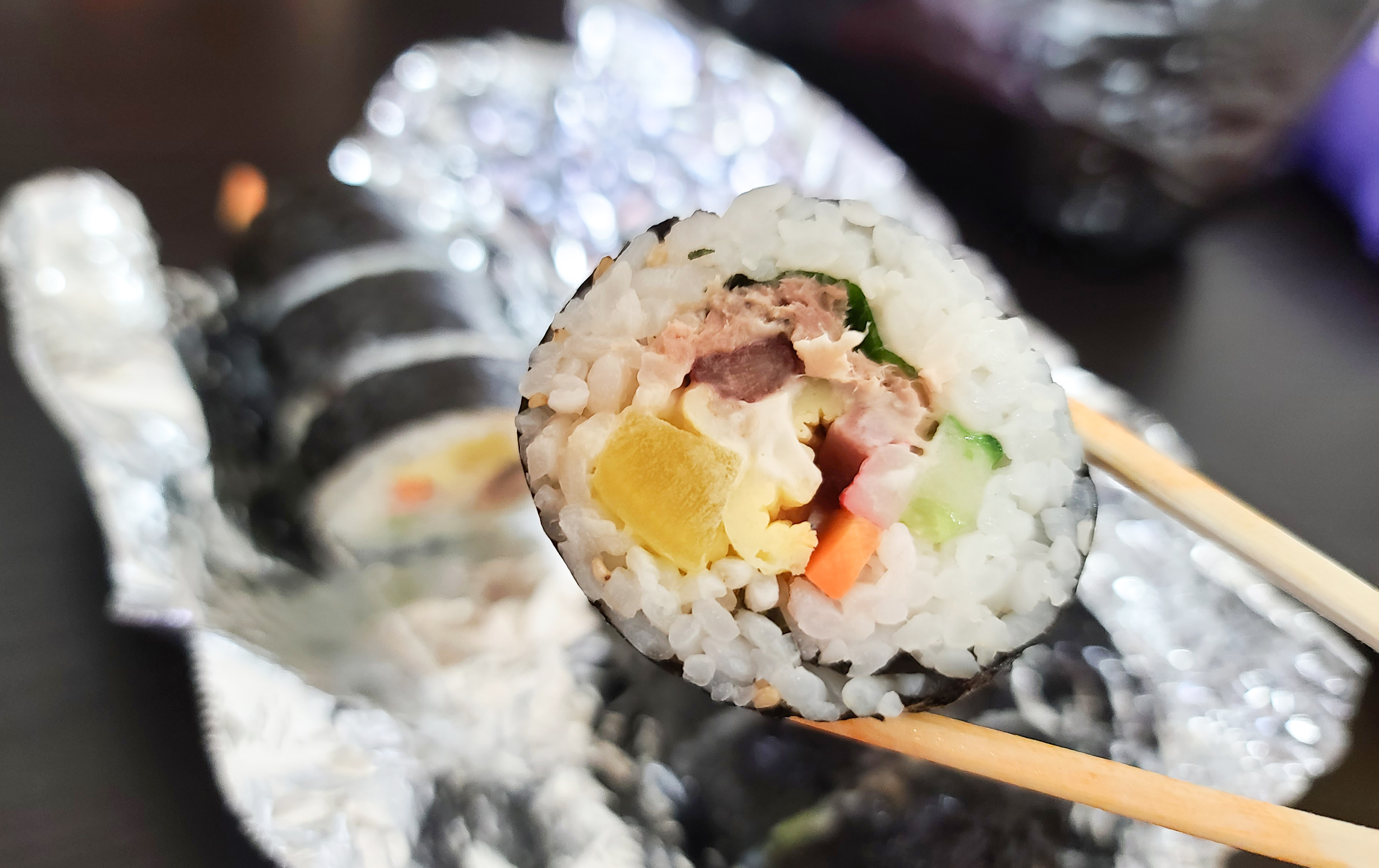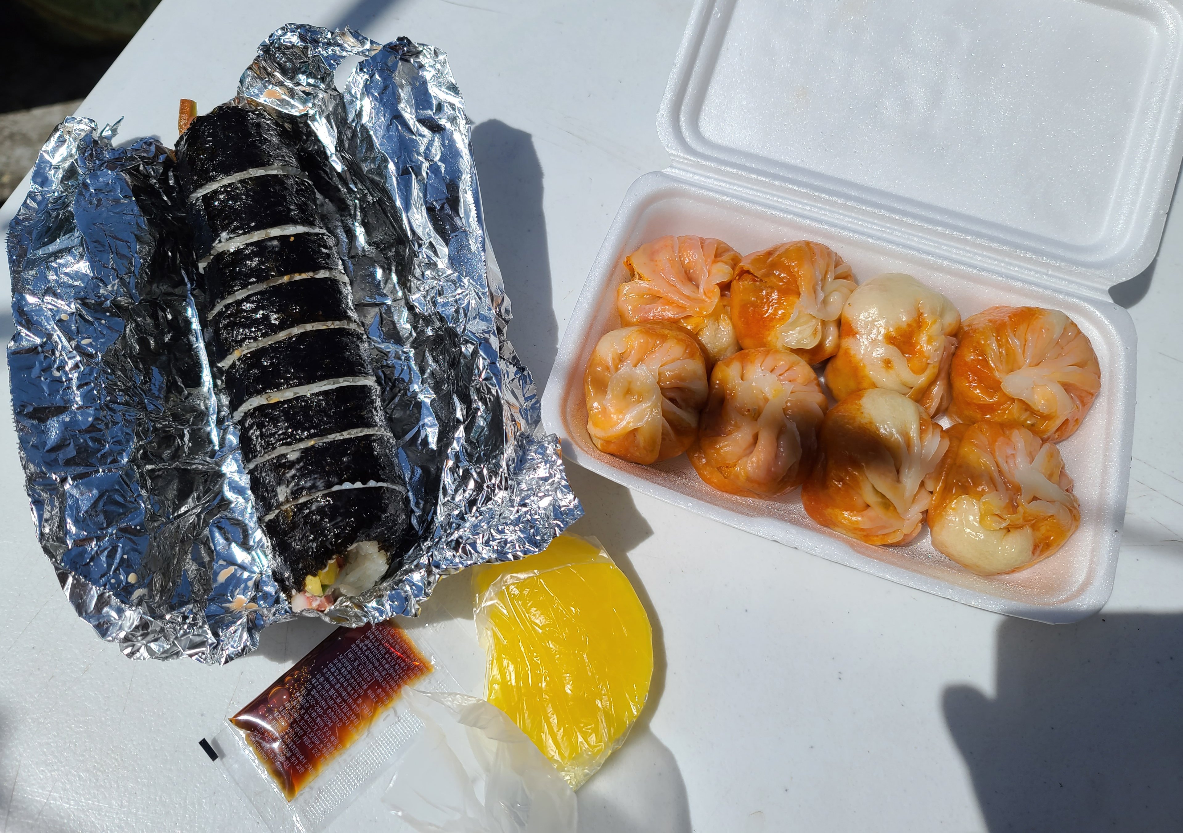 기다리는 동안 주문한 참치김밥이 준비되었고, 신사시장 모두랑분식의 참치김밥은 여느 분식집과 다를 것 없이 당근, 맛살, 햄, 오이, 단무지 등의 재료가 들어간 투박한 김밥이었습니다. 만두는 널찍한 찜기에서 직접 꺼내 담아주었고 포장하여 집으로 돌아왔습니다.