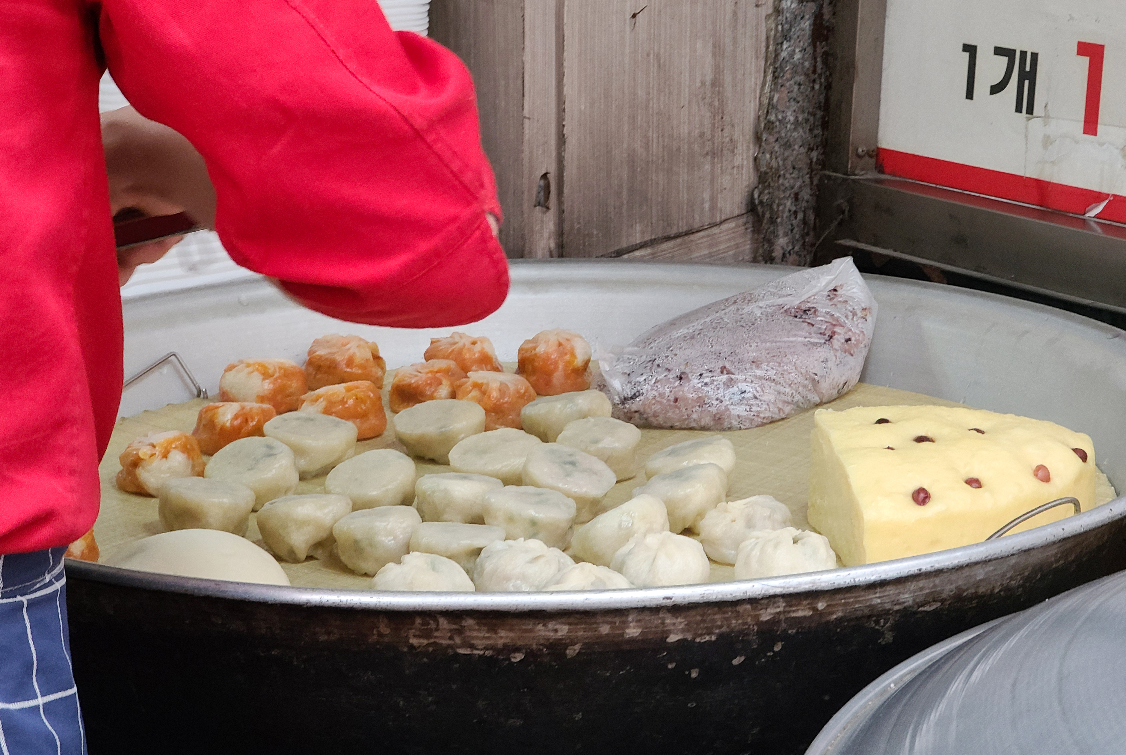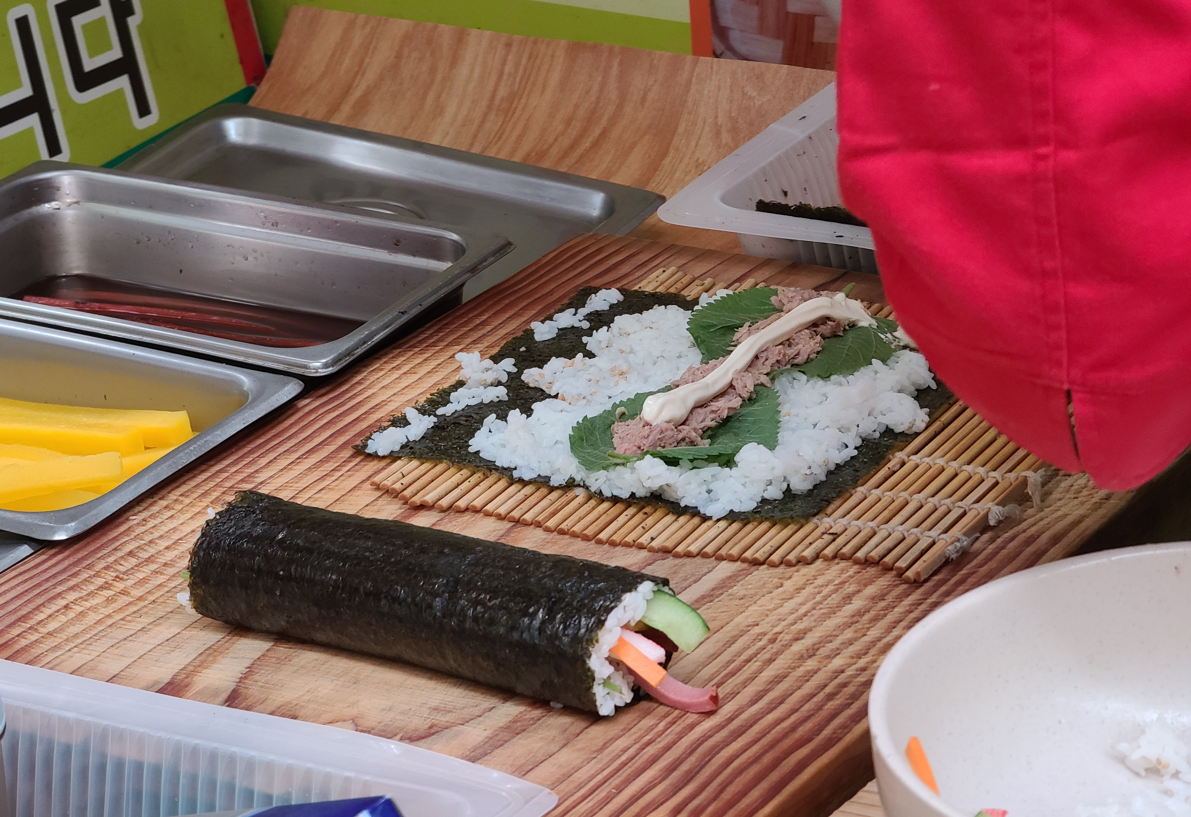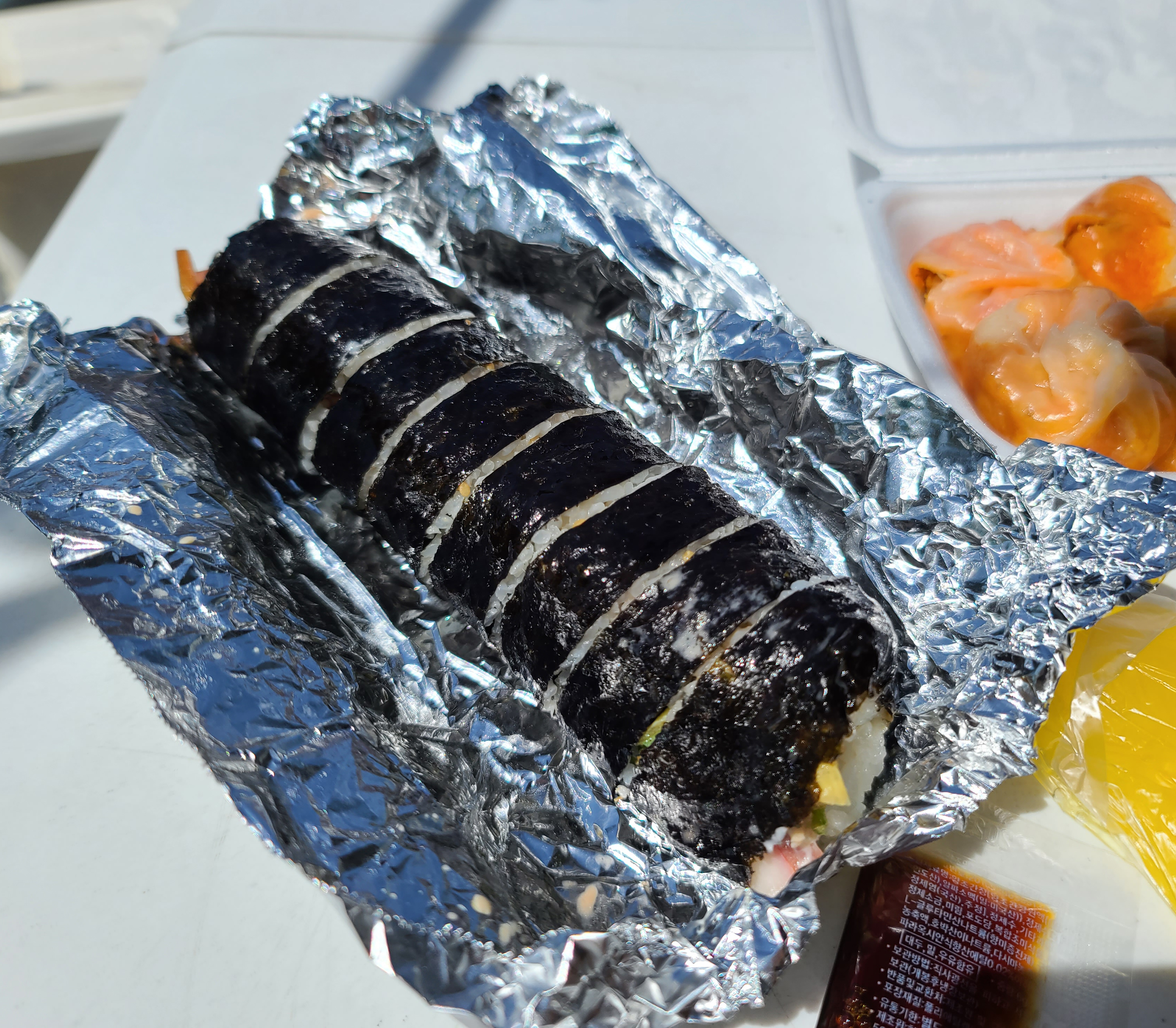 기다리는 동안 주문한 참치김밥이 준비되었고, 신사시장 모두랑분식의 참치김밥은 여느 분식집과 다를 것 없이 당근, 맛살, 햄, 오이, 단무지 등의 재료가 들어간 투박한 김밥이었습니다. 만두는 널찍한 찜기에서 직접 꺼내 담아주었고 포장하여 집으로 돌아왔습니다.