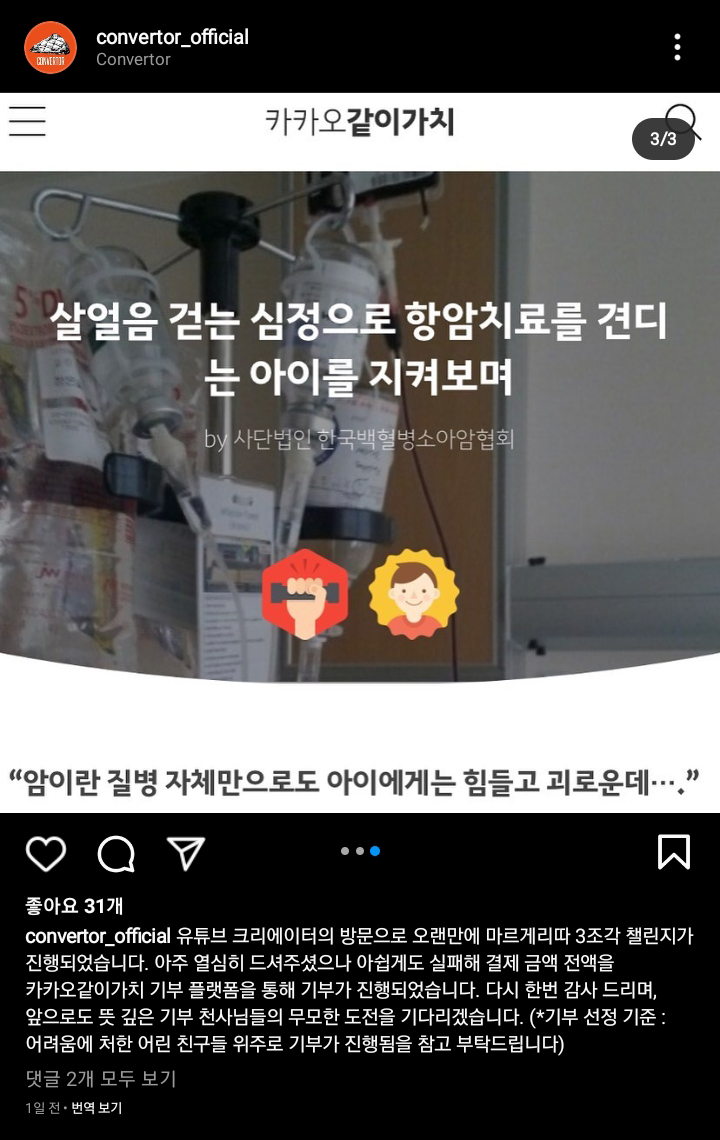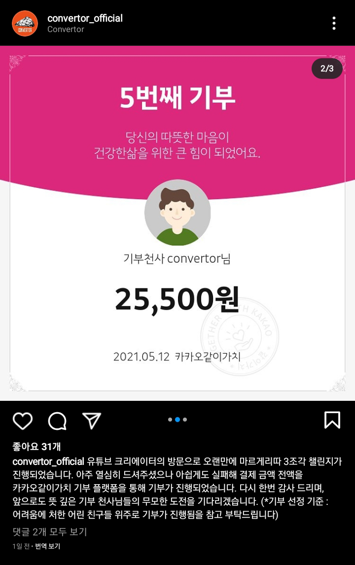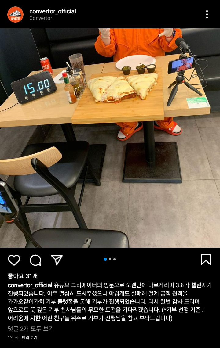 그래도 제가 도전한 컨버터 3조각 챌린지로 발생한 참가비용 25,500원은 소아암으로 항암치료를 받는 아이에게 기부가 되었다고 합니다. 비록 제 도전은 실패하였지만, 뜻깊은 일에 사용되었다고 하니 마음 한 켠이 따뜻해지는 것 같아 좋았습니다. 다음에는 제대로 피자맛을 즐기러 한 번 다시 찾아가 봐야겠고요, 이상 글 줄입니다.