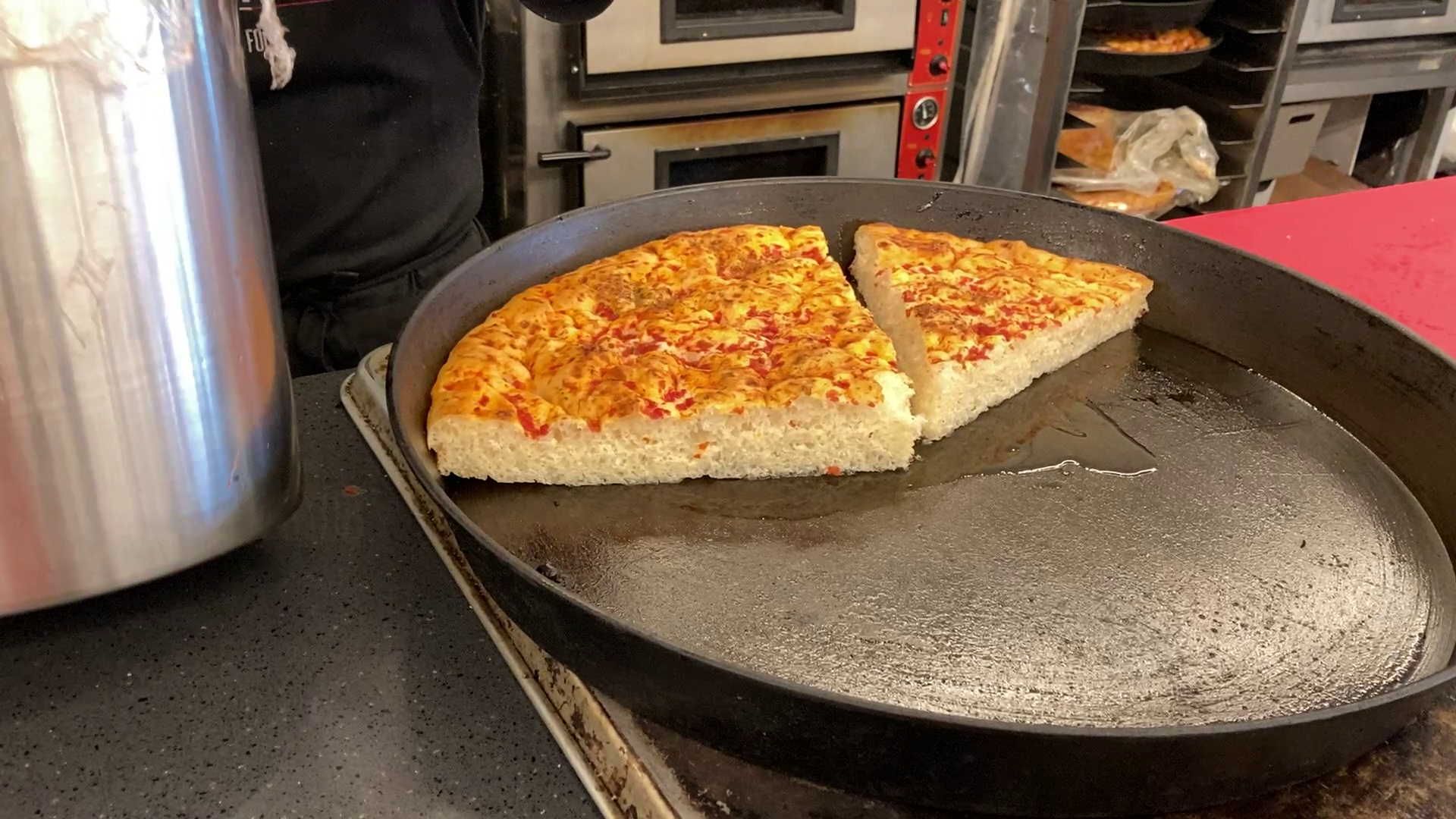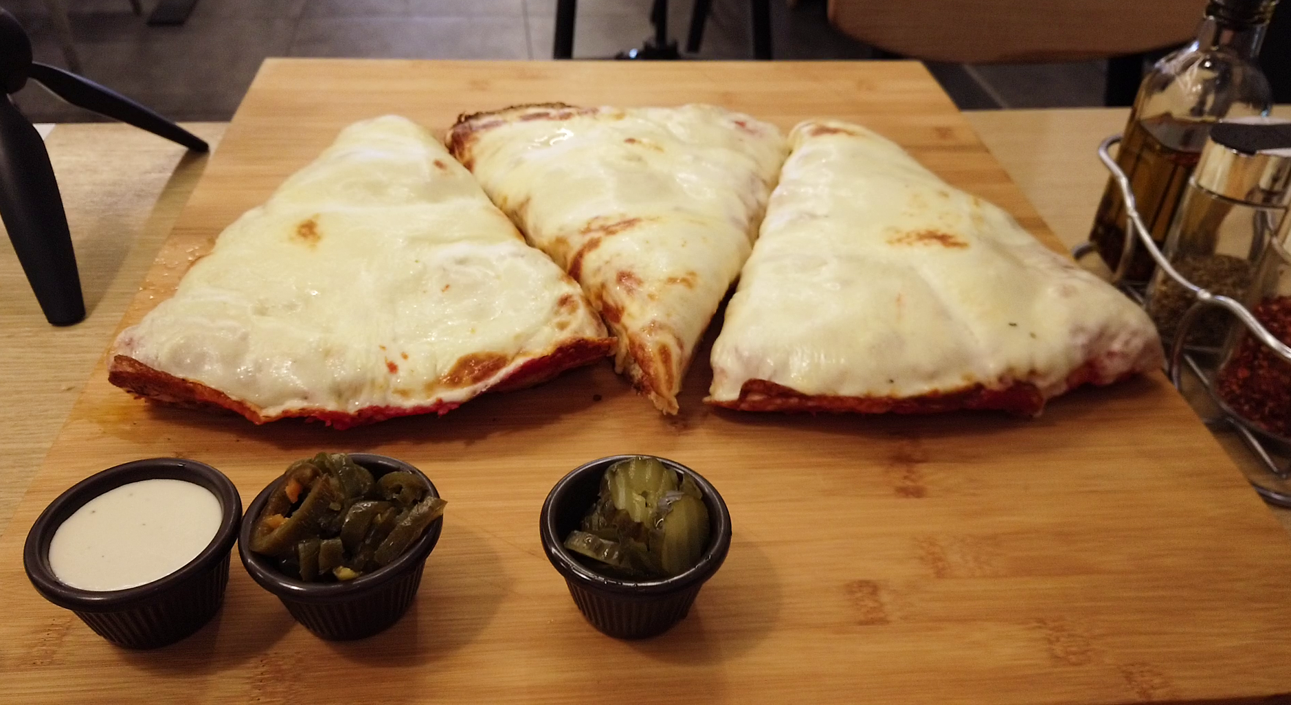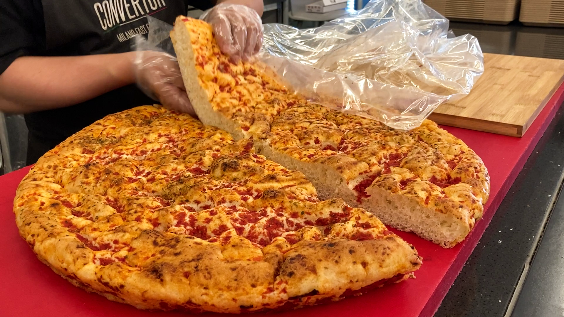 제가 피자 3조각 챌린지에 도전하니 가게의 점원분들이 피자를 준비해주셨는데, 컨버터 피자의 밑바탕이 되는 포카치아 빵의 크기가, 널찍한 방석만 하더라고요. 도전을 하기로 했는데 "과연 다 먹을 수 있을까", "8조각 시켰으면 큰일 났겠다"라는 생각이 들더라고요.