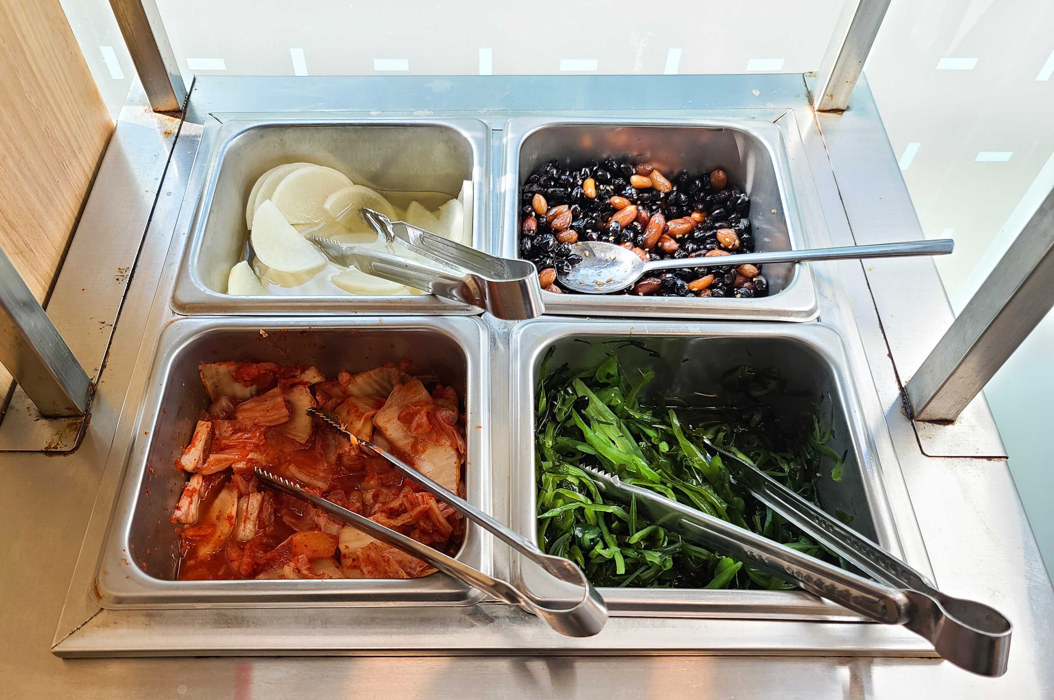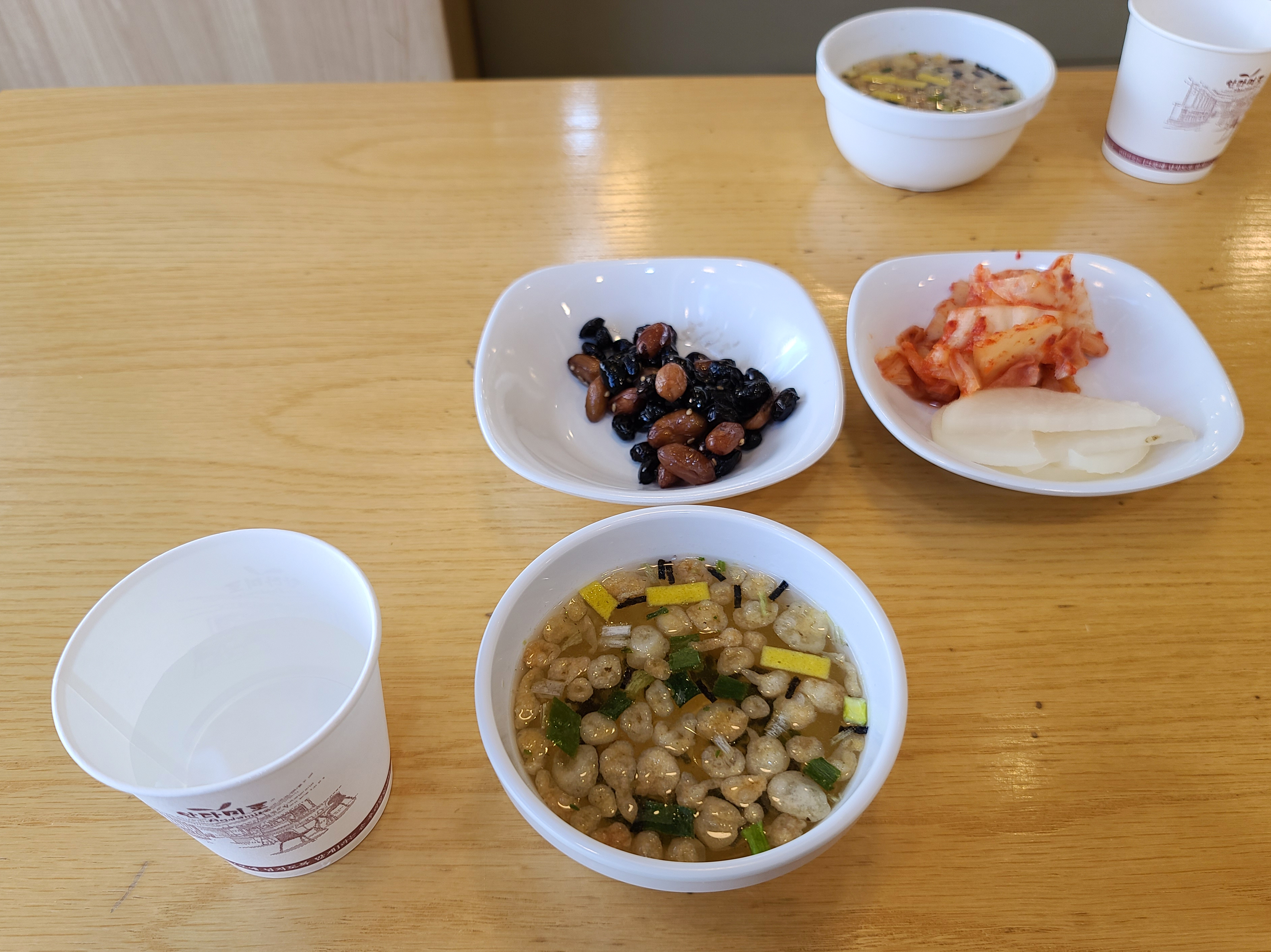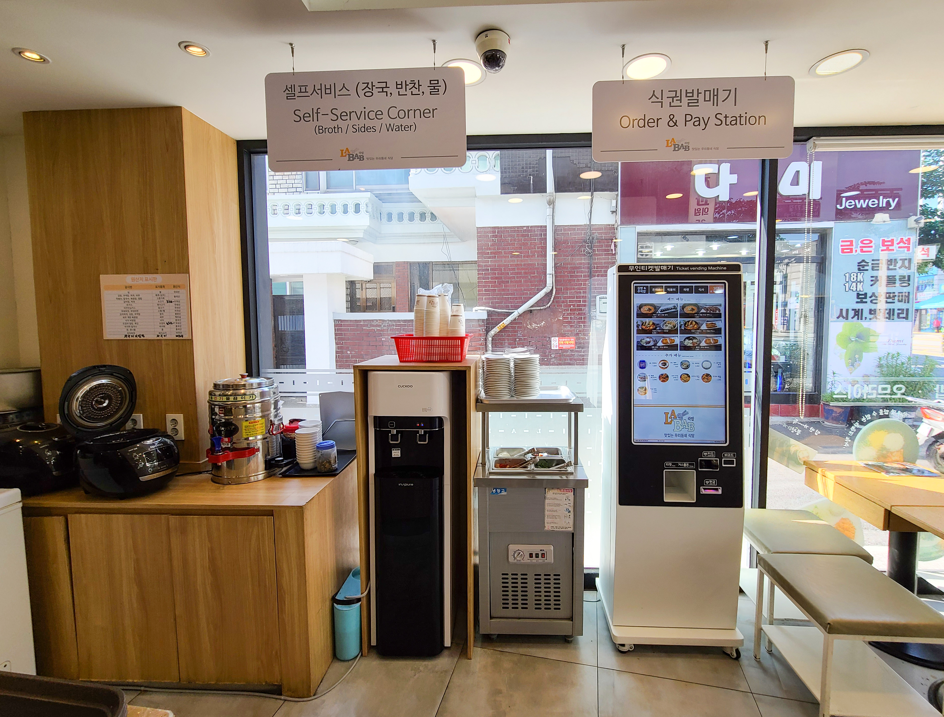 주문은 키오스크를 통해 할 수 있었습니다. 그밖에 밑반찬은 반찬냉장고에서 직접 가져다 먹을 수 있었습니다. 반찬은 콩자반이랑 배추김치, 단무지 그리고 장국이 있었는데, 장국을 직접 담아오니 식어서 맛이 별로 없더라고요.