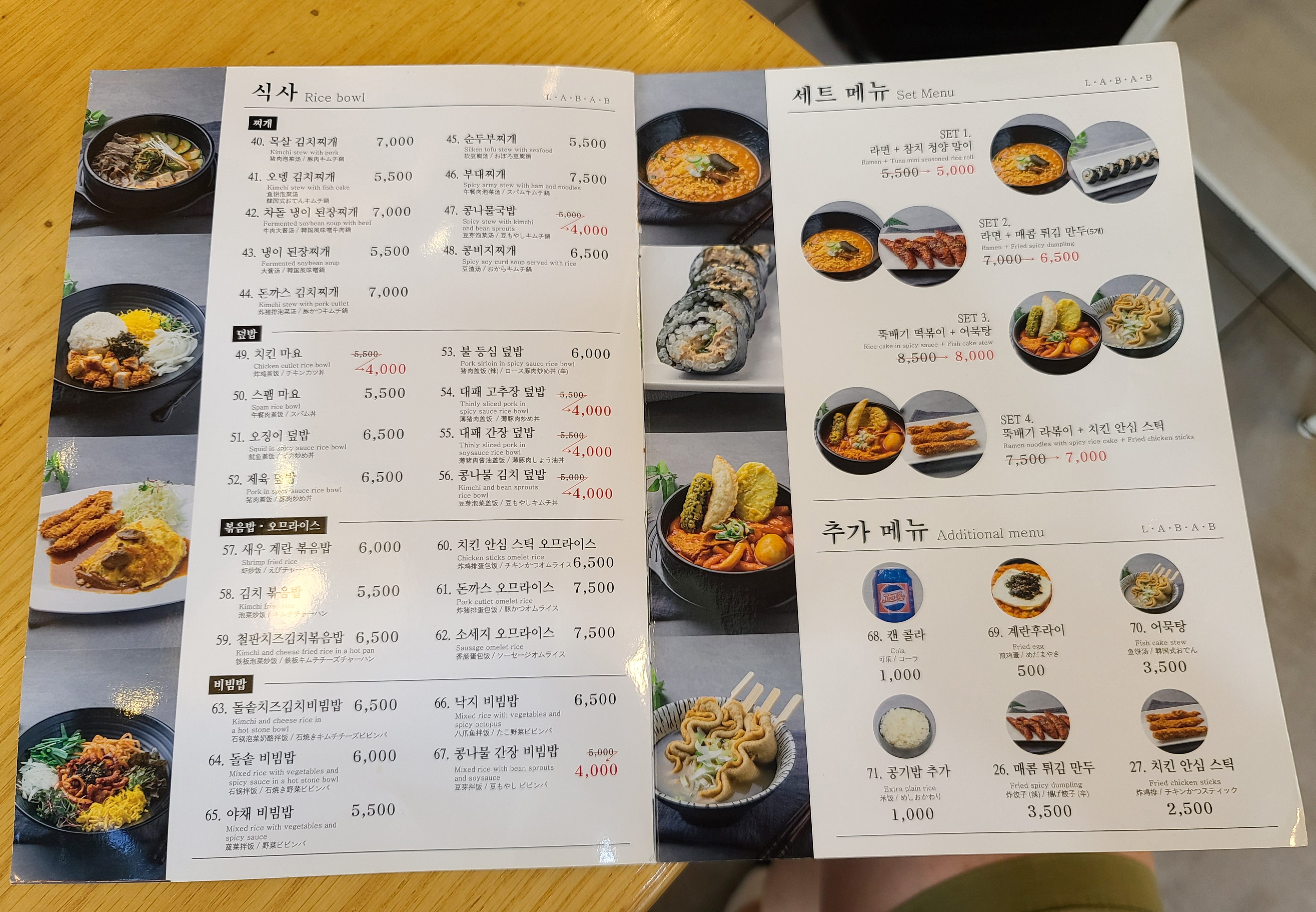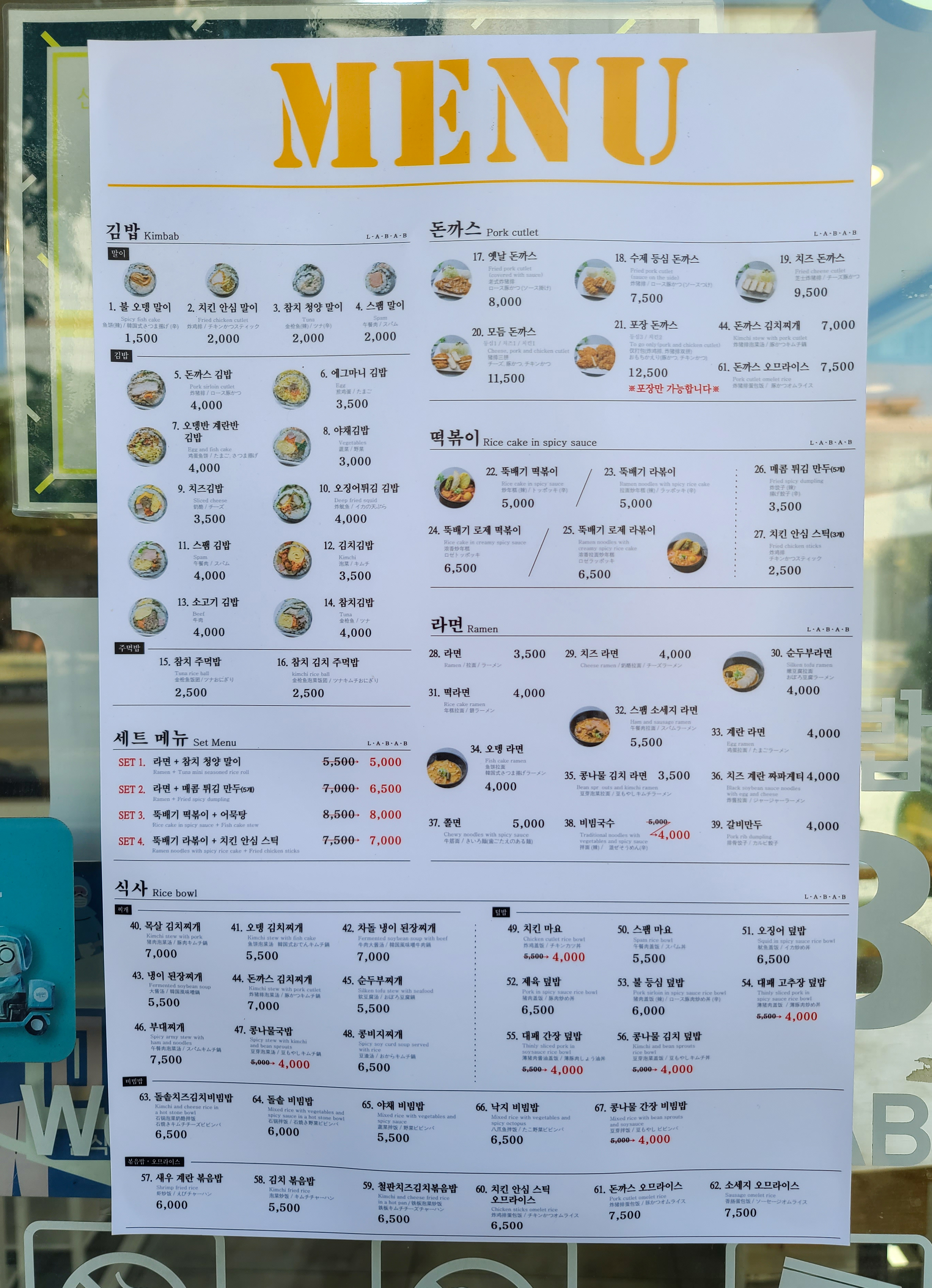 라밥의 메뉴는 김밥과 주먹밥, 돈까스, 떡볶이, 라면, 찌개, 덮밥, 볶음밥・오므라이스, 비빔밥 등을 판매하고 있었습니다. 저는 이 가게의 돈까스와 쫄면을 같이 판매하는 세트메뉴를 주문하였습니다.
