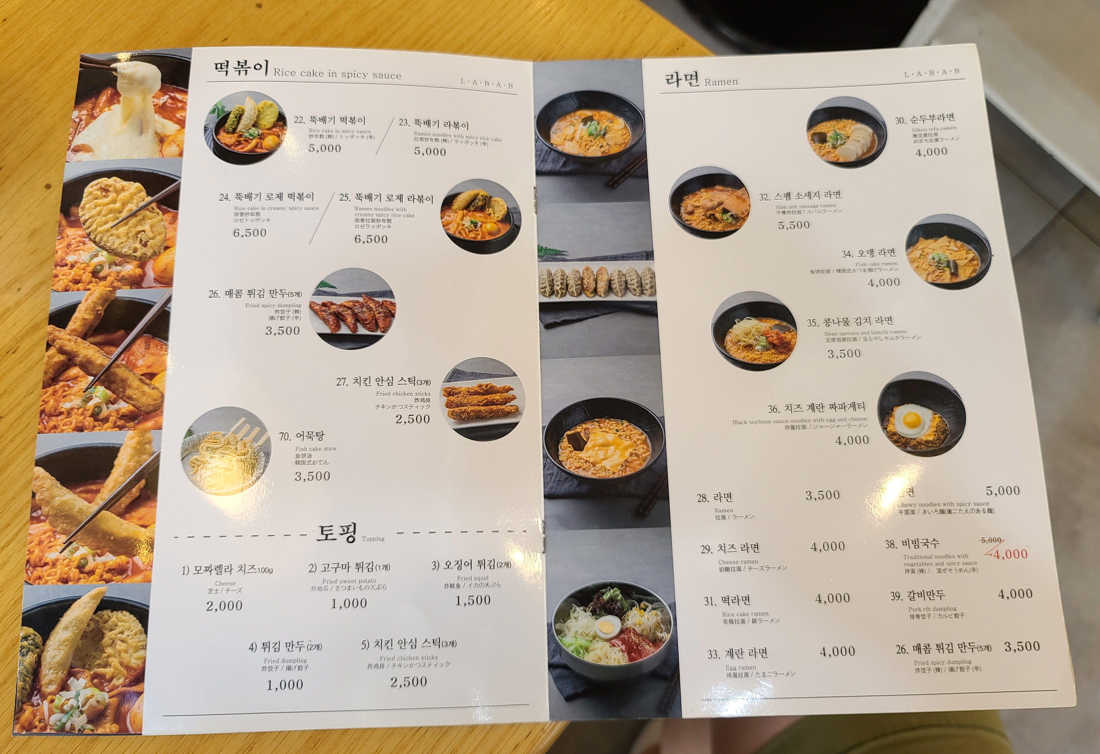 신대방역 인근의 분식집 프랜차이즈 라밥의 모습은 위와 같습니다. 길거리에 위치해 있어서 인접성이 좋았고, 일단 제가 원하는 매콤한 메뉴도 판매하고 있었습니다. 방명록을 작성하고 식사할 자리를 잡았습니다.