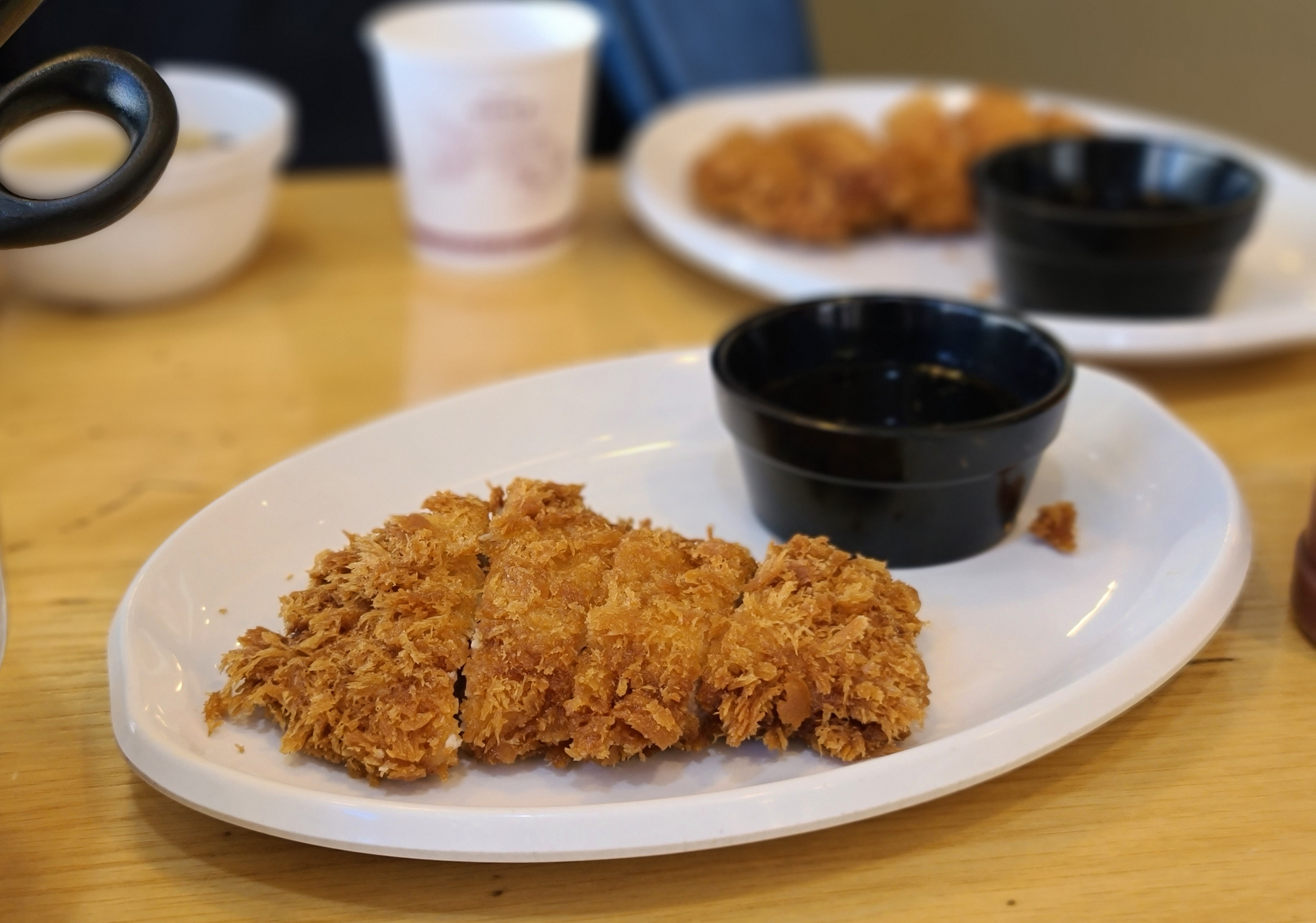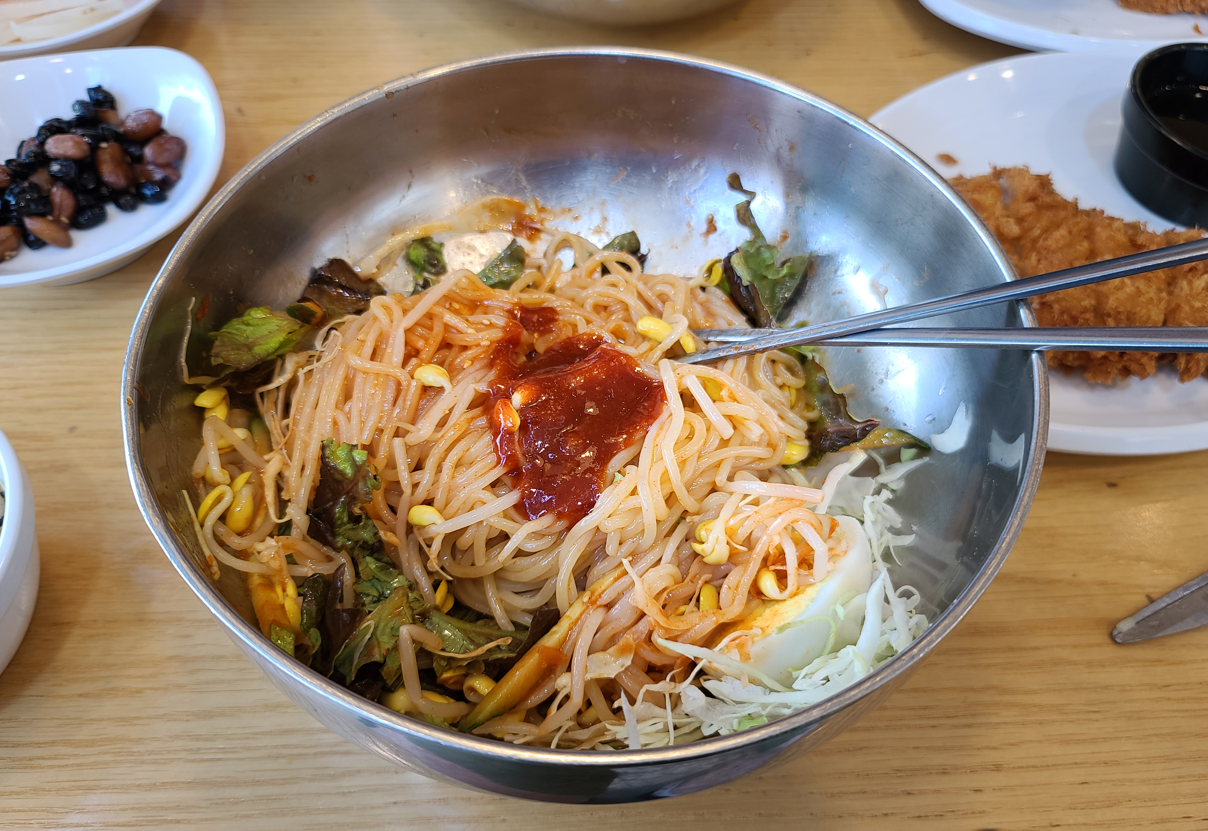 곧이어 주문한 돈까스와 쫄면 세트가 나왔습니다. 쫄면은 양이 적당했는데, 돈까스는 세트 구성의 메뉴여서 그런지 조금 작은 느낌이 있더라고요. 그래도 제가 생각했던 매콤 새콤한 쫄면이랑 곁들이는 메뉴로 돈까스 까지 먹으니 나름 만족스럽게 식사할 수 있었습니다.