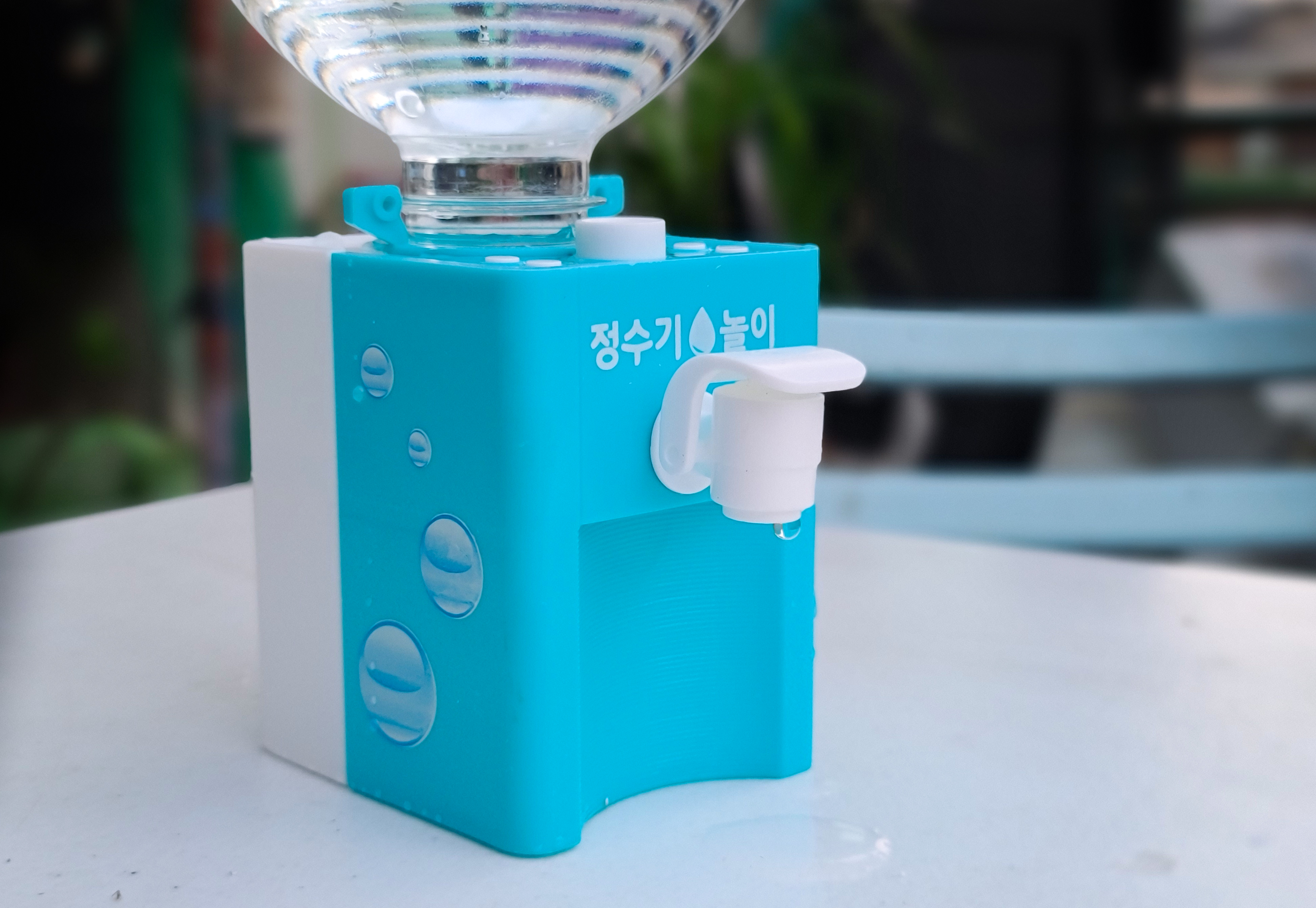 완구의 만듦새가 완벽하지는 않아서 액체류를 실제로 담아보니 한 방울씩 새는 게 있었지만, 그래도 나름의 재미는 있었습니다. 정수기 상단에는 온수, 냉수 조절 버튼과 온도조절기 정수 버튼과 세척 버튼까지 있는 나름의 최신 기술(?)의 집약체였습니다. 정수기의 물통은 다양한 페트병과 호환이 가능하여, 소주병 혹은 집에 있는 실제 생수통과도 체결이 가능했습니다.