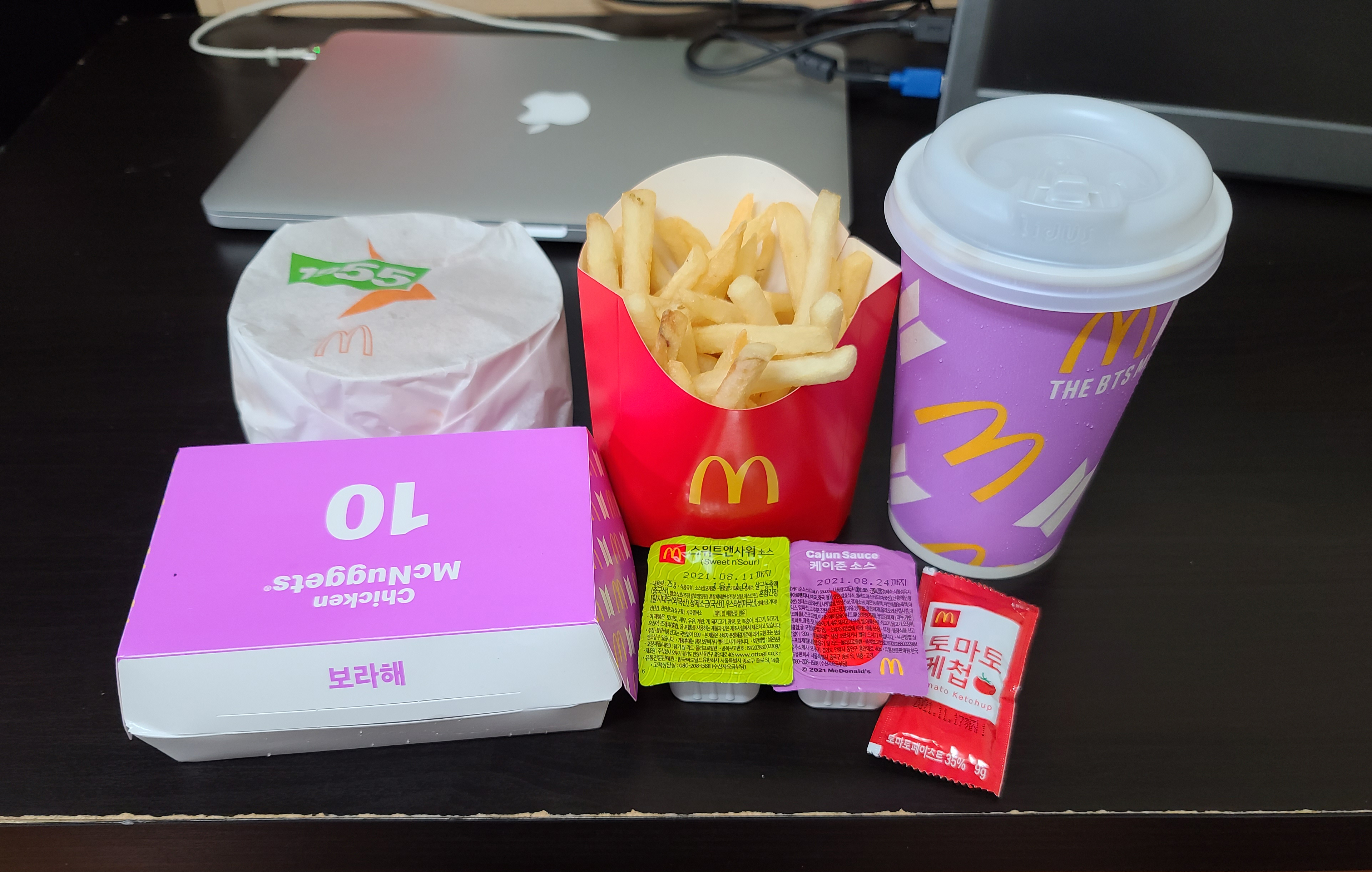 BTS 세트의 구성을 살펴보면 우선 BTS 와 맥도날드의 콜라보 패키지가 돋보입니다. 연보라색 패키지로 된 세트는 감자튀김과 맥너겟 10조각, 콜라, 스위트 칠리소스, 케이준 소스로 구성되어 있습니다. 하지만 저는 맥너겟 하면 스위트 칠리소스보다 스위트앤 사워 소스를 더 선호하기 때문에 변경하여 주문했습니다.