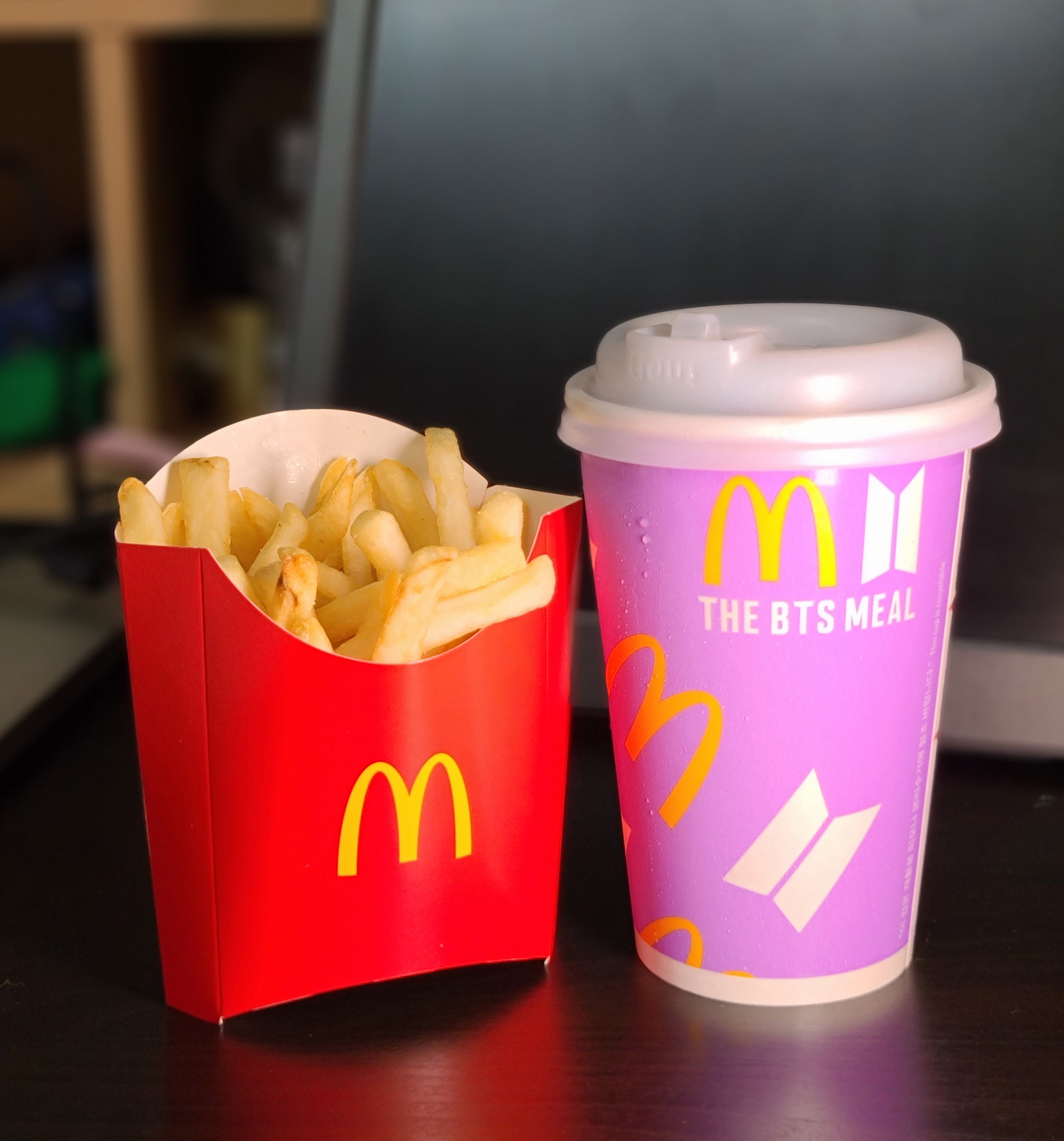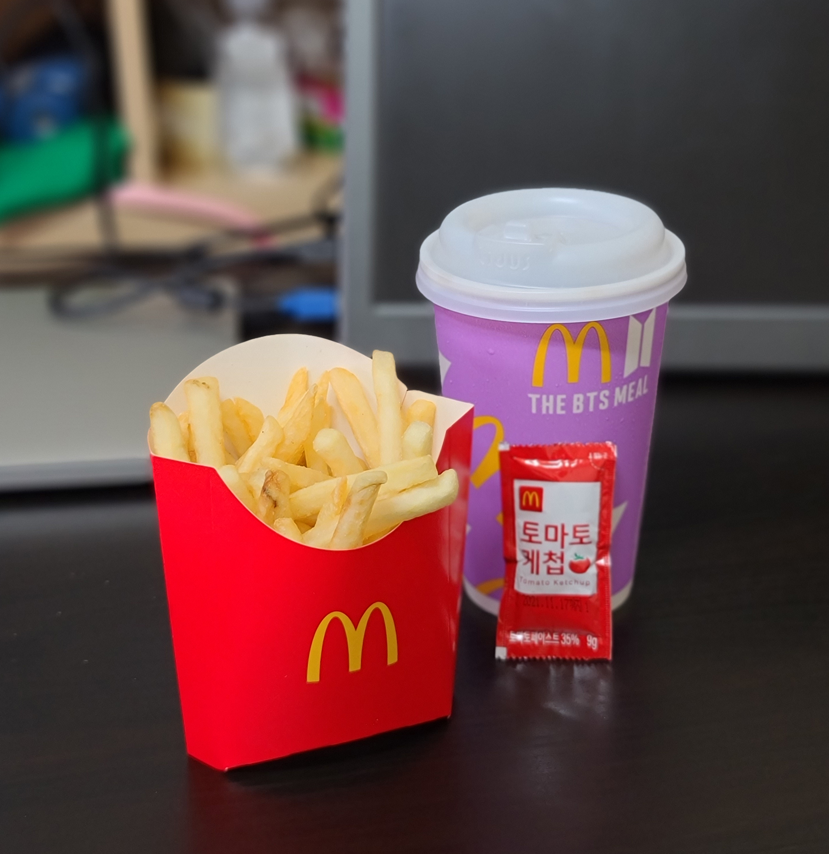 그밖에 감자튀김과 콜라는 우리가 "흔히 아는 그 맛" 이라고 하죠. 맥도날드 특유의 짭짤한 감자튀김과 BTS 콜라보 패키지가 돋보이는 콜라가 BTS 세트의 구성으로 있었습니다. 아무래도 성인 남성에게 맥너겟 10조각과 감자튀김, 콜라의 구성으로만 이루어진 BTS 세트는 식사를 대체하기에는 조금 부족함이 있고요, 대신 이 세트에 햄버거를 단품으로 추가한다면 맥너겟과 감자튀김, 햄버거까지 다채롭게 구성하여 식사할 수 있게 되니 기간 내 한 번쯤 도전해보시는 것을 추천드립니다.