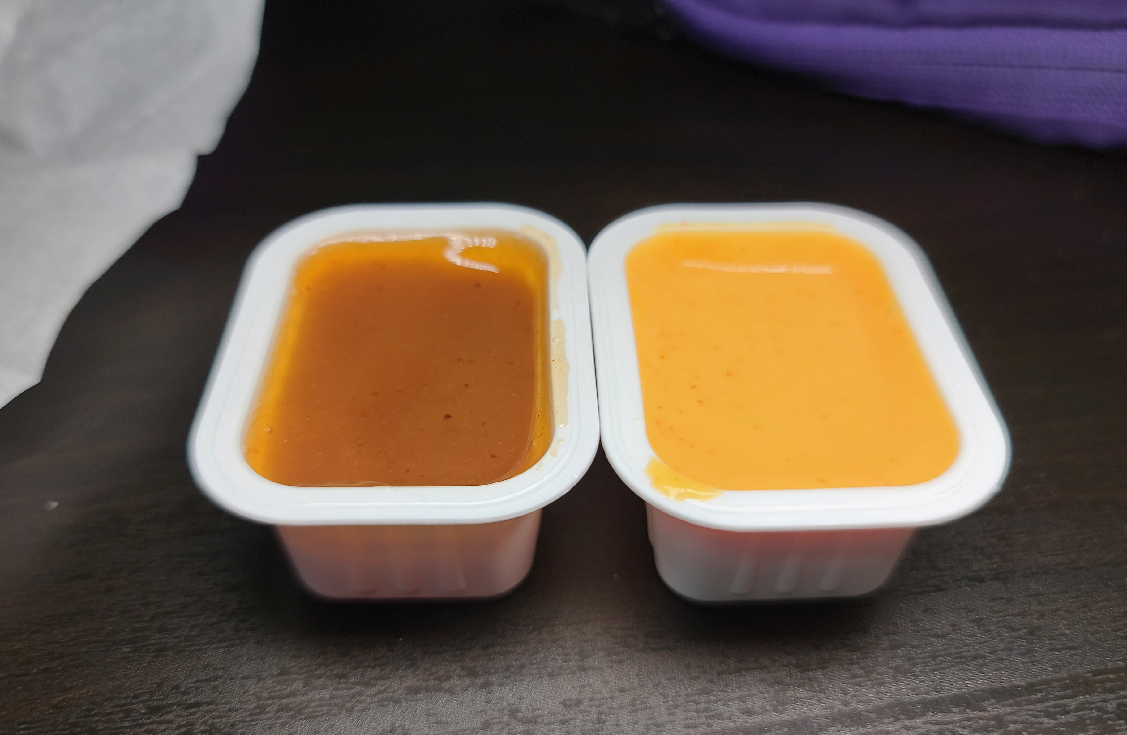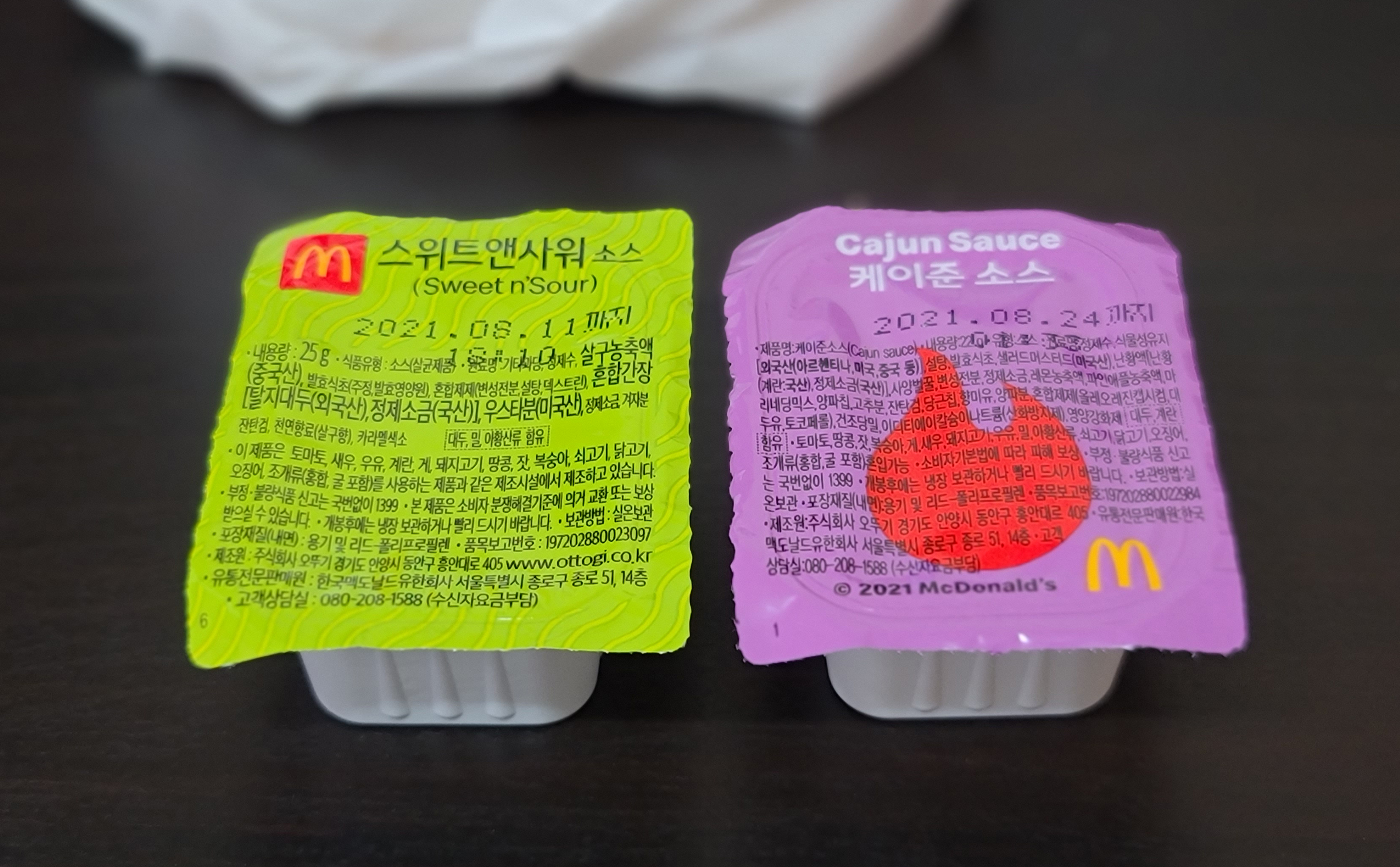 맥도날드 '스위트앤 사워 소스'와 '케이준 소스'의 모습입니다. 스위트앤 사워 소스는 새콤달콤한 소스로 개인적으로 감자튀김을 찍어먹어도 잘 어울리는 소스라고 생각합니다. 케이준 소스는 매콤한 게 특징인 소스인데, 맥너겟과 같이 치킨 종류에 잘 어울리는 소스였습니다.