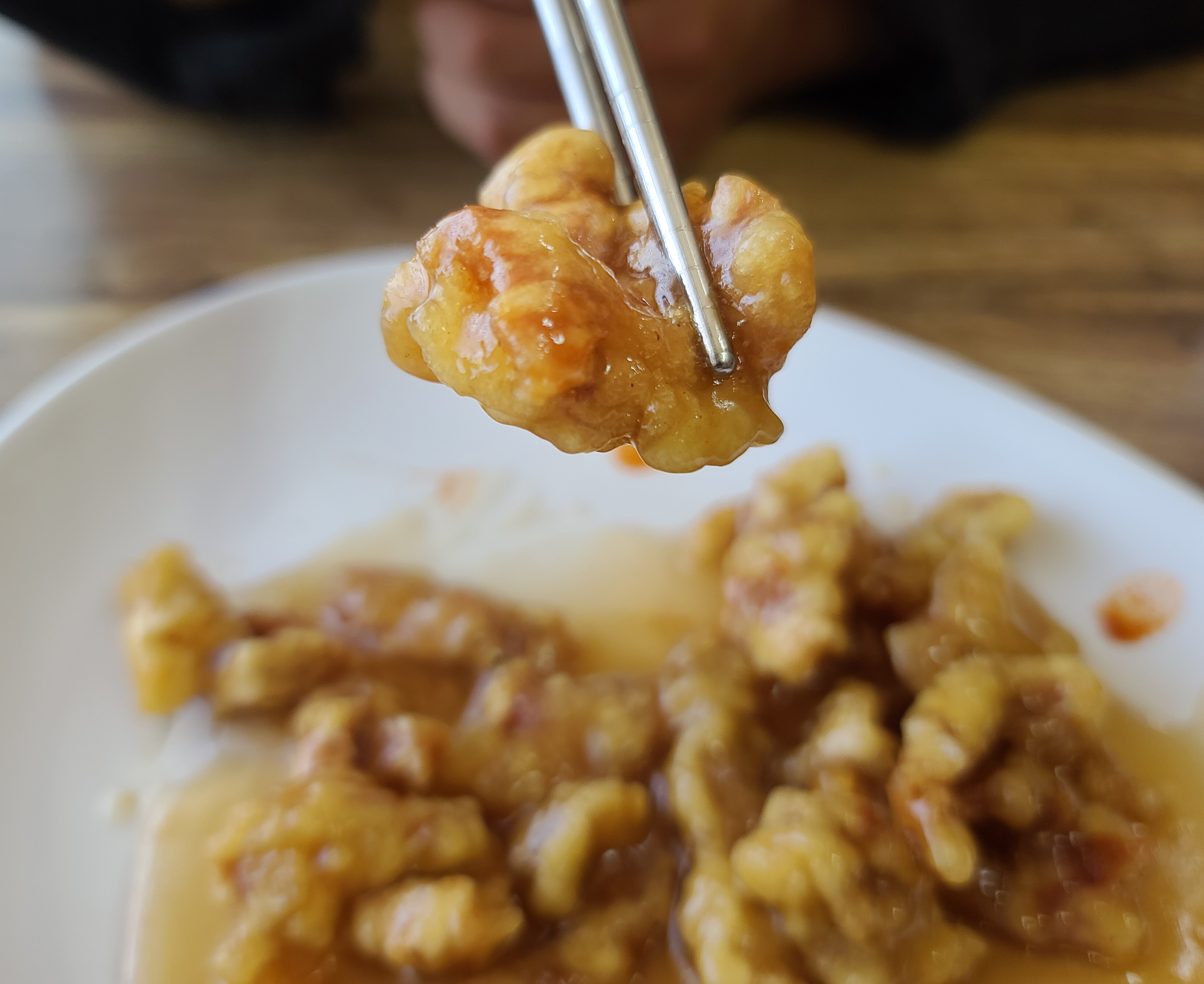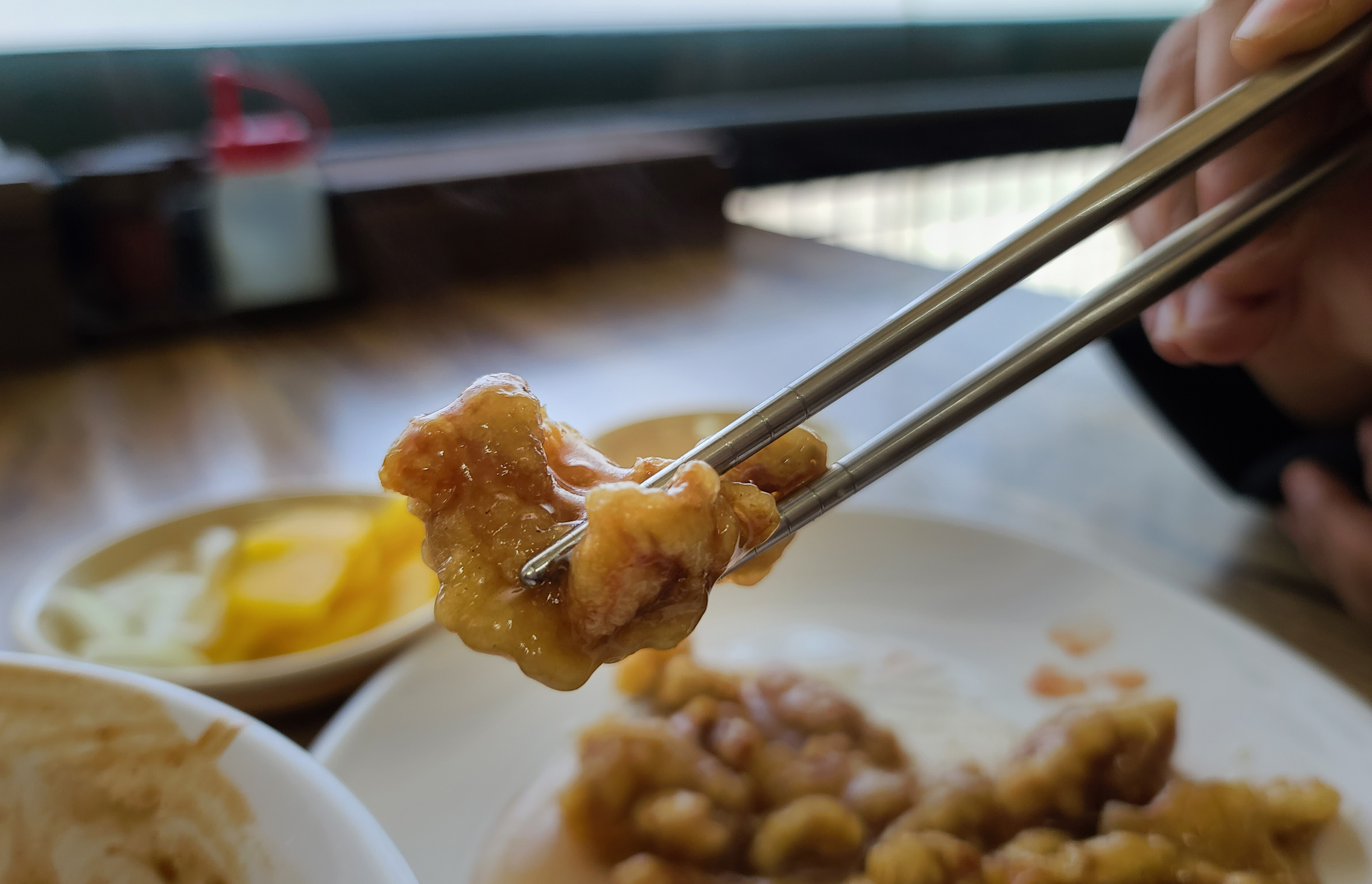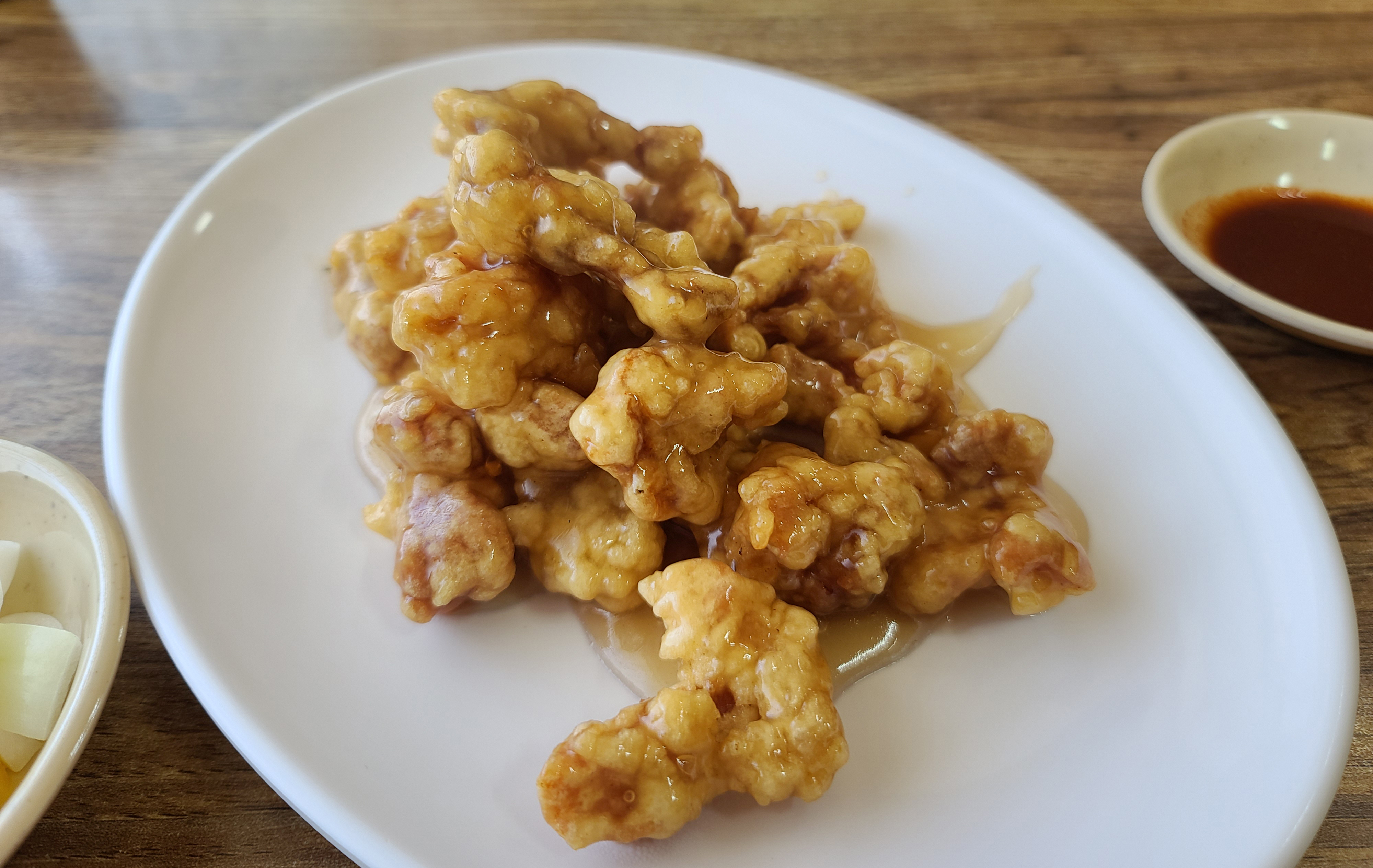짜장면을 먹고 있는 동안 탕수육이 나왔습니다. 탕수육은 일반 중국집 탕수육의 맛과 동일했는데, 다만 특별한 점이 있다면 탕수육에 흔히 들어가는 목이버섯이나 오이, 당근 등의 채소가 빠져있다는 점이었습니다. 하지만 저는 오히려 이렇게 나오는 게 좋았는데, 보통 중식당의 탕수육을 먹으러 가면 같이 나오는 양배추 샐러드나, 오이, 당근, 목이버섯은 거의 손도 안대는데 그런 재료들을 줄이고 탕수육의 고기만 튀겨서 저렴한 가격에 판매하시니 더 만족스럽게 이용할 수 있었습니다.