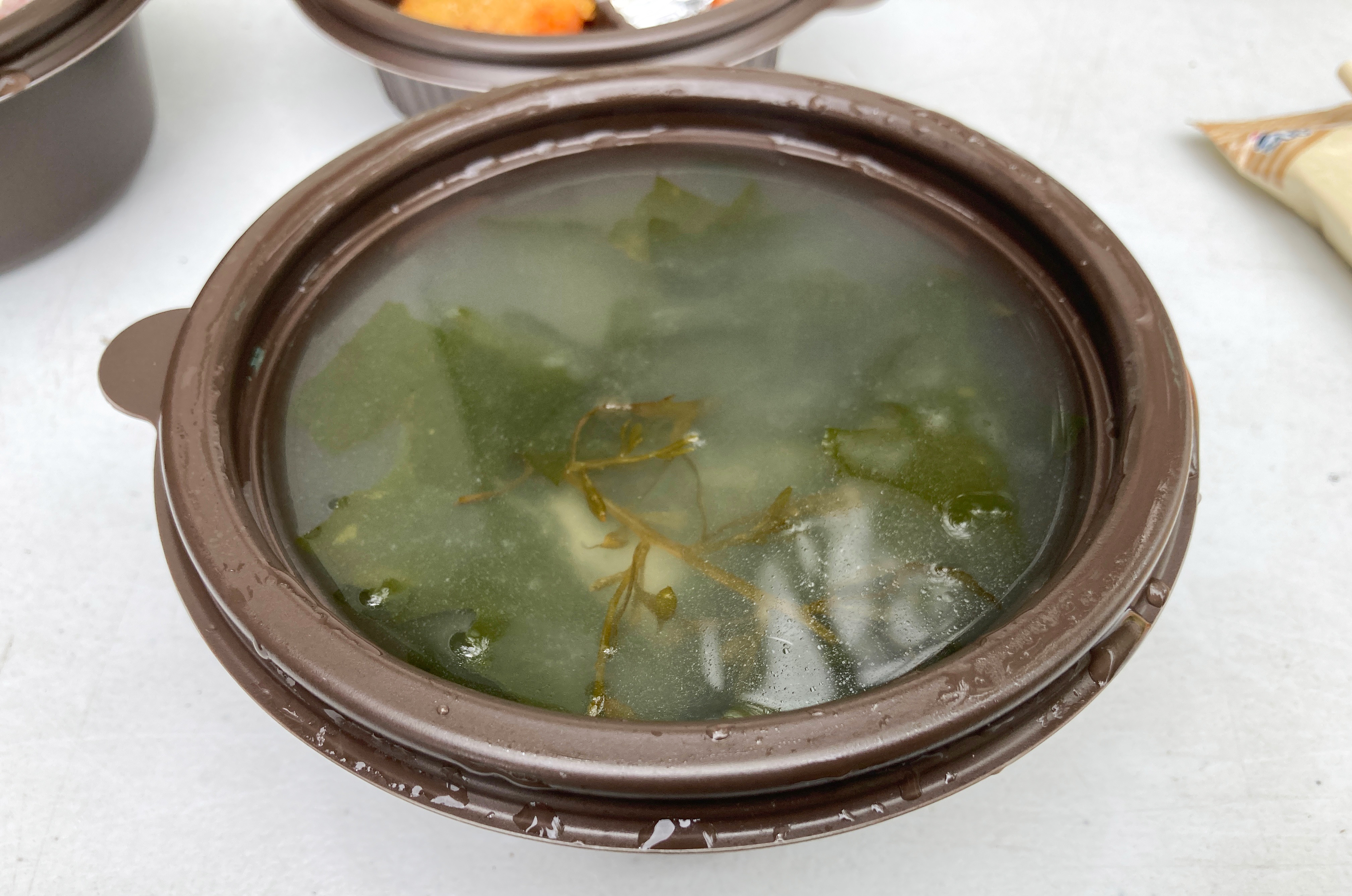 다시 본론으로 돌아와서 본도시락의 제주 모자반 미역국의 구성은 제주 모자반이 들어간 미역국과 바싹불고기, 달걀부침과 김치, 튀김이 있었습니다. 의도한 바는 아닌데 찍고 보니 본도시락 홈페이지의 이미지 컷과 비슷한 구도와 구성으로 찍었더라고요.