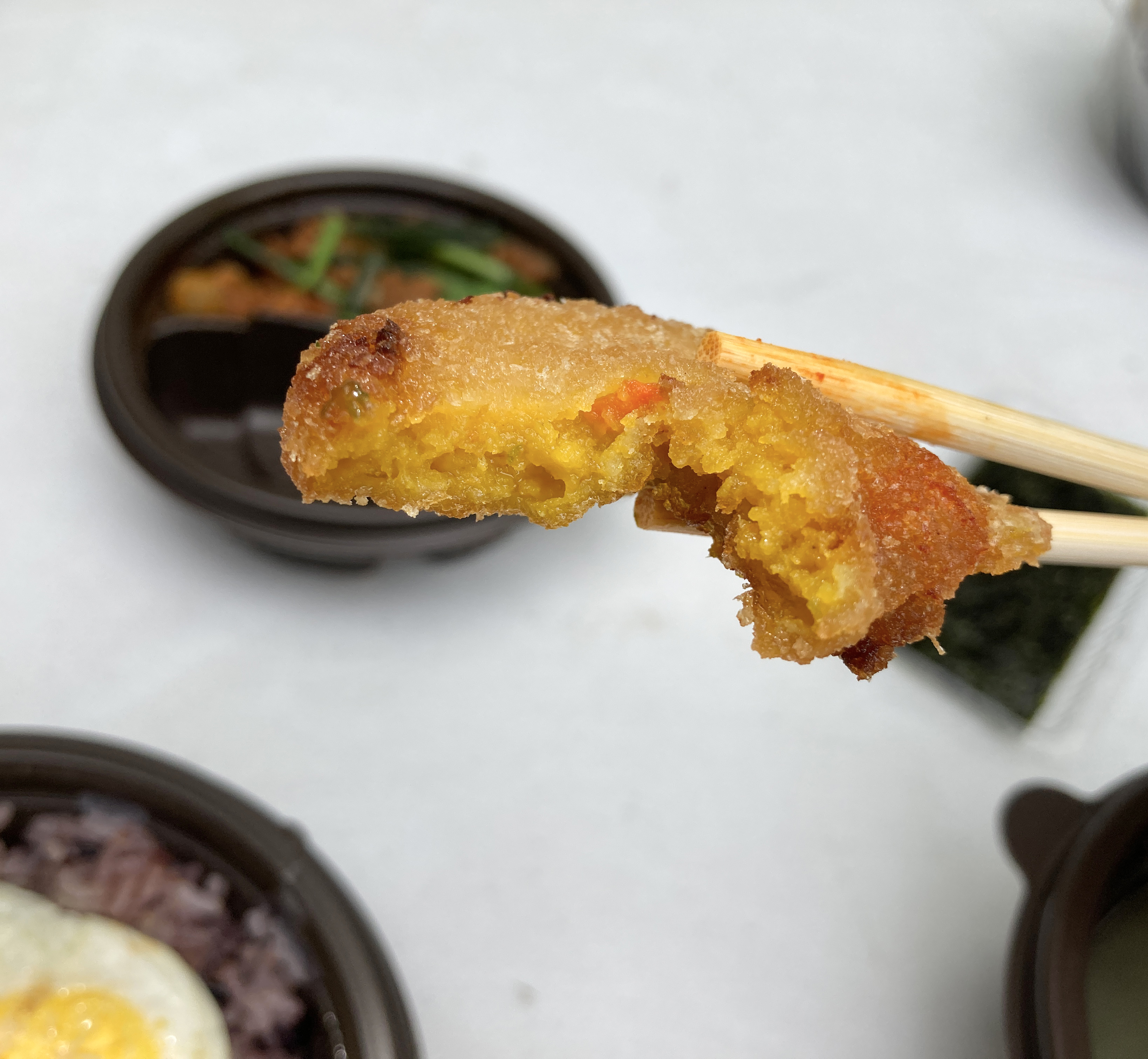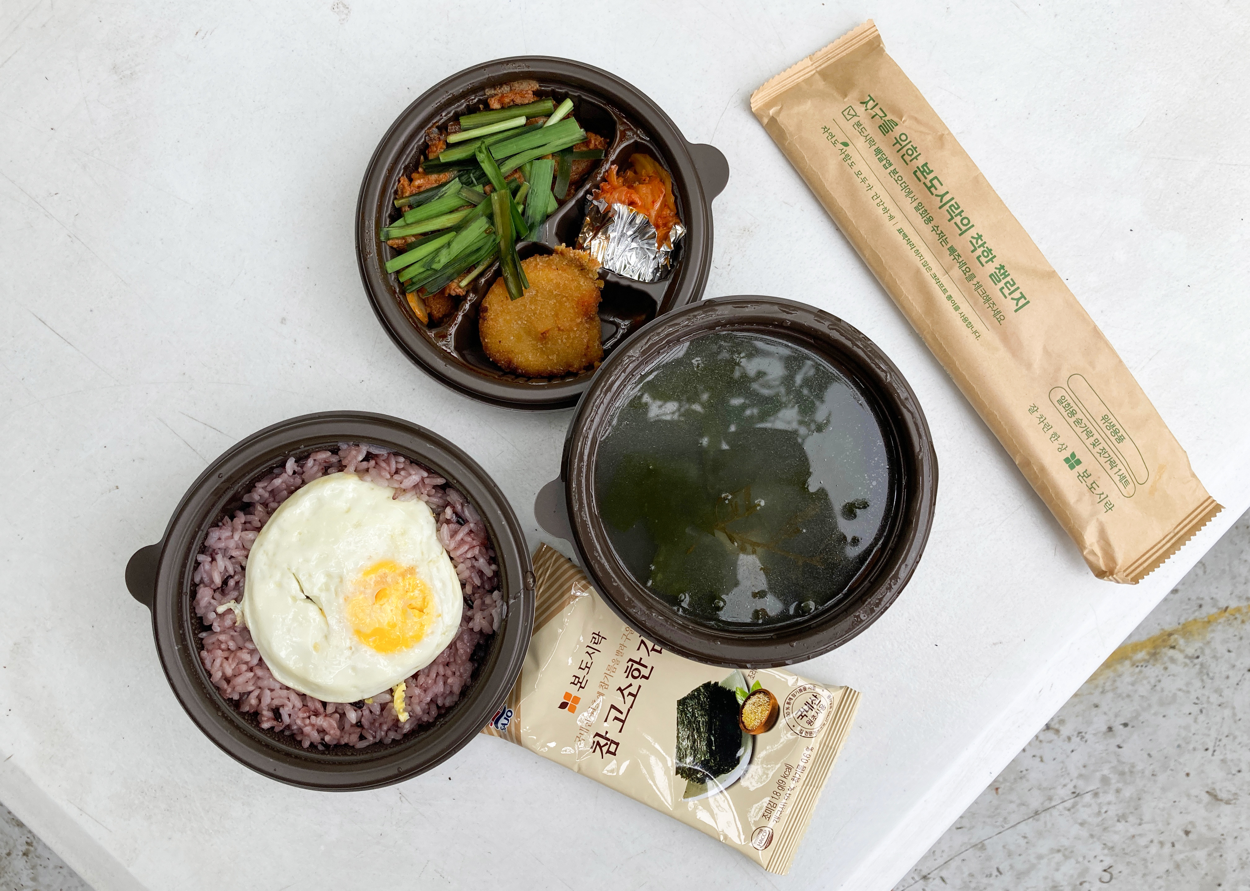 반찬은 고추장 양념의 바싹불고기와 튀김, 볶음 김치, 조미김이 있었습니다. 솔직한 평을 하자면 불고기는 부추와 같이 먹도록 되어있어 맛있었습니다. 그밖에 김이랑 튀김, 볶음 김치는 양도 작고 맛도 별로 없어서 구색 갖추기용이라는 생각이 들더라고요. 그래도 친한 동생 덕분에 오랜만에 아침식사를 하고 하루 일과를 시작했습니다. ("HY아 고마워~♥︎")