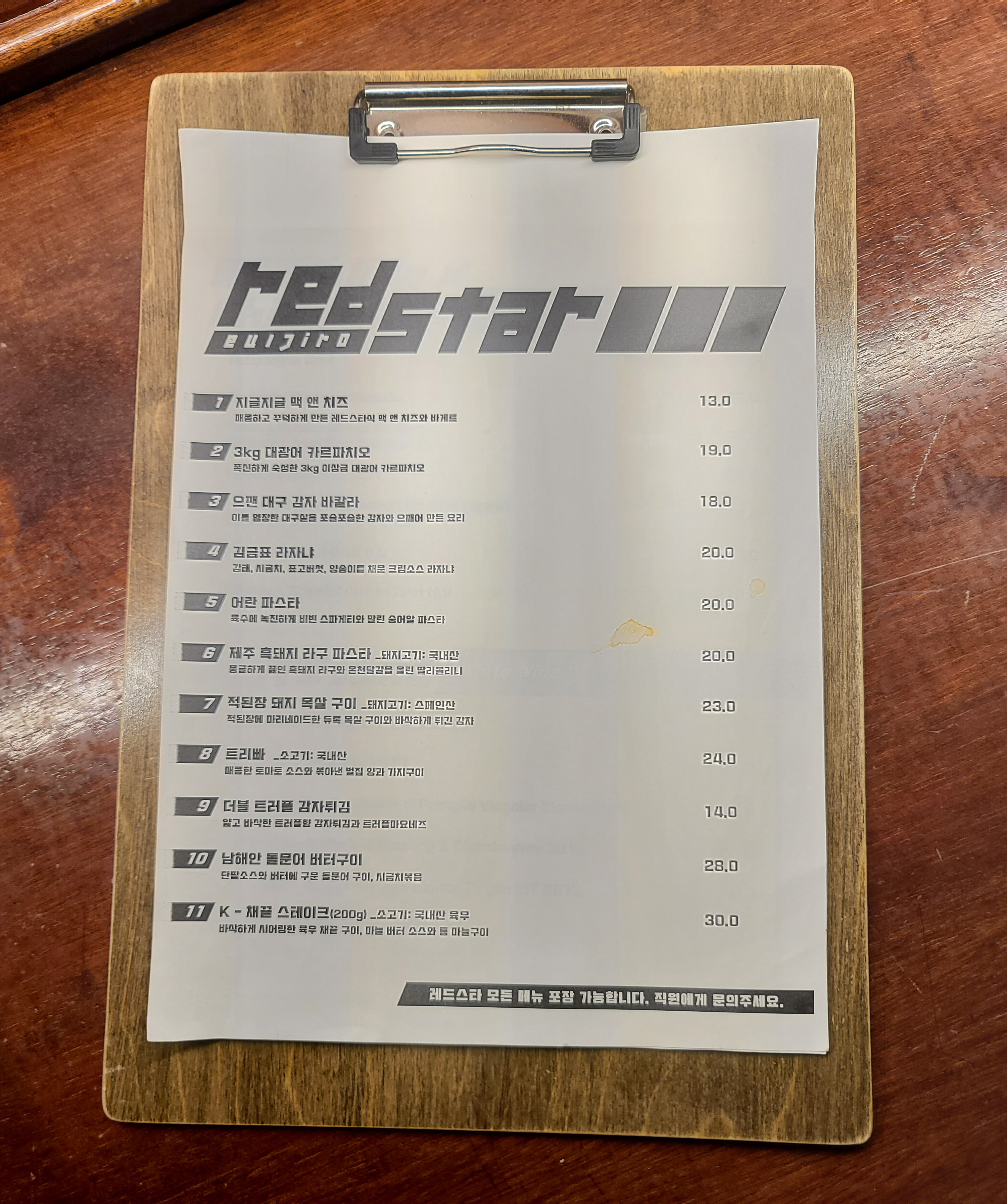 가게의 메뉴는 이렇습니다. 지글지글 맥 앤 치즈, 3kg 대광어 카르파치오, 으깬 대구 감자 바칼라, 김금표 라자냐, 어란 파스타, 제주 흑돼지 라구 파스타, 적 된장 돼지 목살구이, 트리빠, 더블 트러플 감자튀김, 남해안 돌문어 버터구이, K채끝 스테이크 가 있었고, 가격은 13,000~ 30,000원 사이 로 형성되어 있었습니다. 그밖에 스파클링 와인, 샴페인, 화이트 와인, 레드와인, 위스키, 칵테일이 있었습니다.