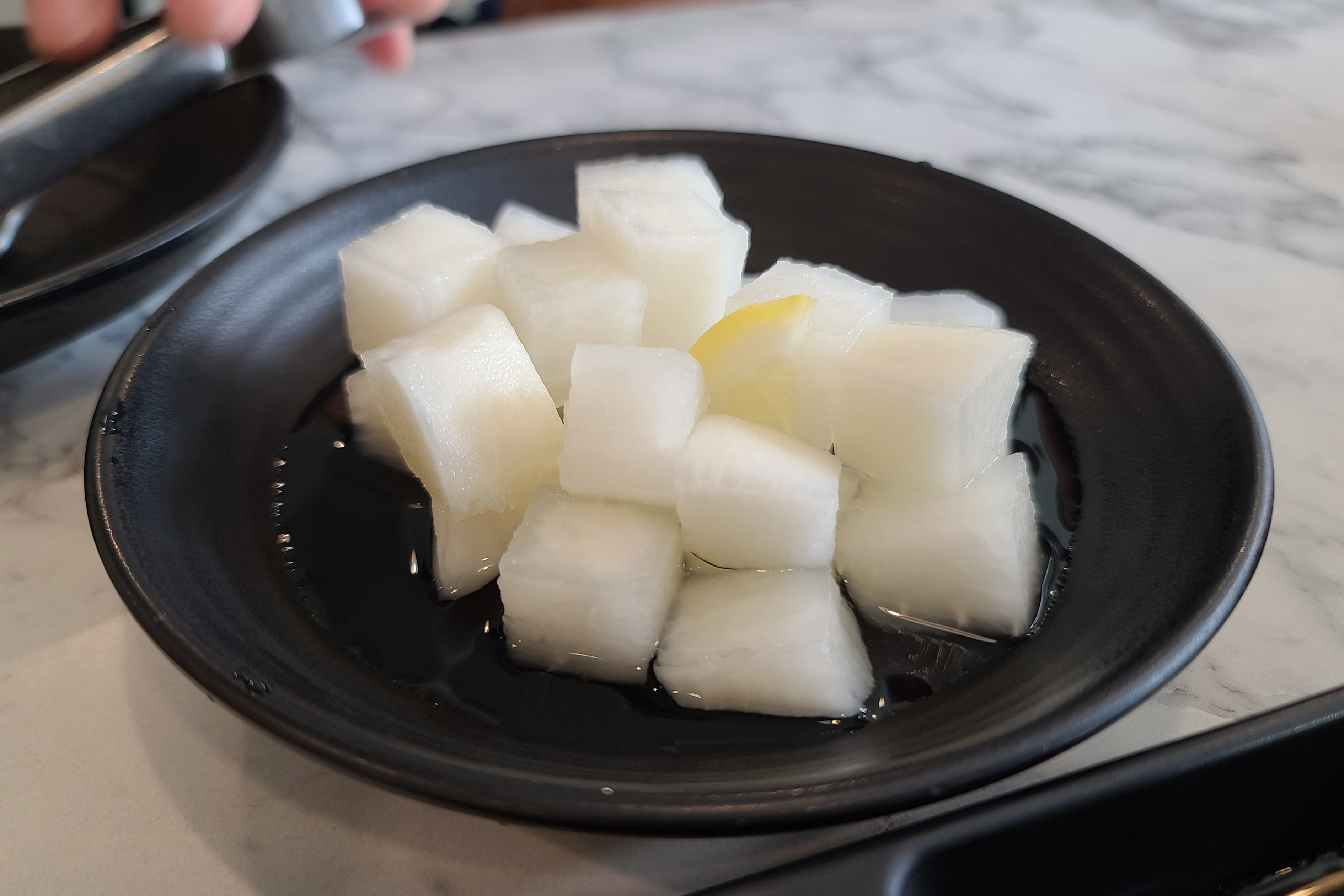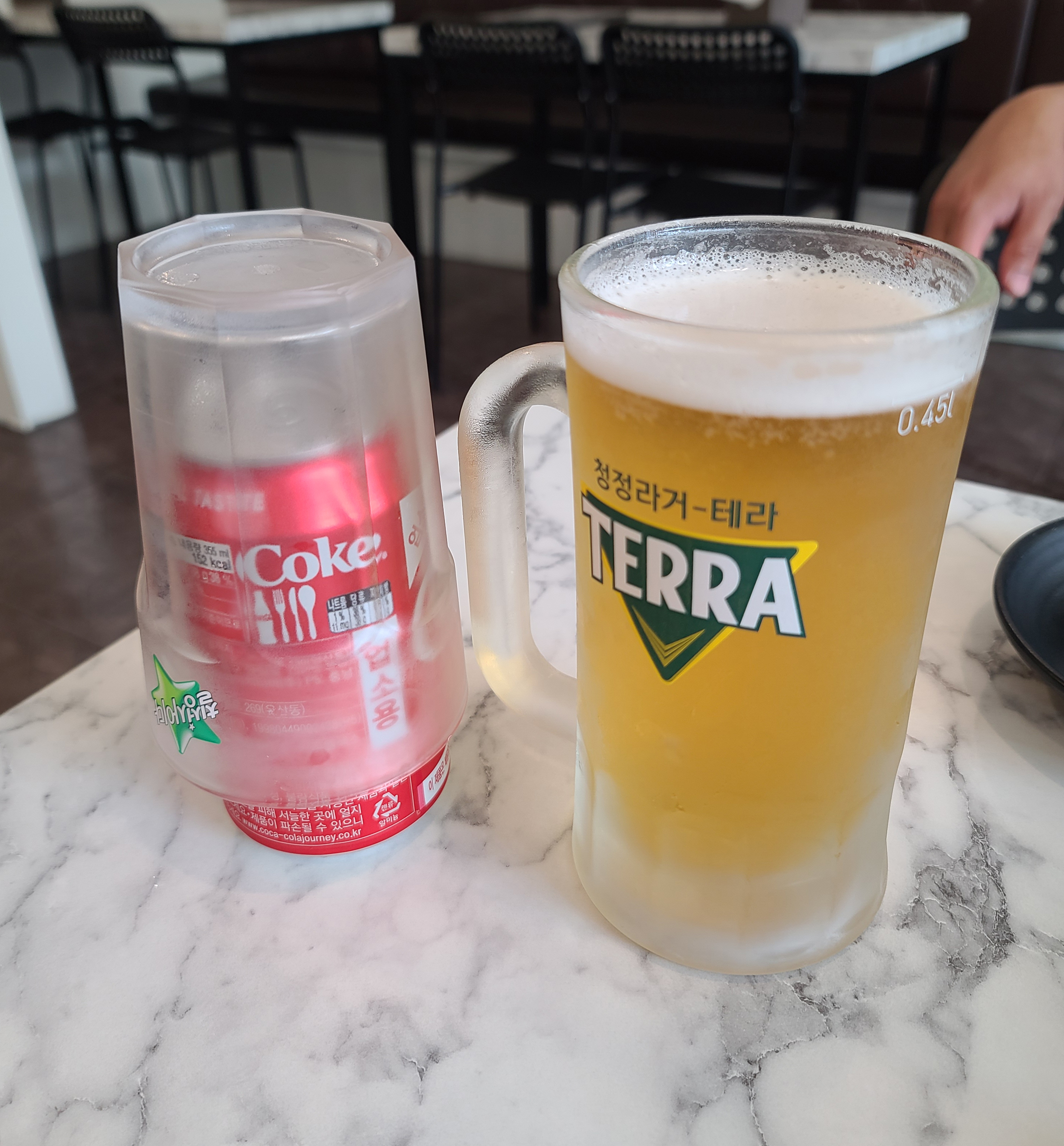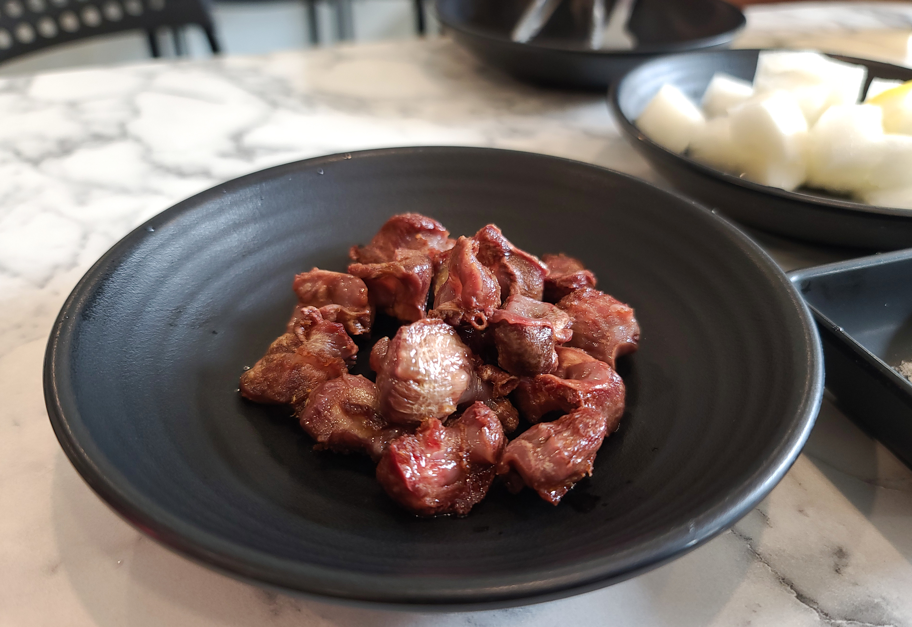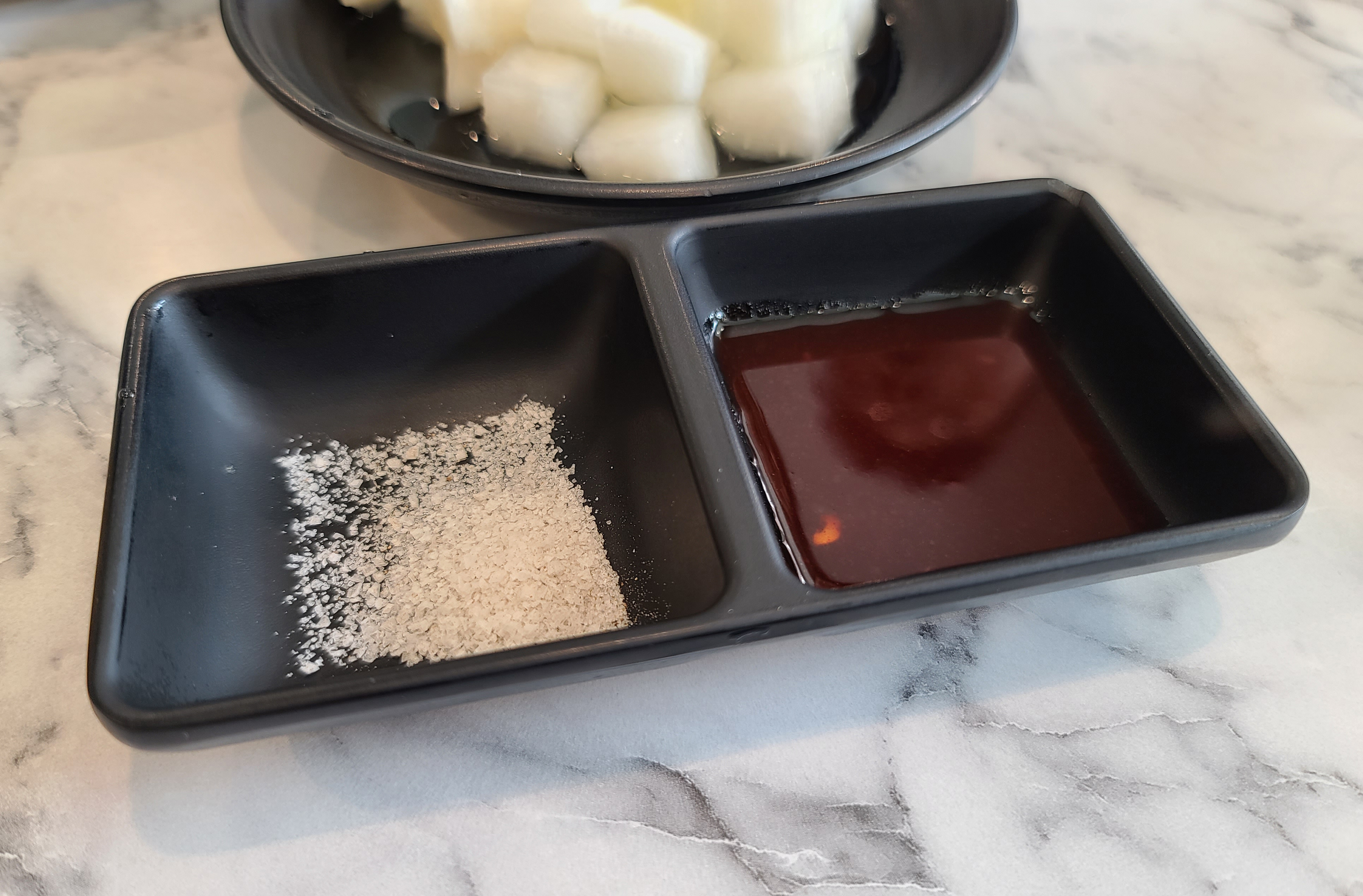 곧이어 주문한 음료수와 함께 닭똥집튀김, 치킨무, 소금, 양념이 나왔습니다. 다가마통닭은 서비스로 항상 닭똥집 튀김을 내어주시는데, 이게 은근 별미입니다. 저는 소금에 찍어먹는 것보다 매콤한 양념에 찍어먹는 게 더 맛있더라고요.