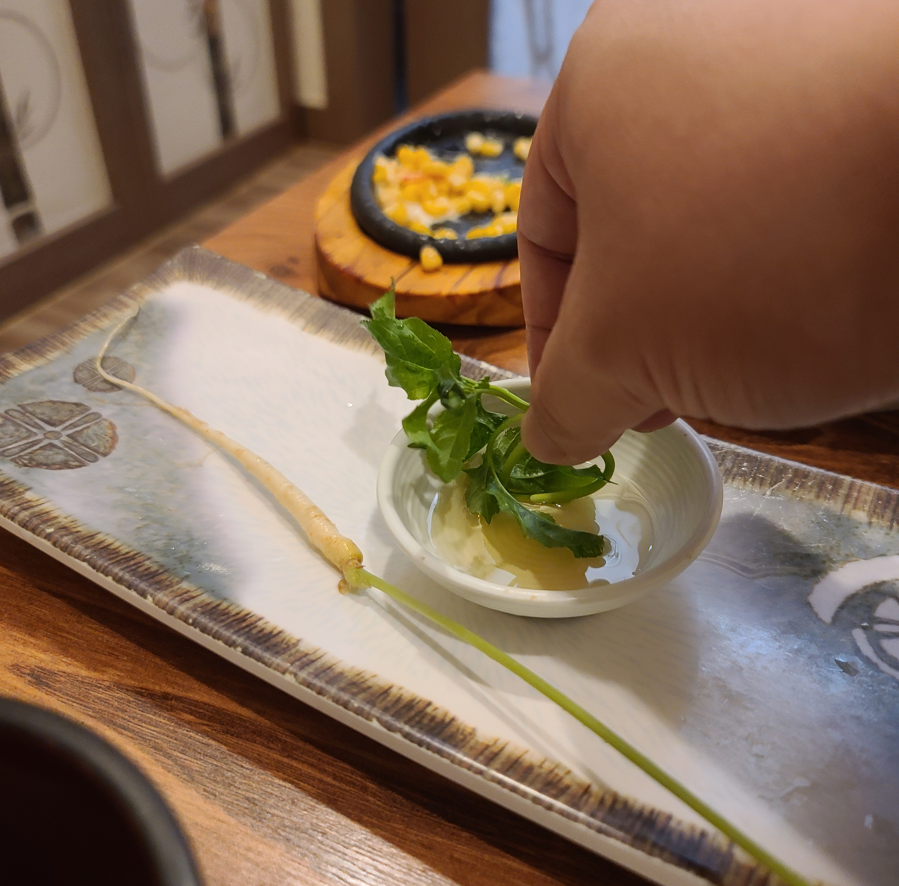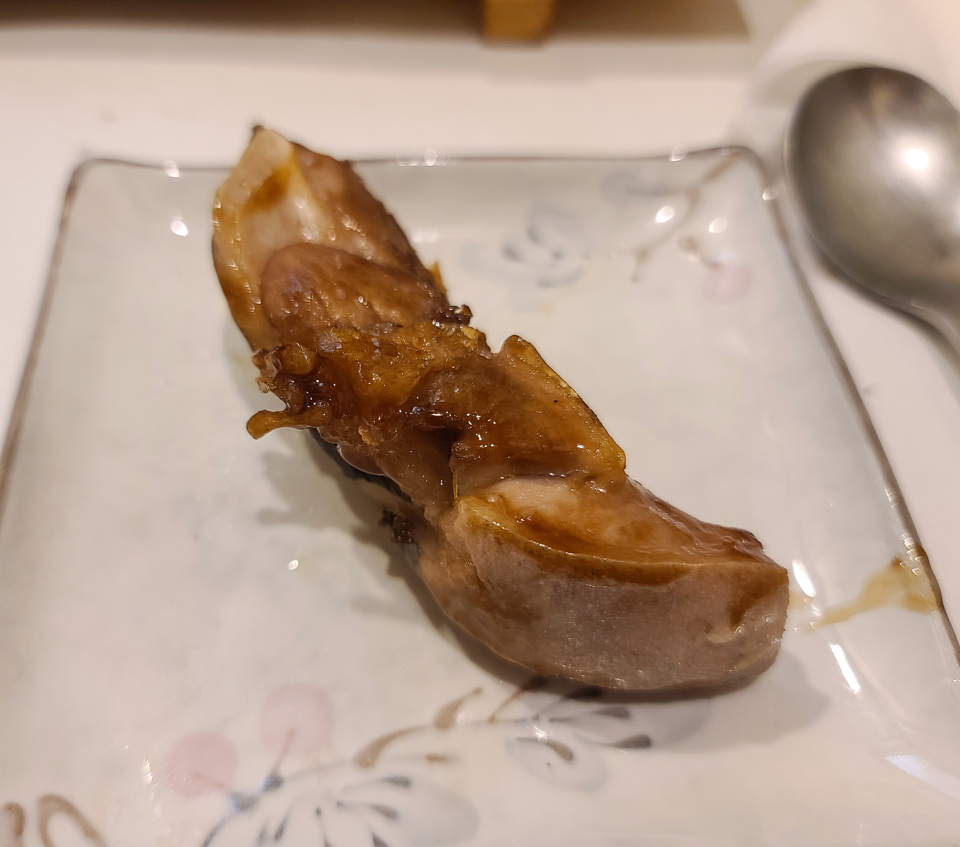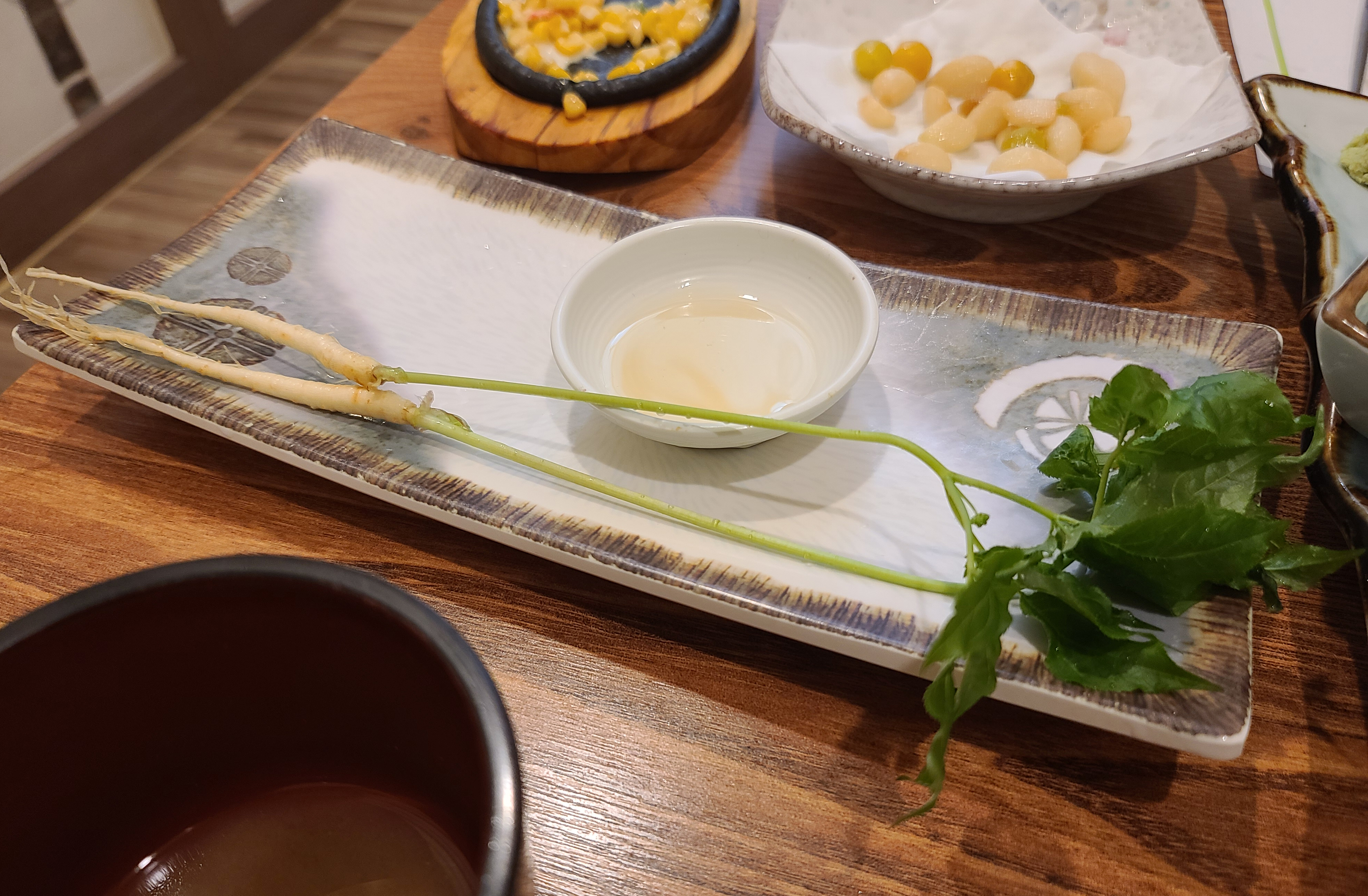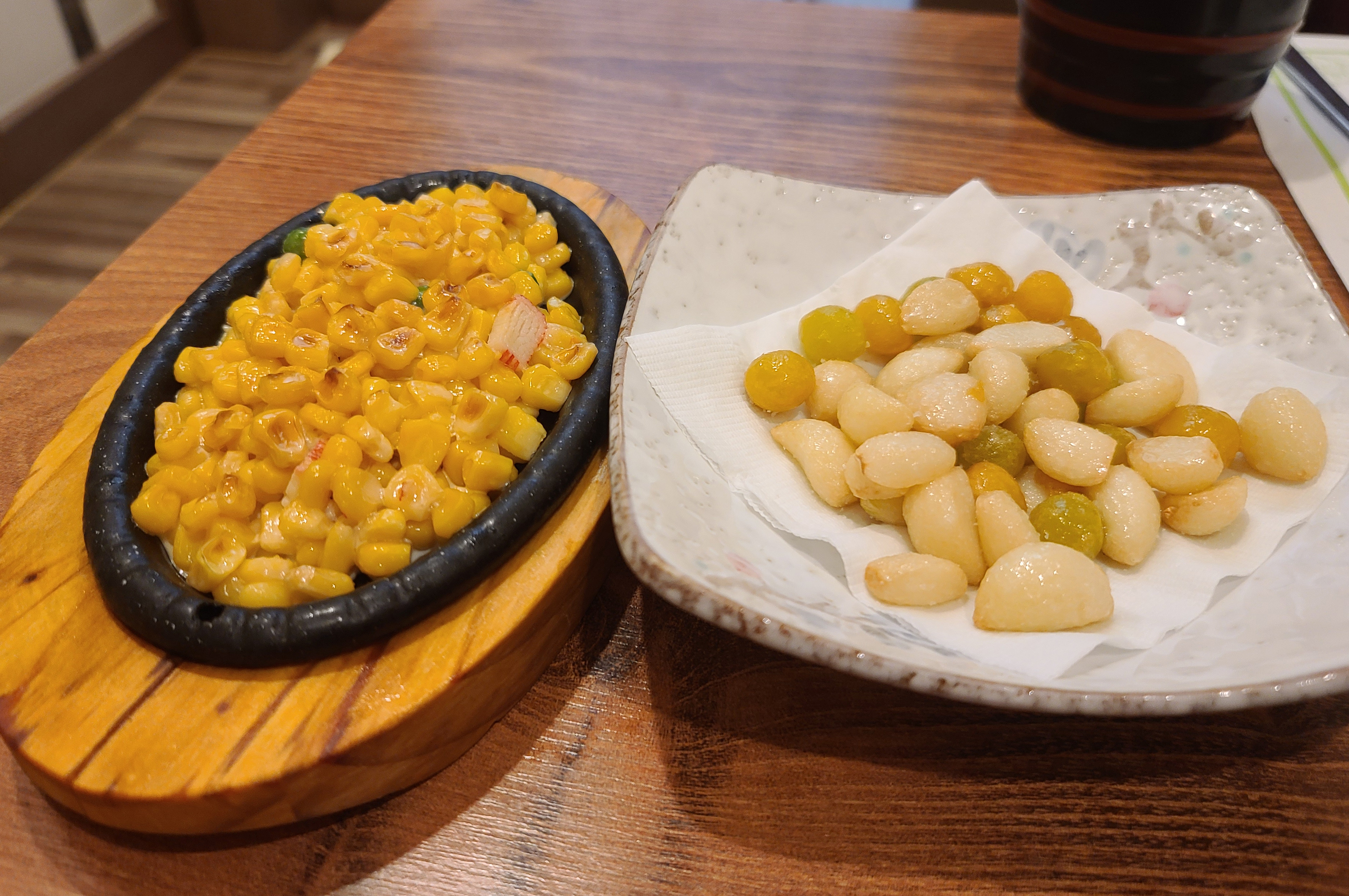 그다음으로 나온 메뉴들은 참치초밥과 콘샐러드, 마늘 은행구이, 장뇌삼(?)이 나왔습니다. 여기까지 먹으니 배가 어느 정도 차더라고요. 사실 배가 부른 상태였지만, 오랜만에 참치를 먹으러 왔기에 다른 메뉴들을 더 기다렸습니다.