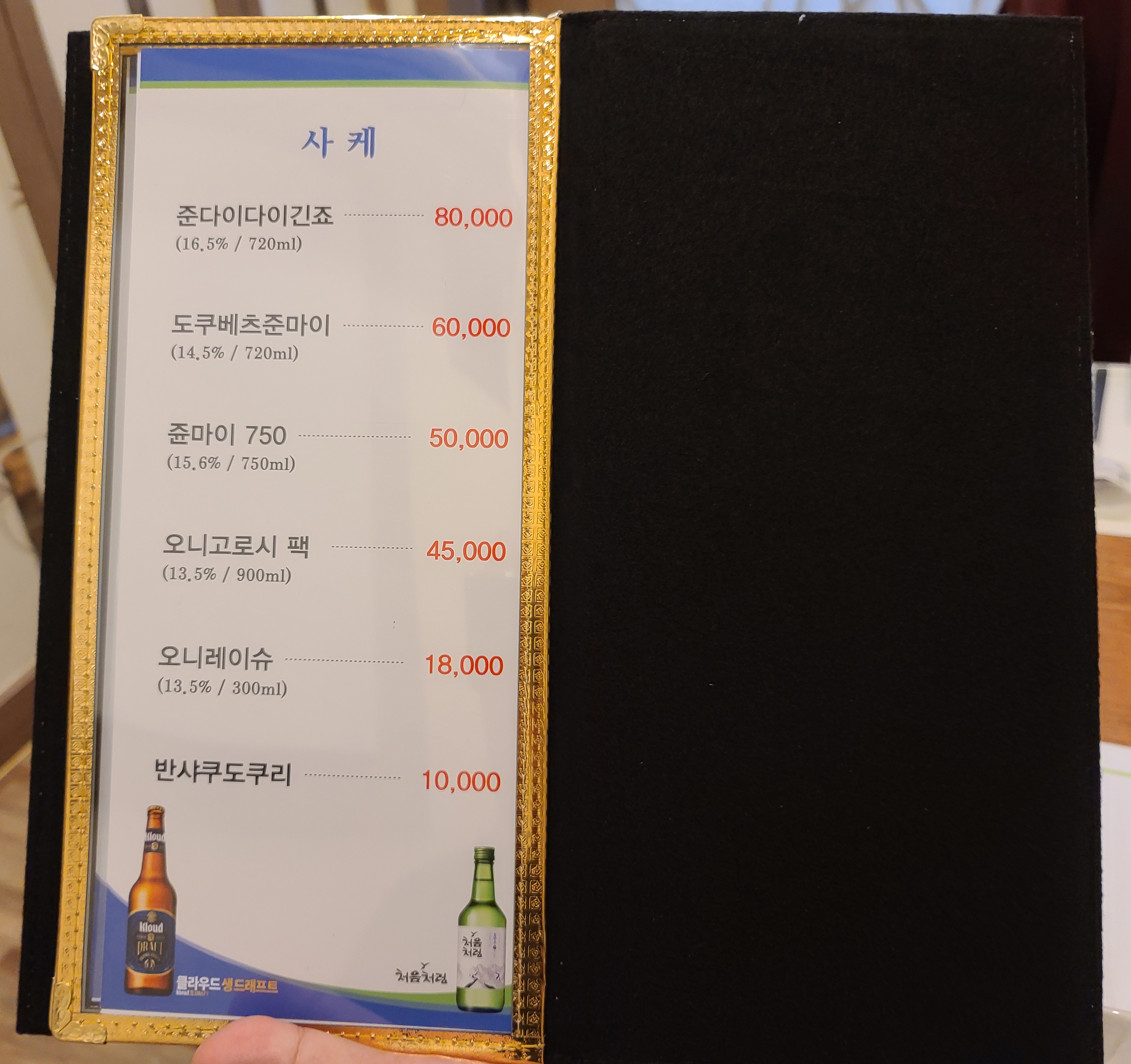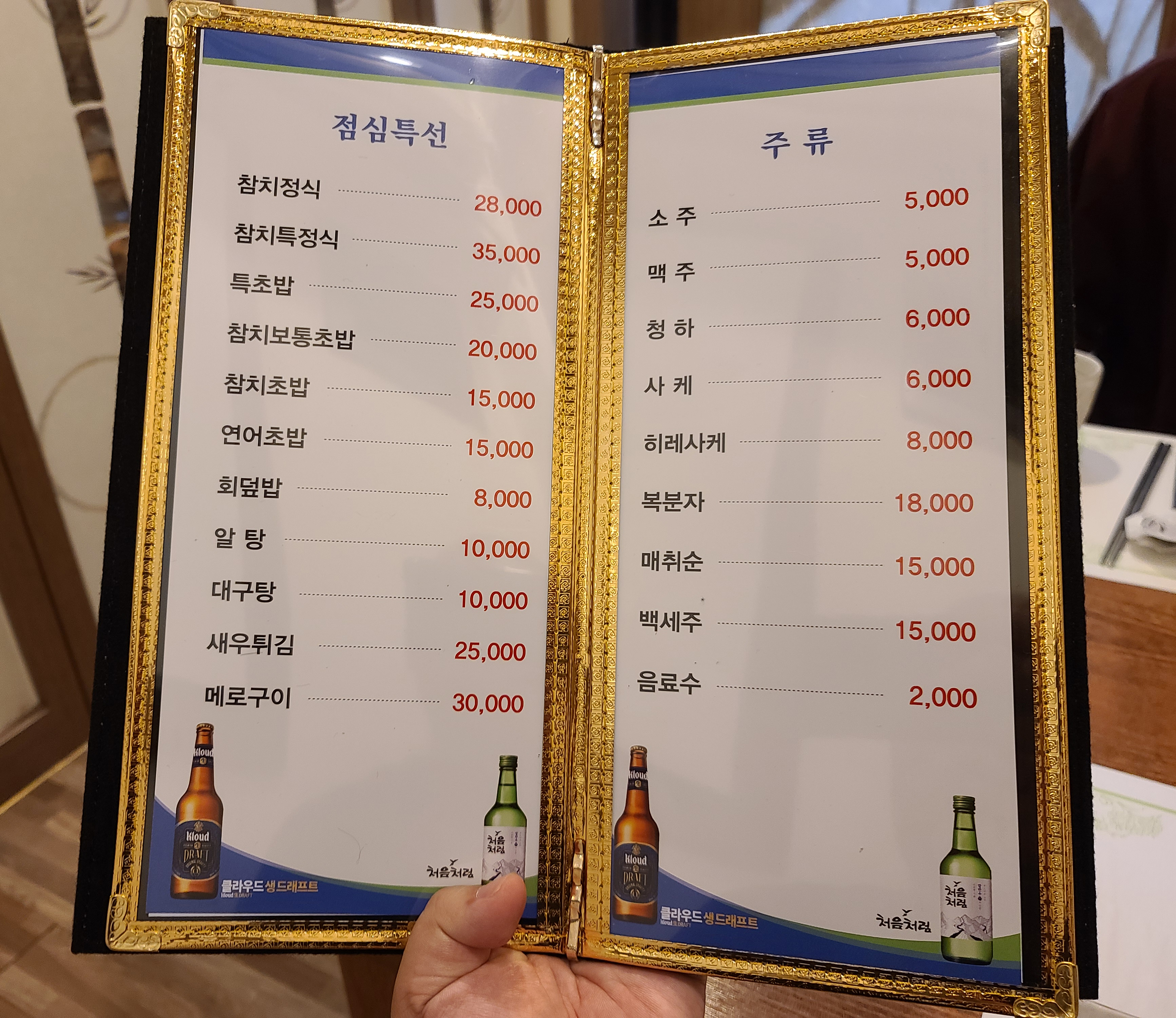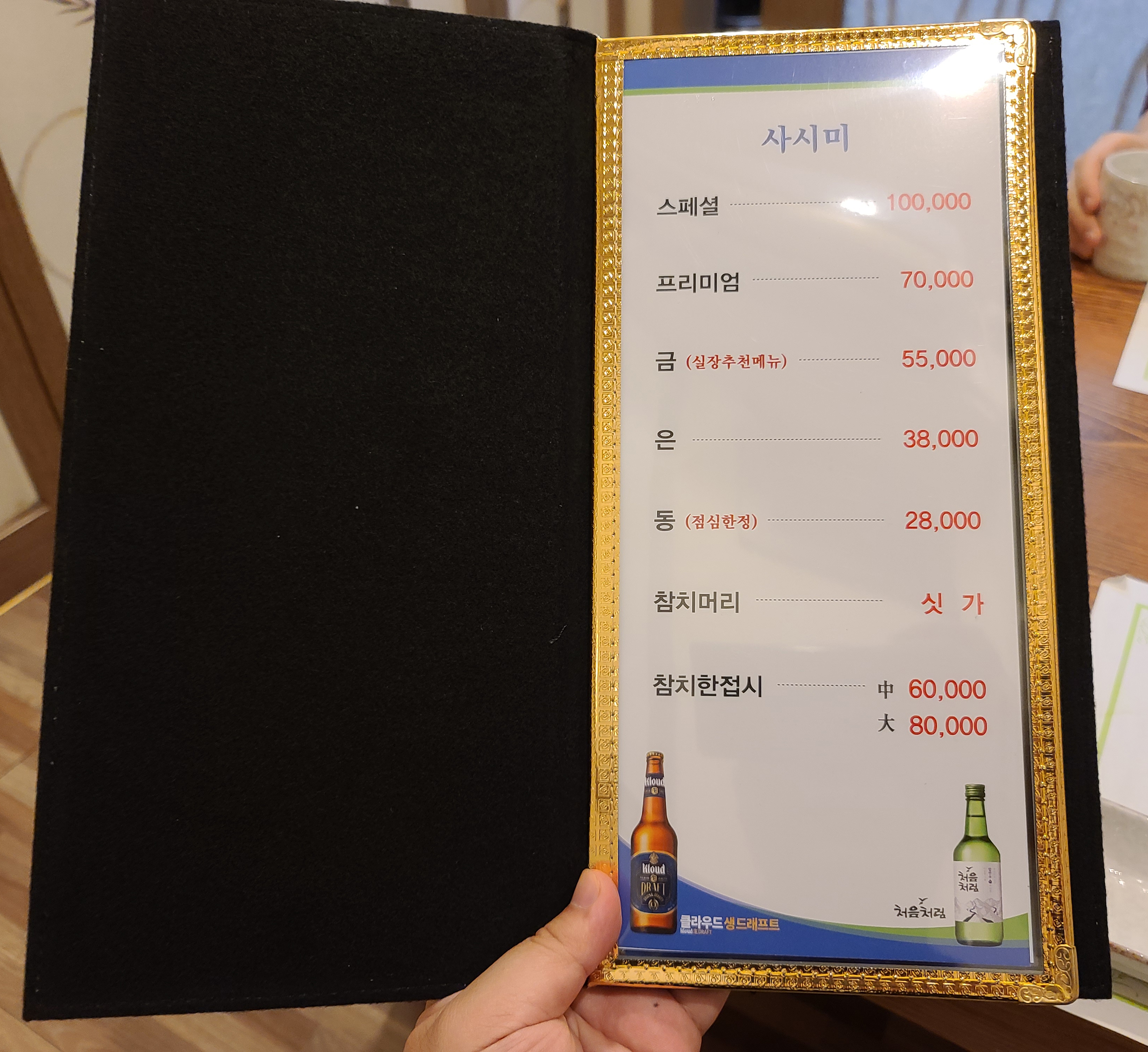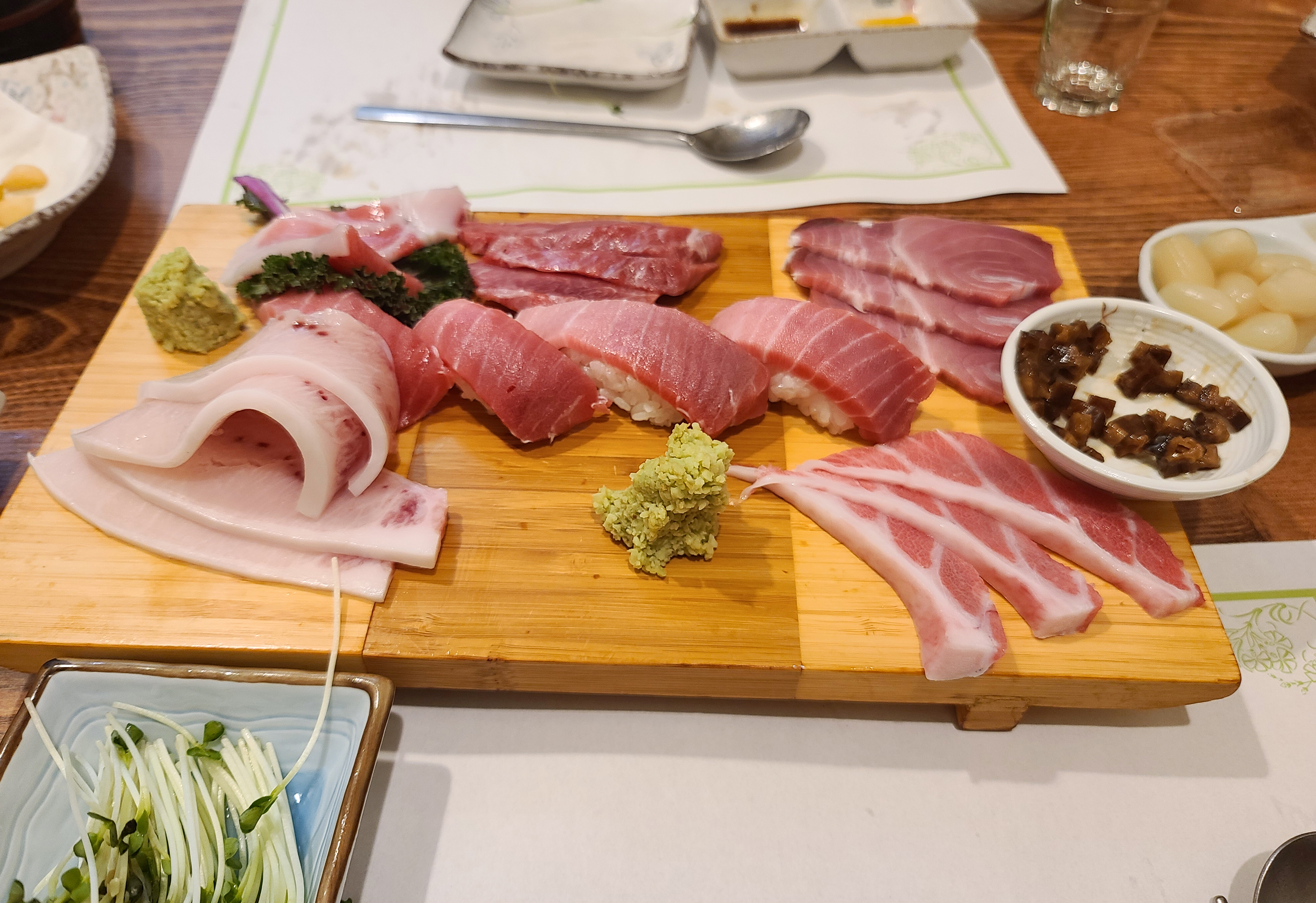 원래 참치는 술과 곁들여야 한다지만, 저희는 시간도 늦었고 술을 마시기에도 다음날 무리가 있어 참치회 위주로 식사하기로 했습니다. 메뉴는 스페셜, 프리미엄, 금, 은, 동, 참치머리, 참치한접시, 참치정식, 참치특정식, 특초밥, 참치보통초밥, 참치초밥, 연어초밥, 회덮밥, 알탕, 대구탕, 새우튀김, 메로구이 등이 있었습니다. 저희는 '실장추천메뉴' 라고 쓰여있는 1인 55,000원의 '금' 메뉴를 주문했습니다.