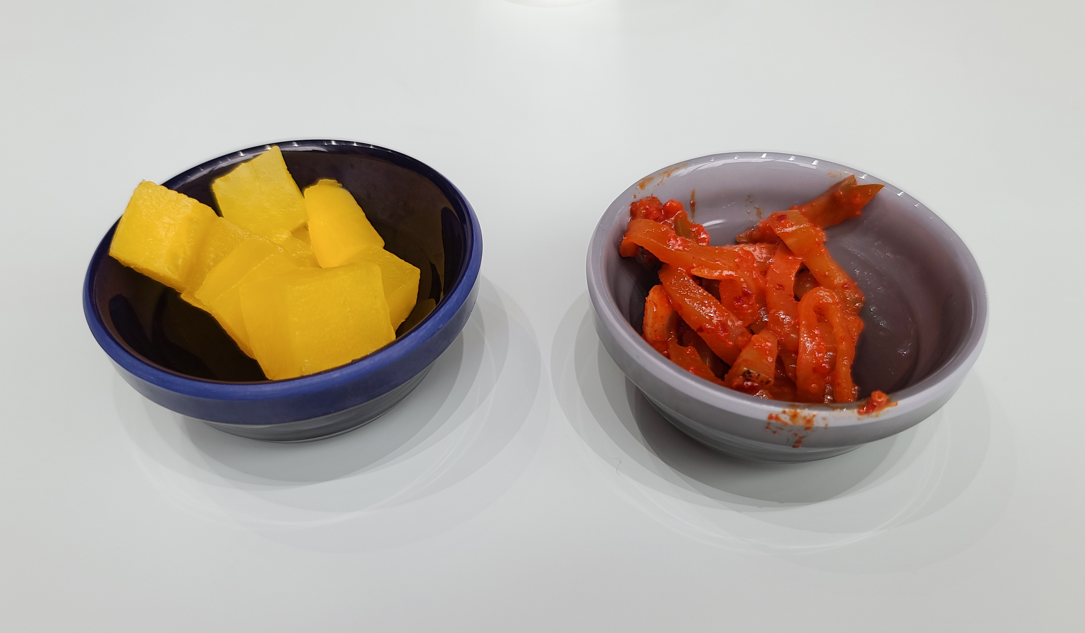 마차이짬뽕은 반찬과 메뉴 등을 직접 가져다 먹도록 되어있었습니다. 반찬은 단무지와 자차이가 함께 제공되었습니다. 마차이짬뽕의 고기 짬뽕의 첫 느낌은 1인분의 양이 꽤 많다는 것이었고, 고기짬뽕이라는 이름답게 고기가 듬뿍 올라가 있다는 게 특징이었습니다. 또 불맛을 내기 위해 채소를 그을린 모습도 볼 수 있었습니다.