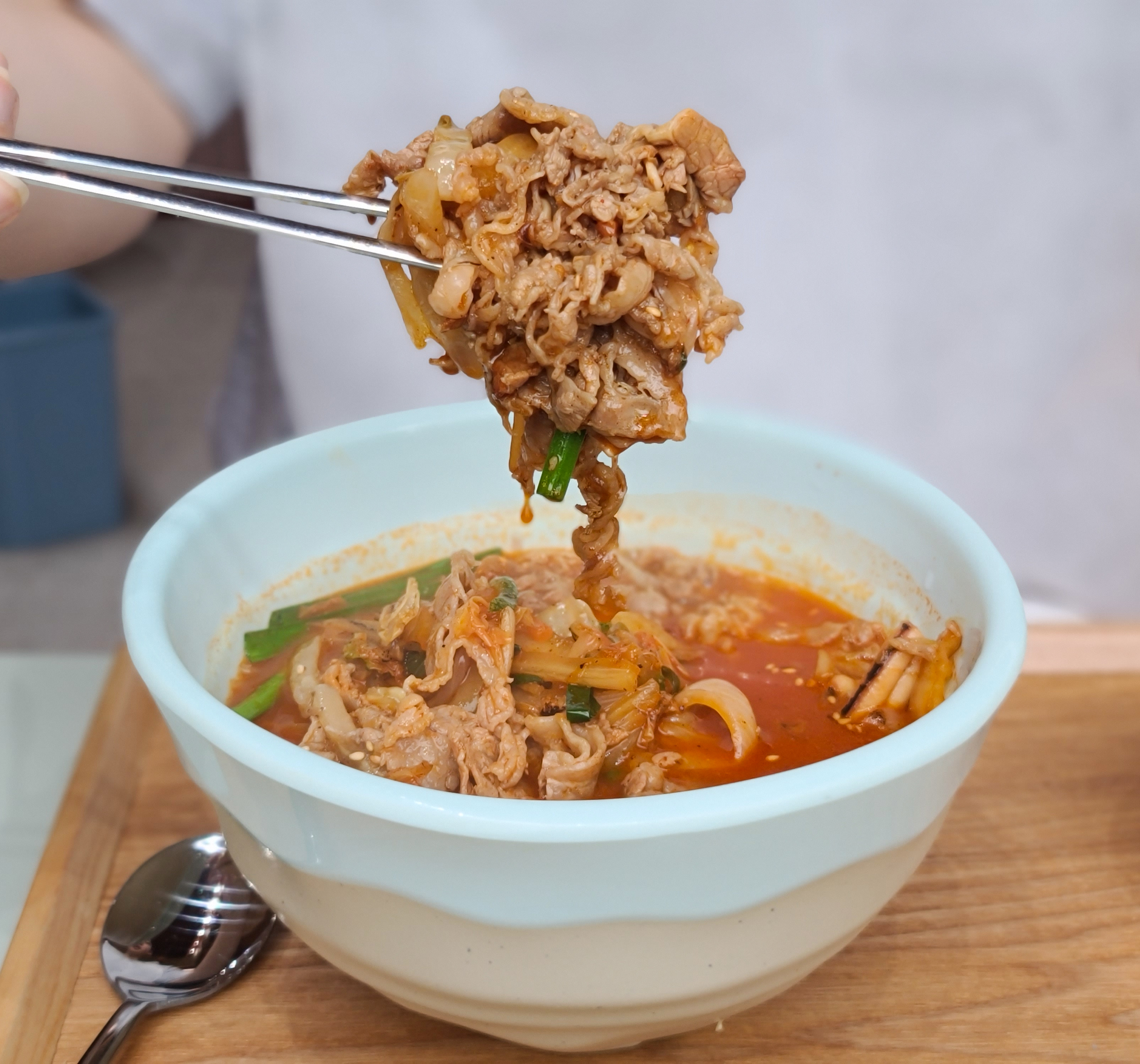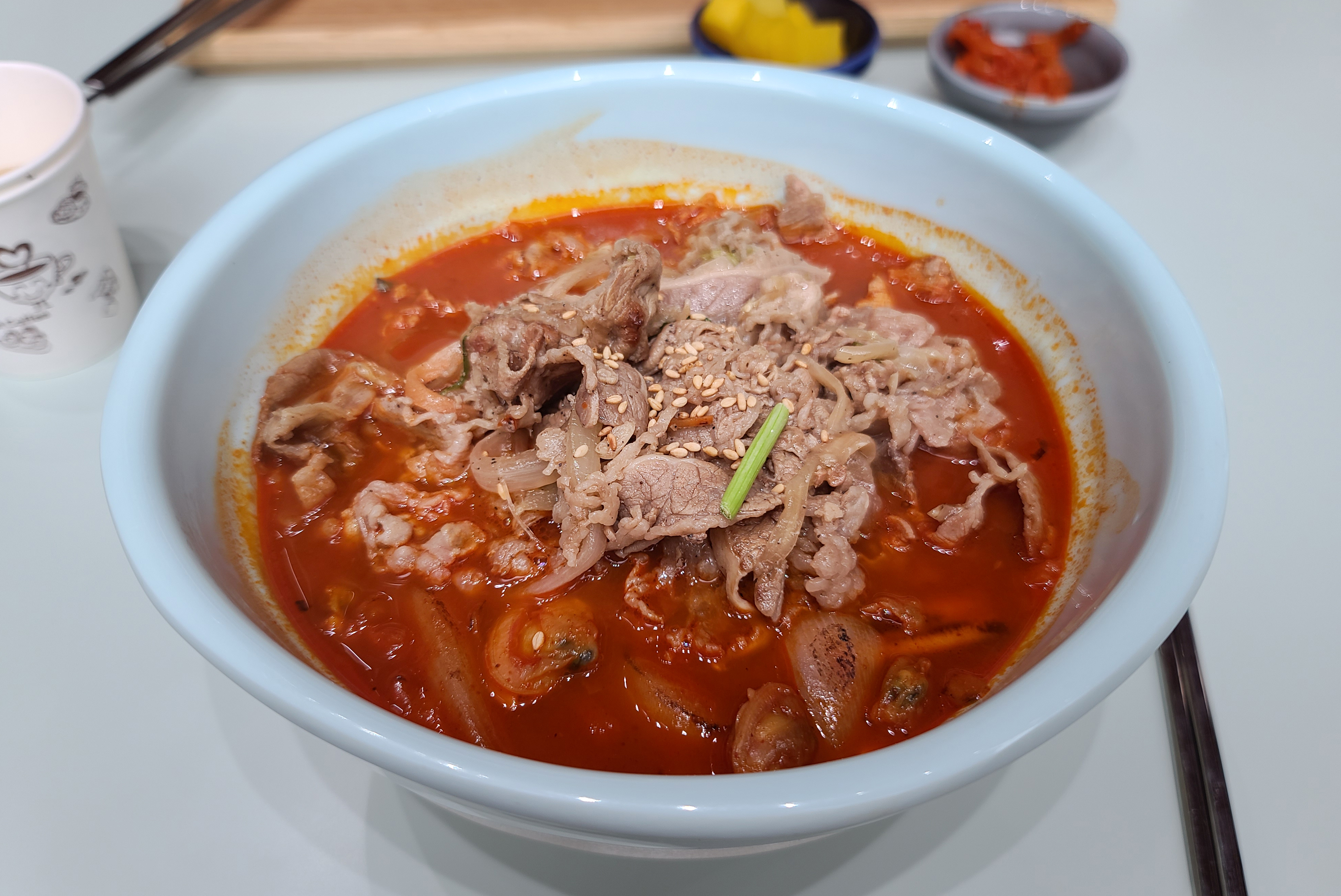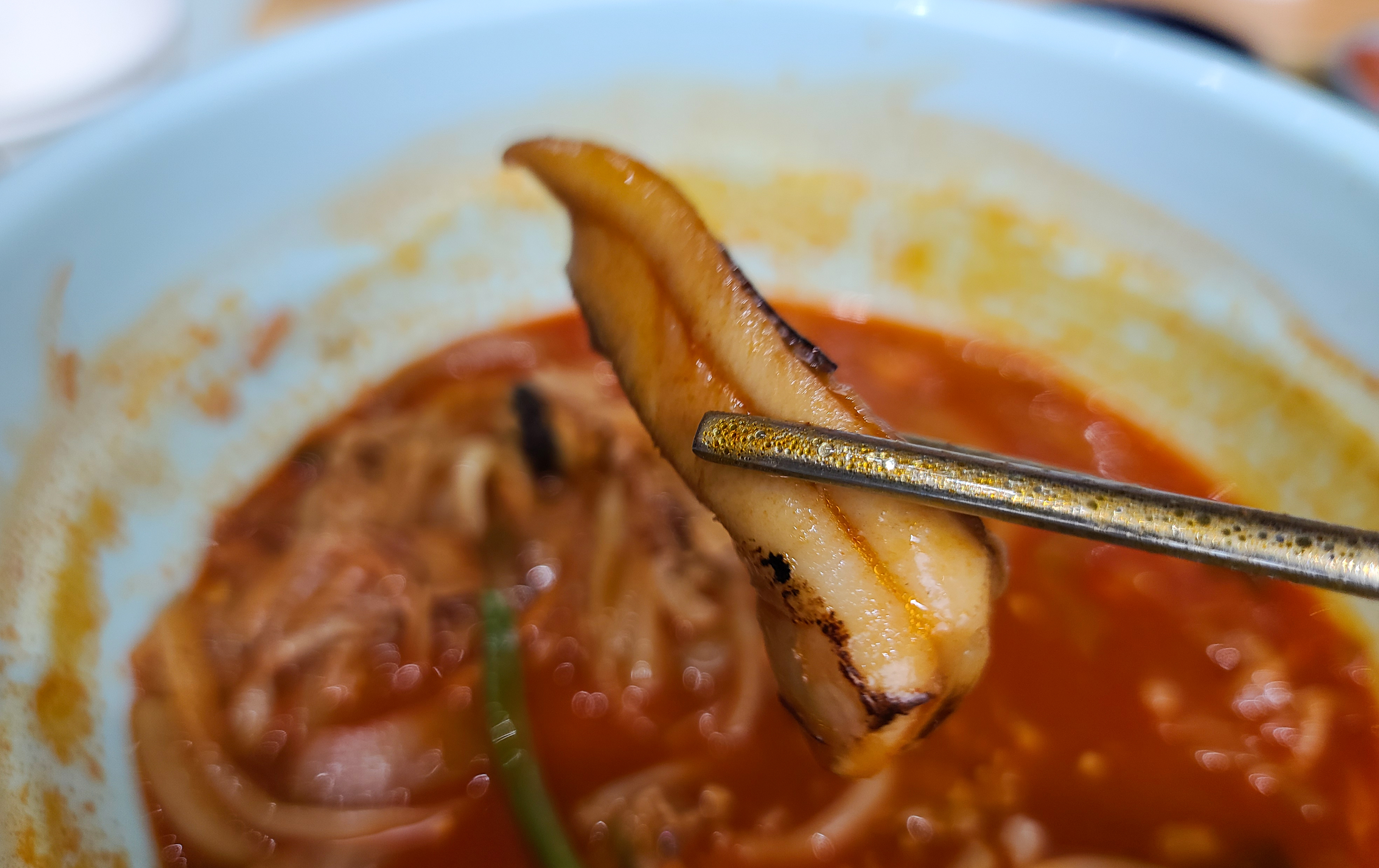 마차이짬뽕은 반찬과 메뉴 등을 직접 가져다 먹도록 되어있었습니다. 반찬은 단무지와 자차이가 함께 제공되었습니다. 마차이짬뽕의 고기 짬뽕의 첫 느낌은 1인분의 양이 꽤 많다는 것이었고, 고기짬뽕이라는 이름답게 고기가 듬뿍 올라가 있다는 게 특징이었습니다. 또 불맛을 내기 위해 채소를 그을린 모습도 볼 수 있었습니다.