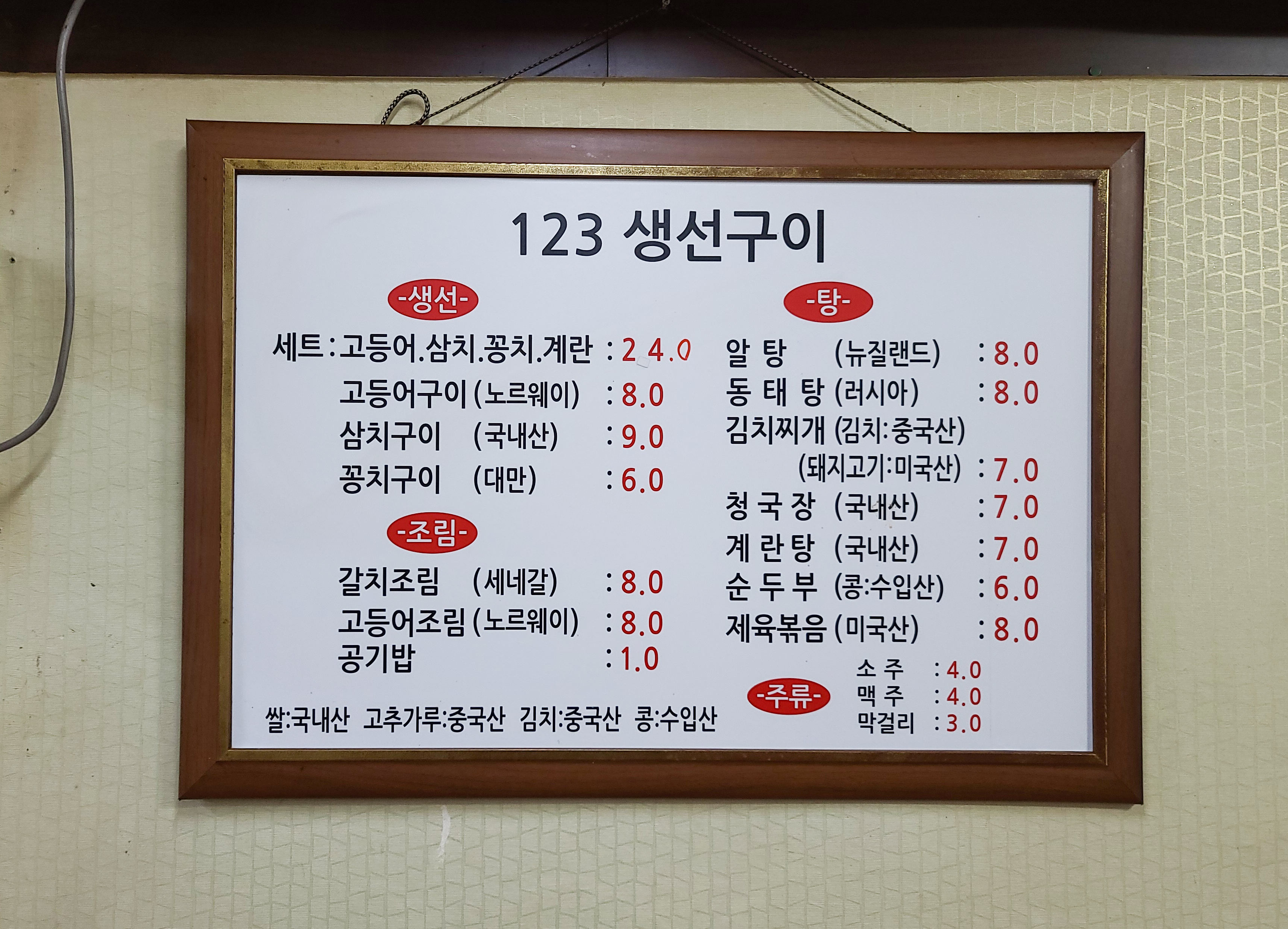 생선구이 전문점답게 간판을 가득 채운 '생선구이'라는 글자가 눈에 띕니다. 가게 옆 주차공간에는 차량 1~2 대정도 댈 수 있었으며, 메뉴는 위와 같았습니다. 세트메뉴, 고등어구이, 삼치구이, 꽁치구이, 갈치조림, 고등어조림, 알탕, 동태탕, 김치찌개, 청국장, 계란탕, 순두부, 제육볶음이 있었습니다. 저희는 <123 생선구이> 가게의 고등어, 삼치, 꽁치구이와 계란찜이 제공되는 세트메뉴를 주문했습니다.