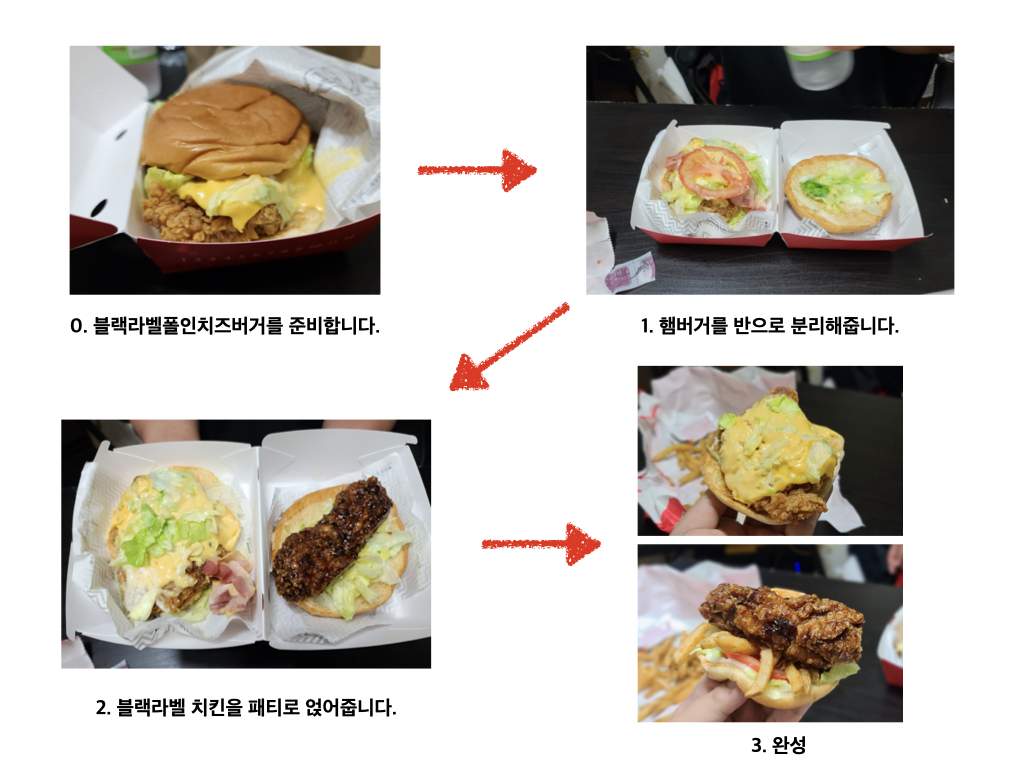자, 이제 제목처럼 '블랙라벨 폴인치즈버거 2배 더 맛있게 먹는방법'을 소개해드리겠습니다. 사진으로만 소개하기엔 좀 이해시켜드리기 어려울 것 같아서 과정을 설명하는 그림을 만들어보았습니다.
