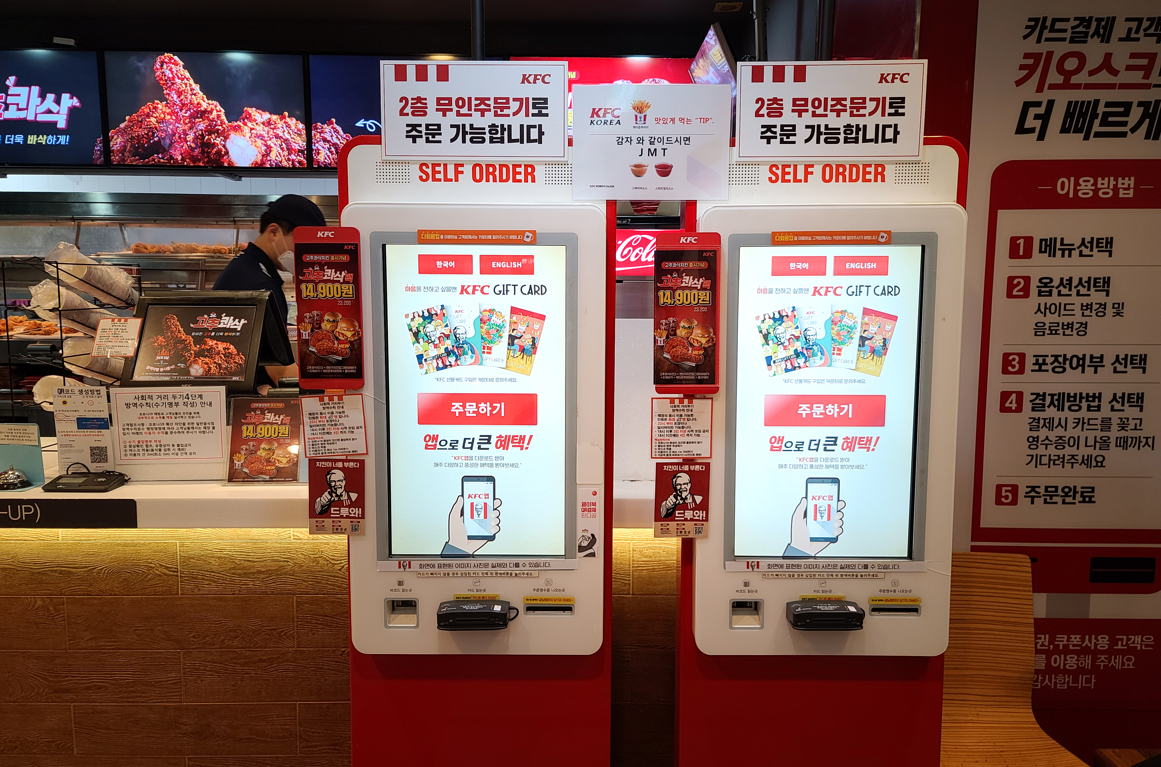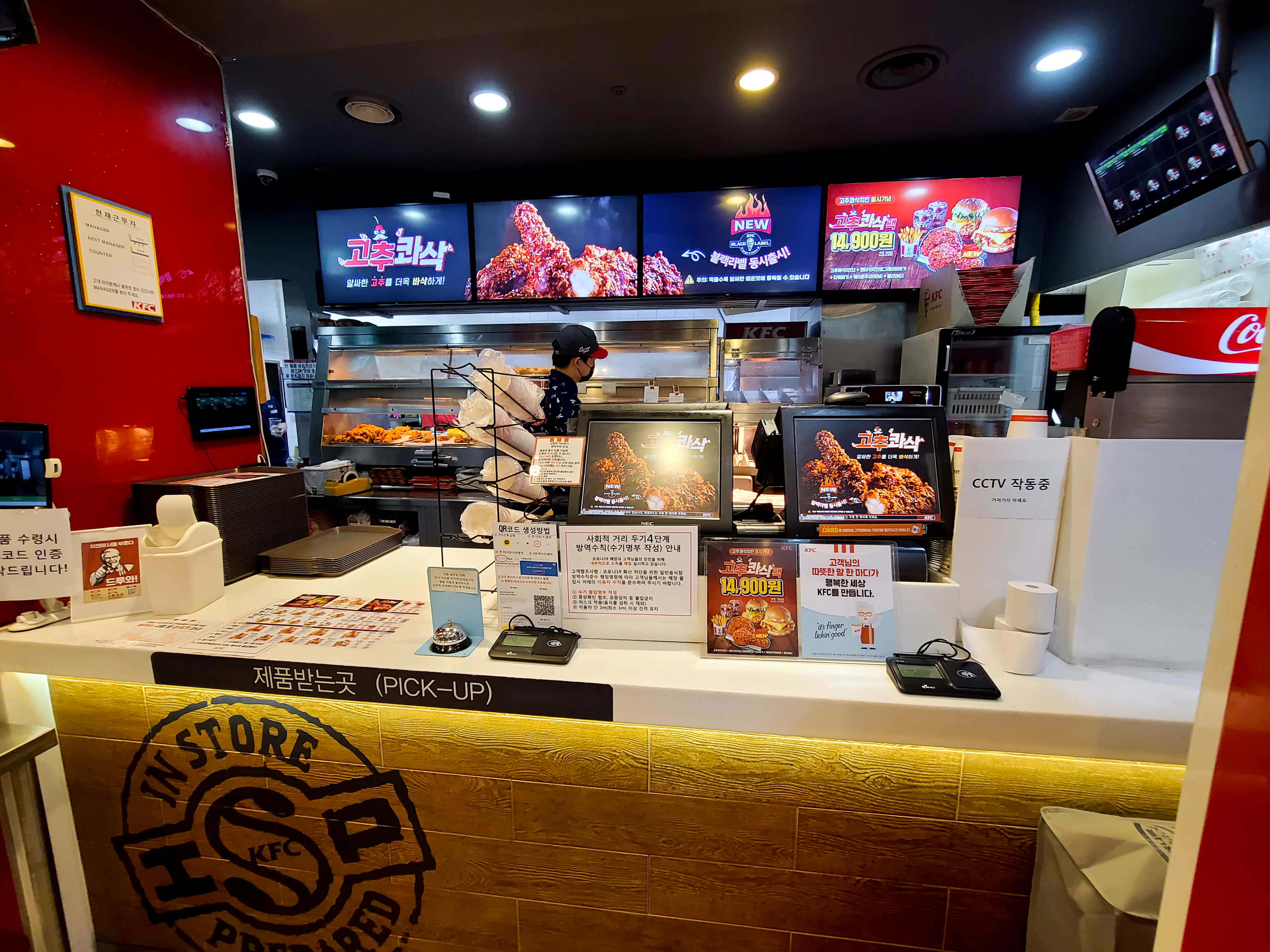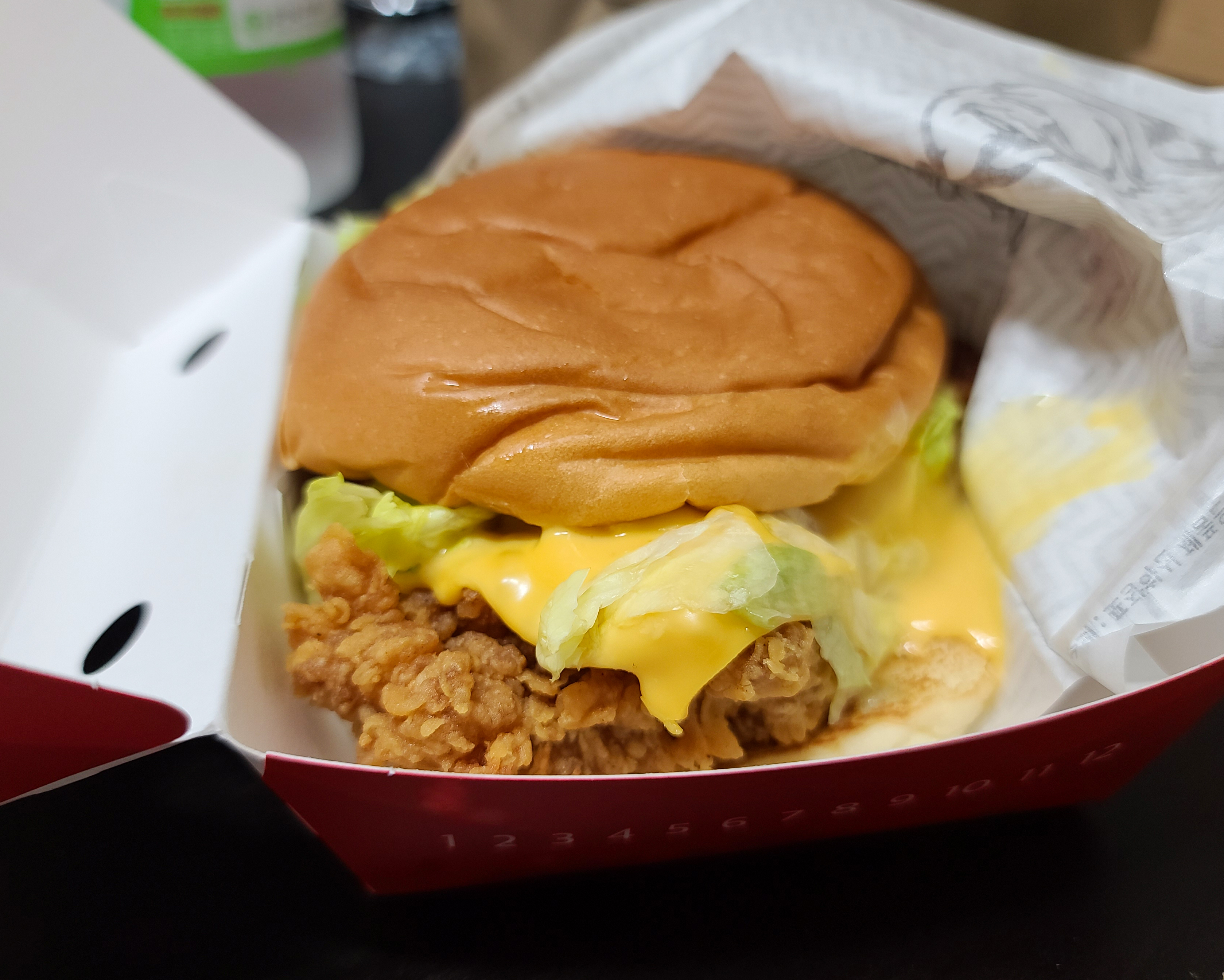우선 KFC 매장에서 '블랙라벨폴인치즈버거' 세트를 주문합니다. 햄버거 세트만 먹기엔 양이 좀 적은 듯 하니 추가로 블랙라벨 치킨을 주문했습니다. 요즘은 KFC 신메뉴 '고추콰삭 블랙라벨' 치킨이 나왔더라고요. 주문한 메뉴를 담아서 집으로 가져옵니다.