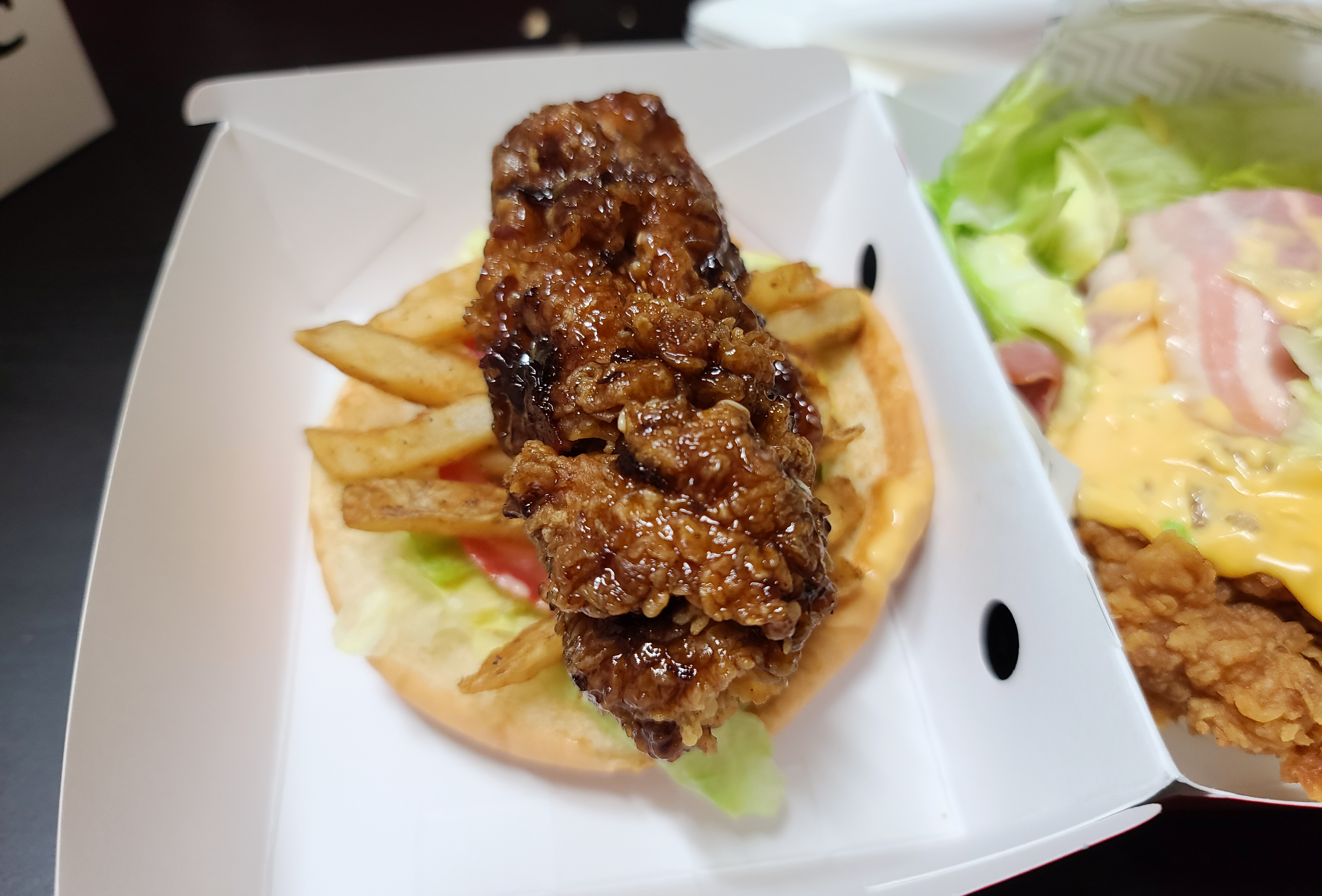 저 같은 경우에는 블랙라벨치킨 밑에 KFC 케이준 감자튀김을 깔고 먹었답니다. 이렇게 먹으면 하나의 햄버거로 2가지 맛을 느끼게 되죠. 이 방법은 요리 유튜브를 하는 지인의 소개로 알게 된 방법인데 꽤 신박해서(?) 여러분에게 소개해드리게 되었습니다. 햄버거 하나로 부족함을 느끼시는 분이 계시다면 이 방법 한 번 도전해보시는 것 어떨까요?(ㅋㅋ)