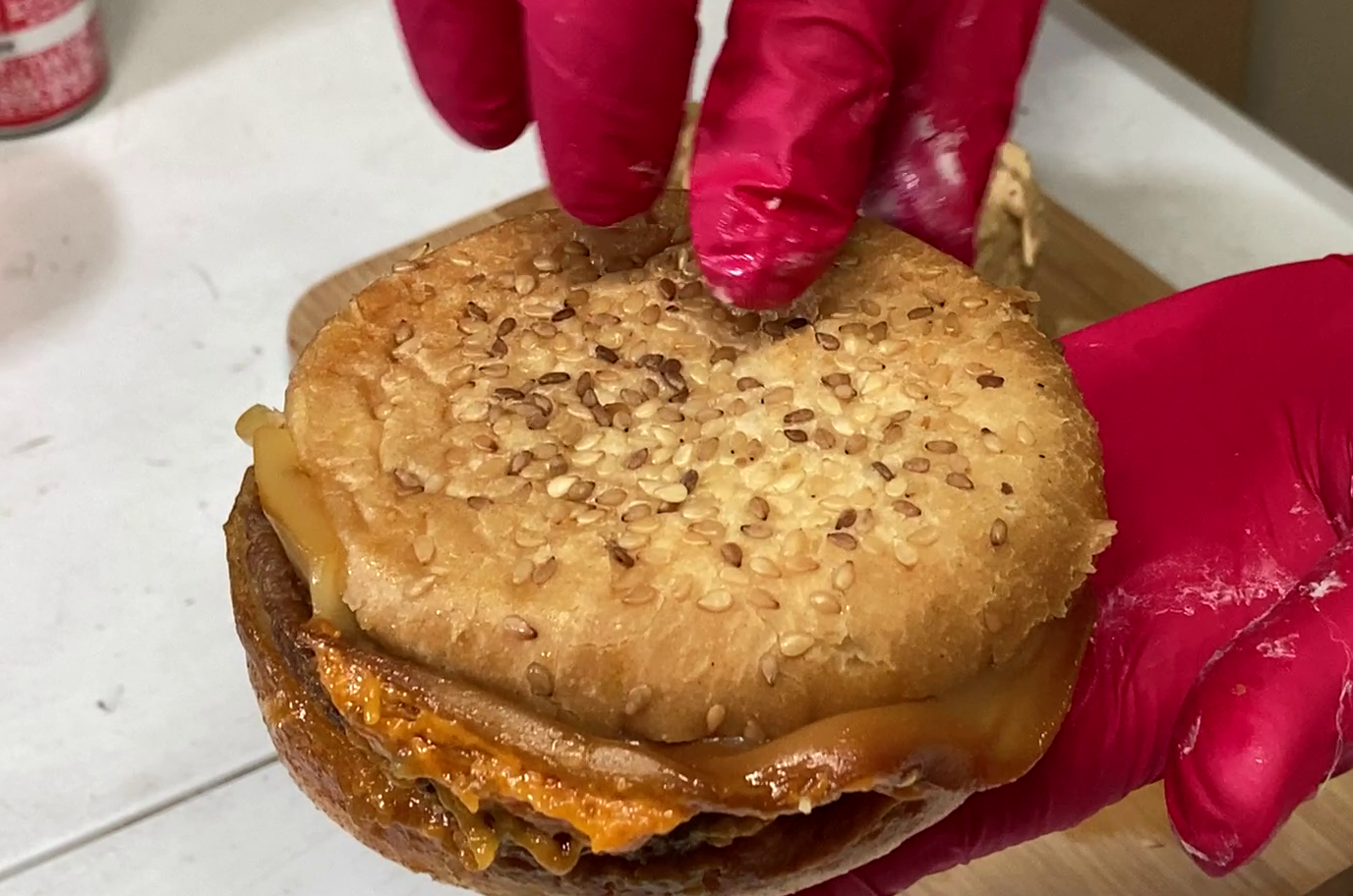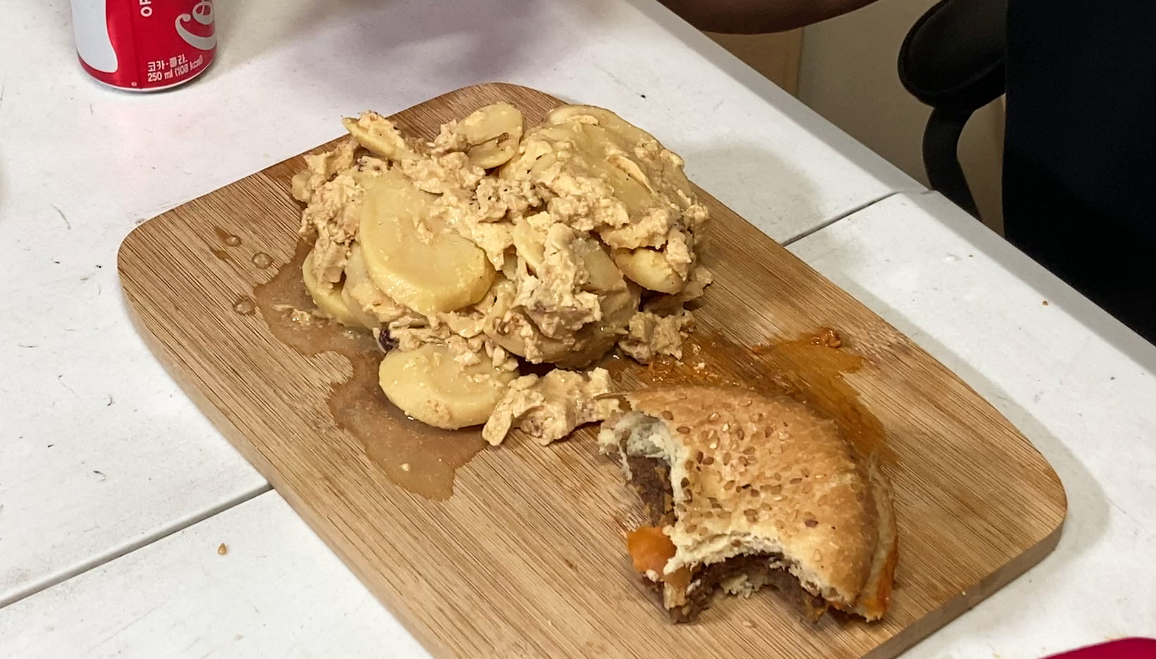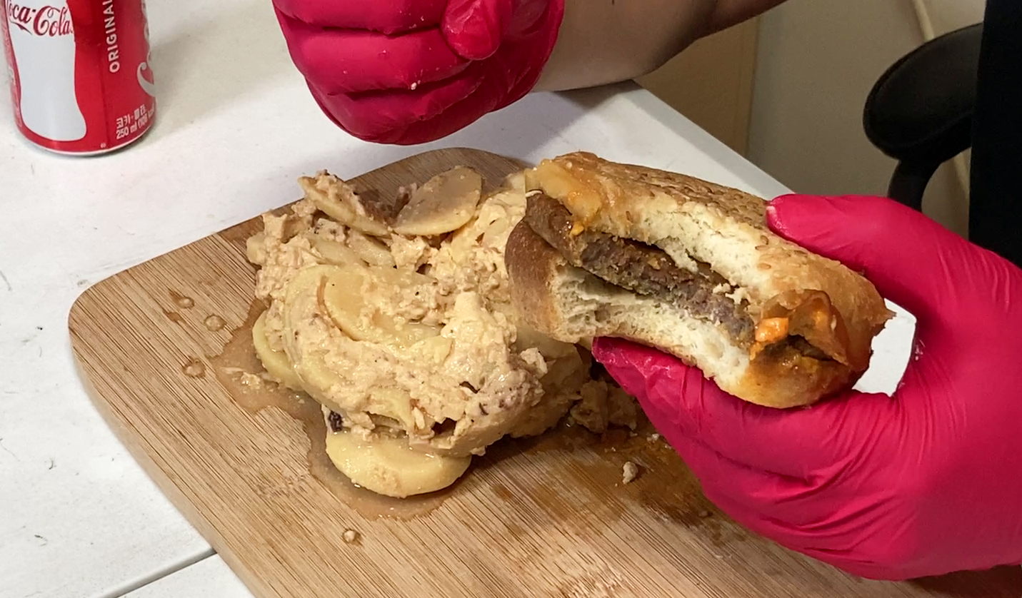 통조림 속 햄버거는 나름 참깨 빵과 고기 패티, 치즈가 들어가 우리가 흔히 생각하는 햄버거의 모습을 취하고 있었습니다. 가장 궁금했던 햄버거의 맛은 어땠을까요? 햄버거의 패티는 약간 두껍고 질긴 느낌이 있었습니다. 햄버거 맛은 편의점 햄버거와 비슷하거나 조금 못 한정도(?) 치즈의 향이나 고기 패티는 조금 저렴한 맛이 났는데, 호기심에 한 번 먹어볼 만 하지만 두 번은 먹고 싶지는 않은 맛이었습니다.