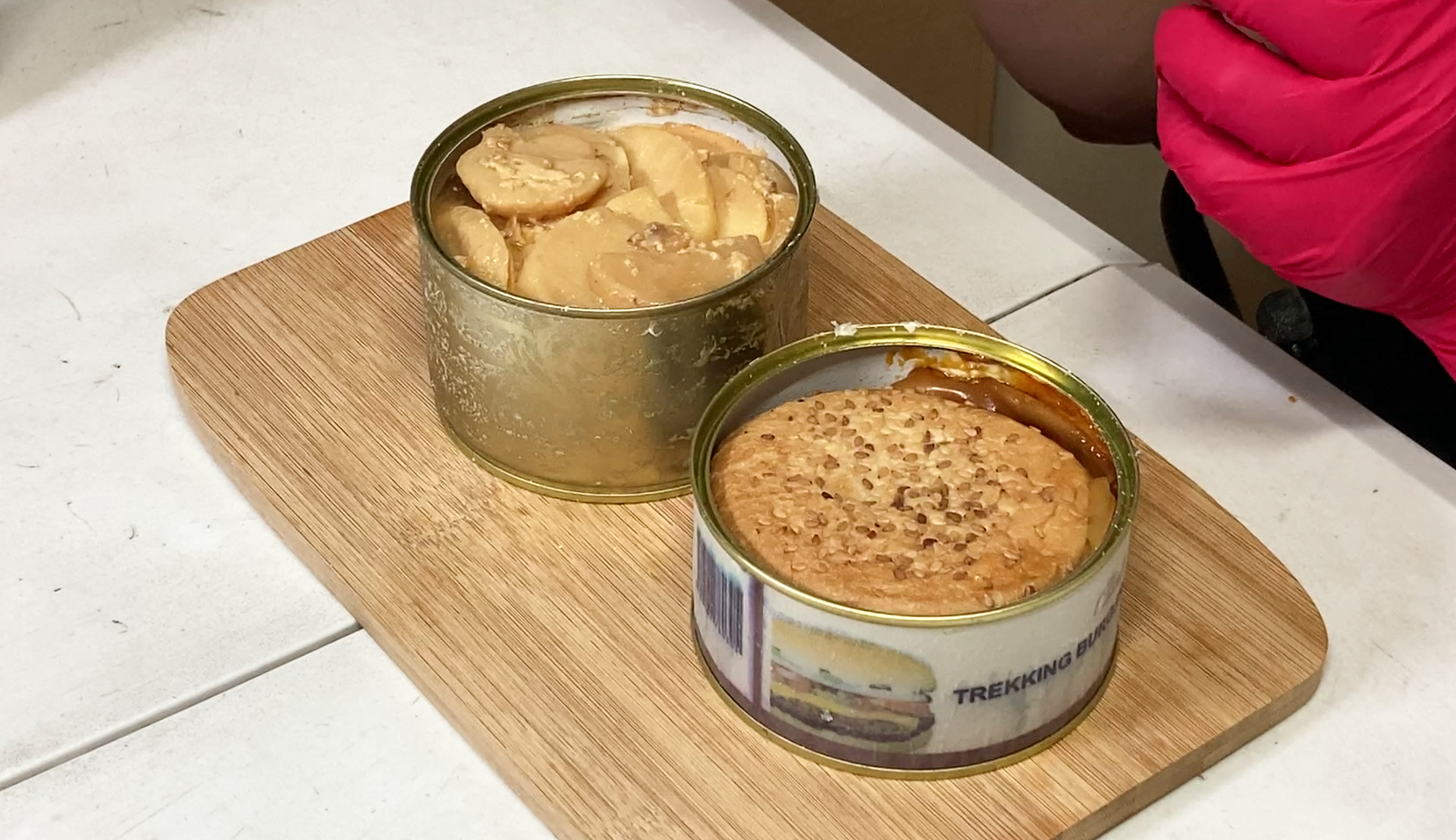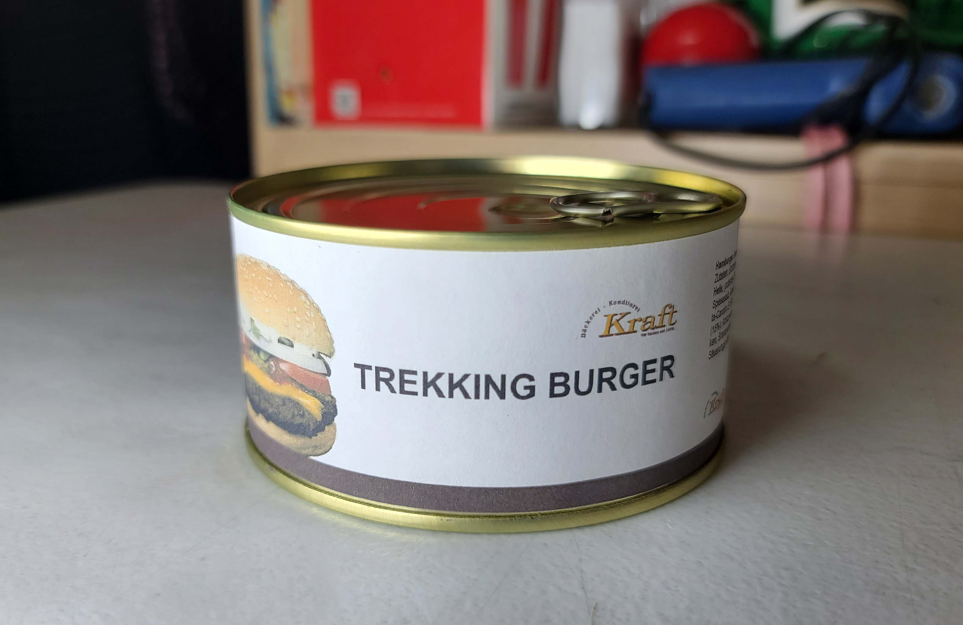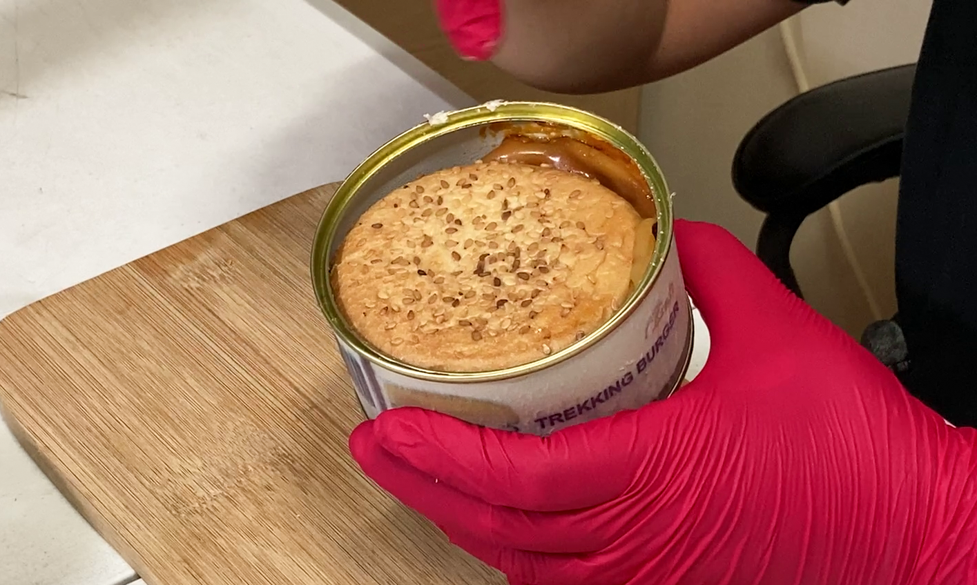 통조림 햄버거와 감자볶음은 위와 같이 캔 안에 들어있었습니다. 햄버거의 이름은 트레킹버거(Trekking burger) 였고, 독특한 게 포장이 A4 용지에 출력한 조잡한(?) 느낌이 있었습니다. 수입한 식품이다 보니 과연 이 제품을 안심하고 먹어도 될 것인가? 하는 불안감도 일부 있었습니다.