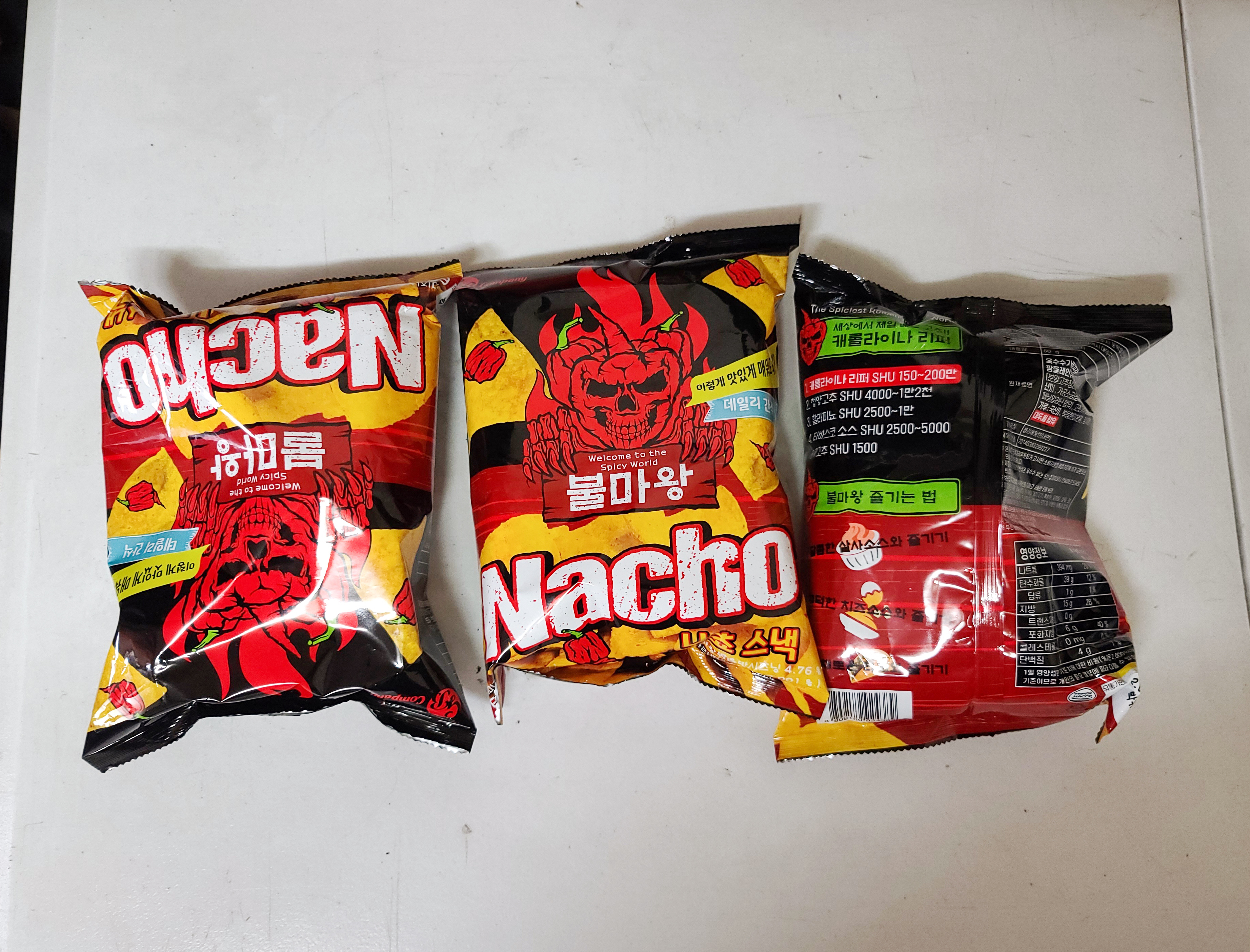 그보다 저는 금비유통 불마왕 나쵸의 원재료명을 살펴보다가 재료로 사용된 캐롤라이나리퍼 고춧가루가 국산으로 사용된다는 점에서 놀랐습니다. 세상에서 가장 매운 고추의 가루가 수입이 아니라 국산이라는 게 신기하더라고요. 이제 본격적으로 세상에서 가장 매운 나쵸를 맛볼까요?