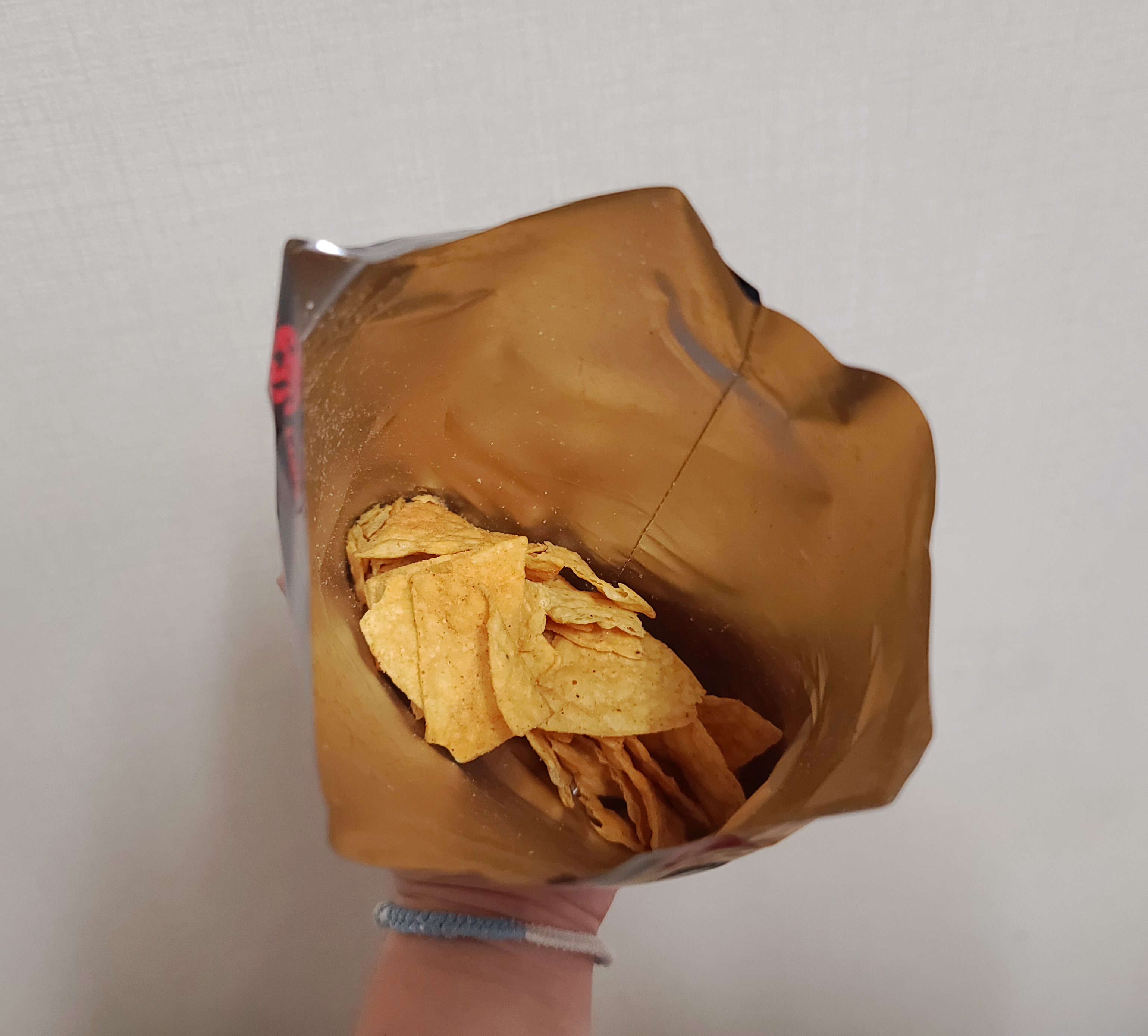 불마왕나쵸의 모습은 이렇습니다. 저는 처음에 과자가 봉지의 1/3 도 채 안 채워진 것을 보고서 실망을 했는데, 나중에 먹다 보니 더 많았으면 큰일 날 뻔했다는 생각도 들더라고요. 평소 매운 음식을 잘 먹기 때문에 별 걱정 없이 나쵸를 집어서 먹었는데, 생각보다 매운맛에 놀랐습니다. 캐롤라이나 리퍼 고춧가루가 들어간 나쵸는 혀가 아리게 매운맛을 보여주었습니다.