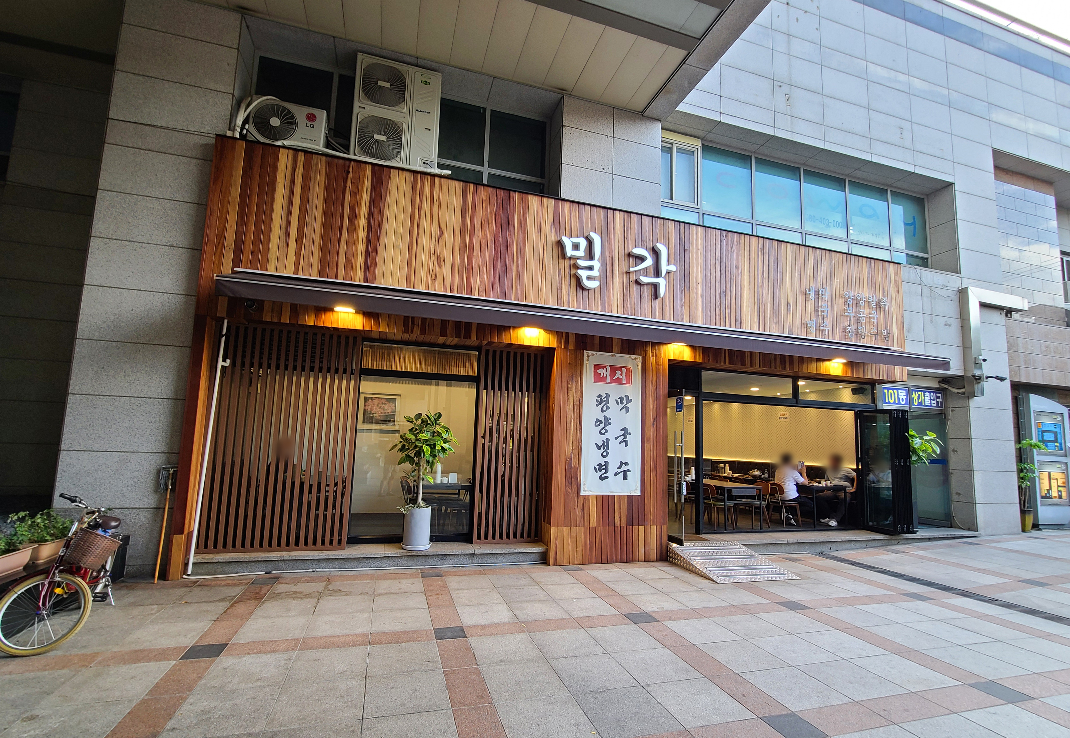 성원쌍떼빌 1층에 위치한 밀각은 널찍한 실내와 깔끔한 인테리어가 돋보이는 가게였습니다. 건물의 중앙 쪽에 위치해 있기 때문에 101동 상가 입구 쪽으로 주차를 마치고 1층으로 올라오면 식당을 만날 수 있었습니다.