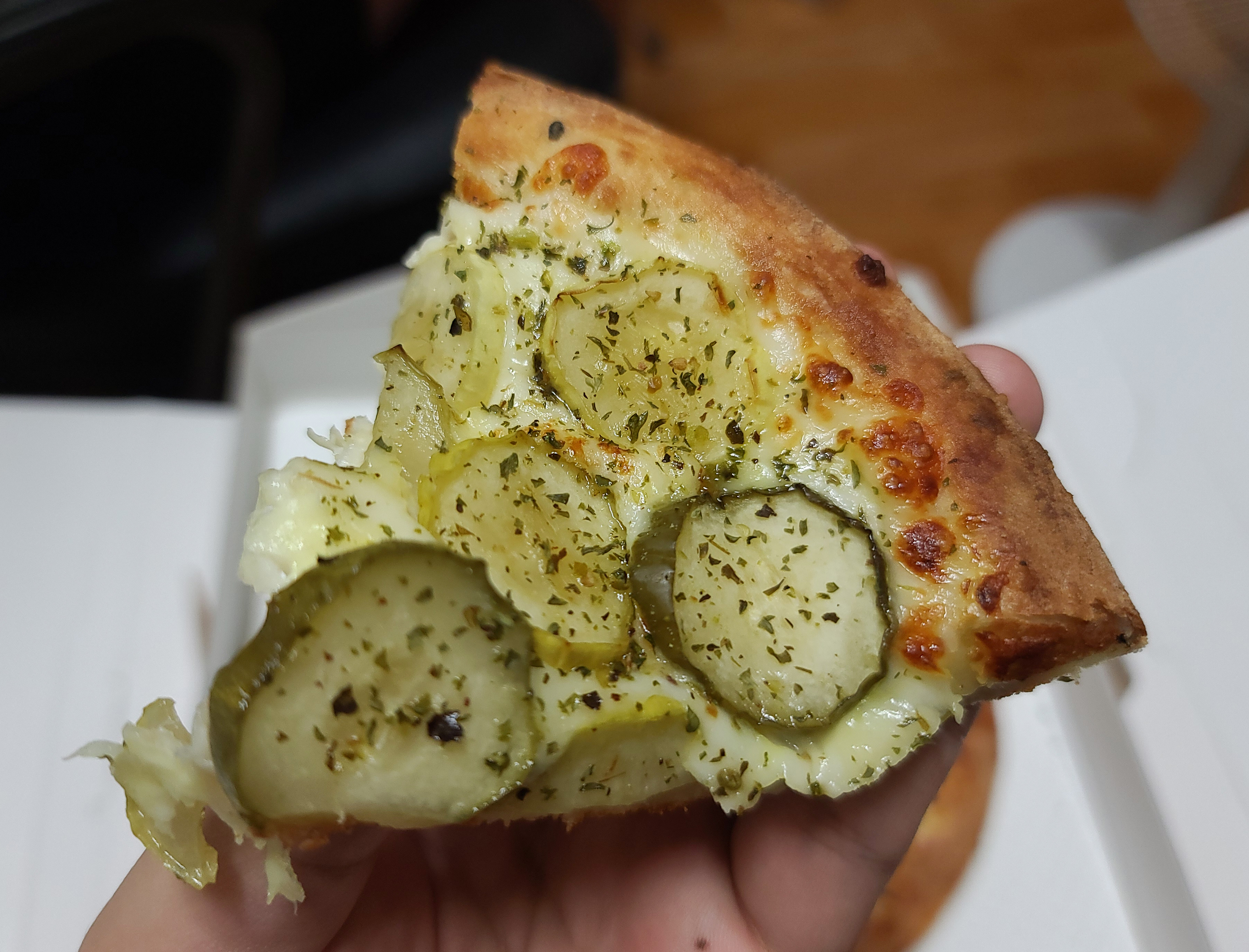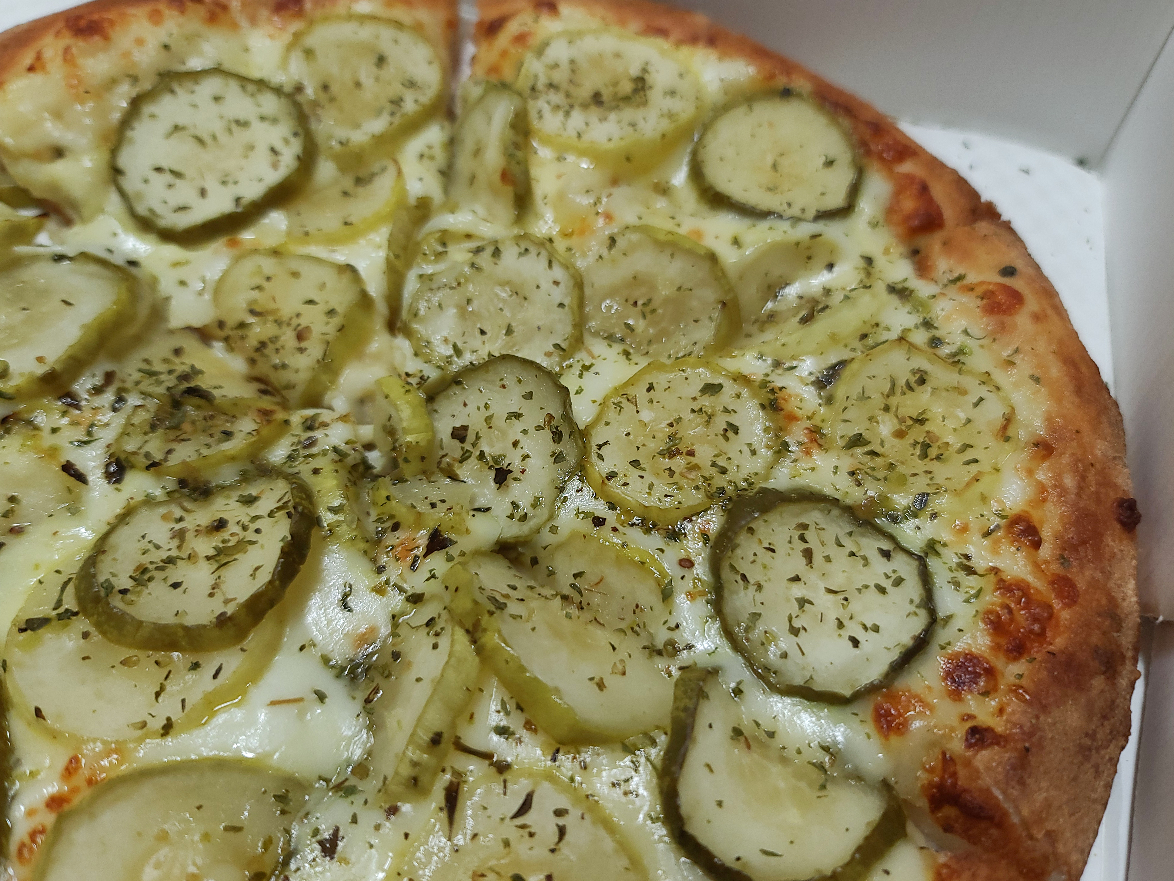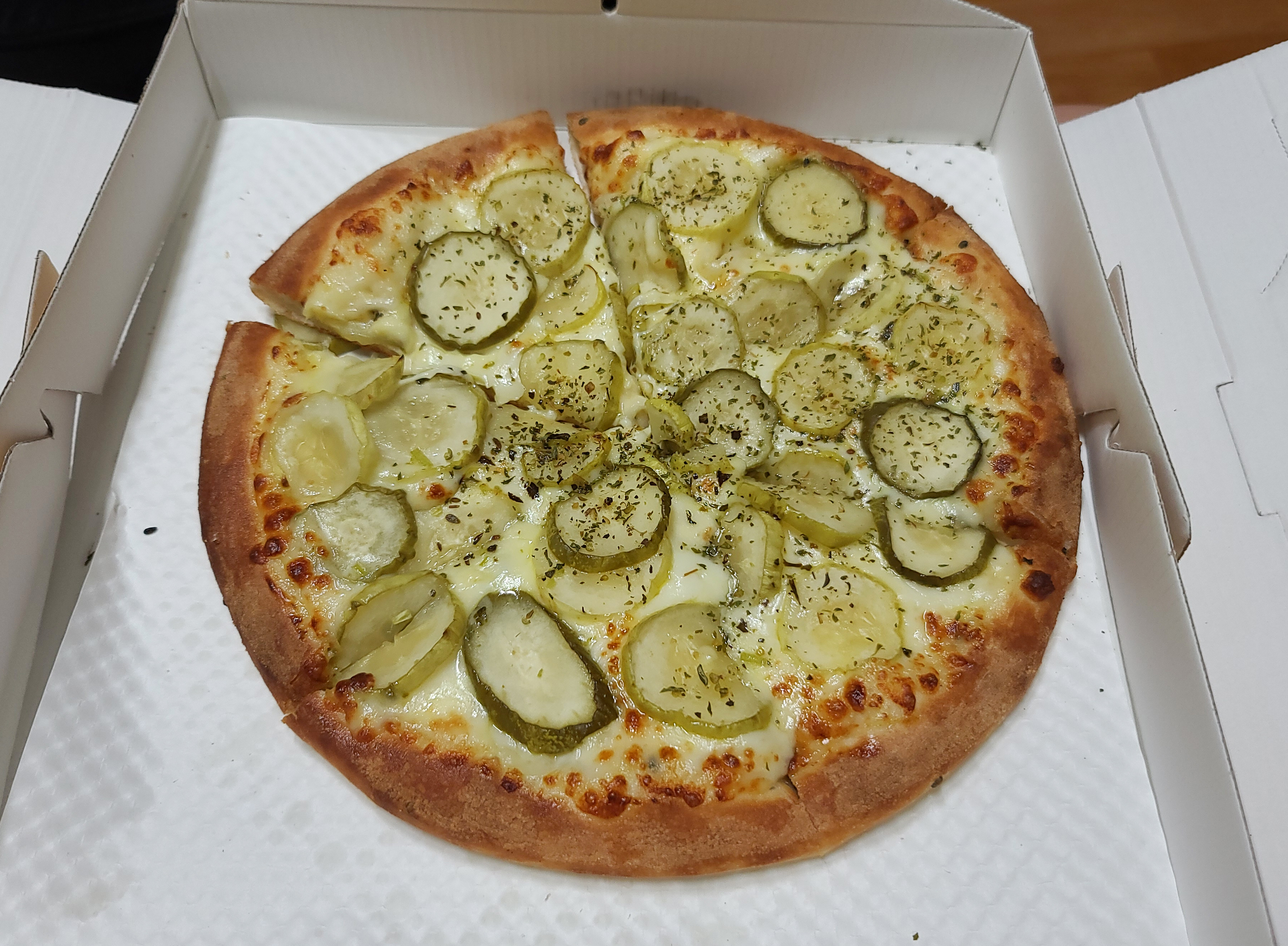 피자위에 토핑 된 피클들은 보기만 해도 거부감이 들었지만, 실제로 들고 먹어보니 의외로 나쁘지 않더라고요. 제 소셜 미디어에 게시글로 공유하니 친구들의 반응은 "기괴하다" 고 하기도 하고 "맛있냐?" 는 반응들이 많았습니다. 솔직히 말하자면 정말 의외로 맛있어서 놀랐습니다.