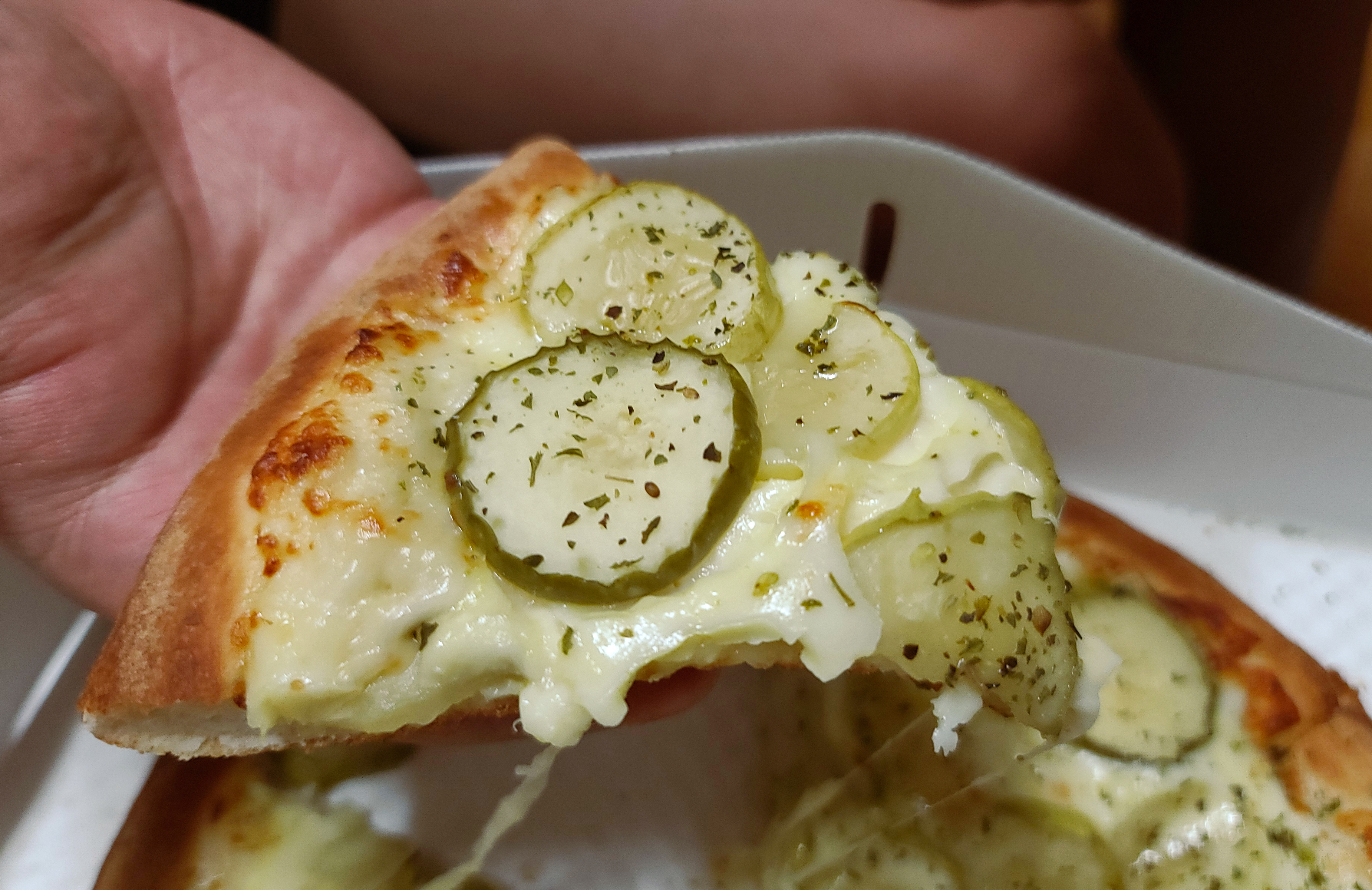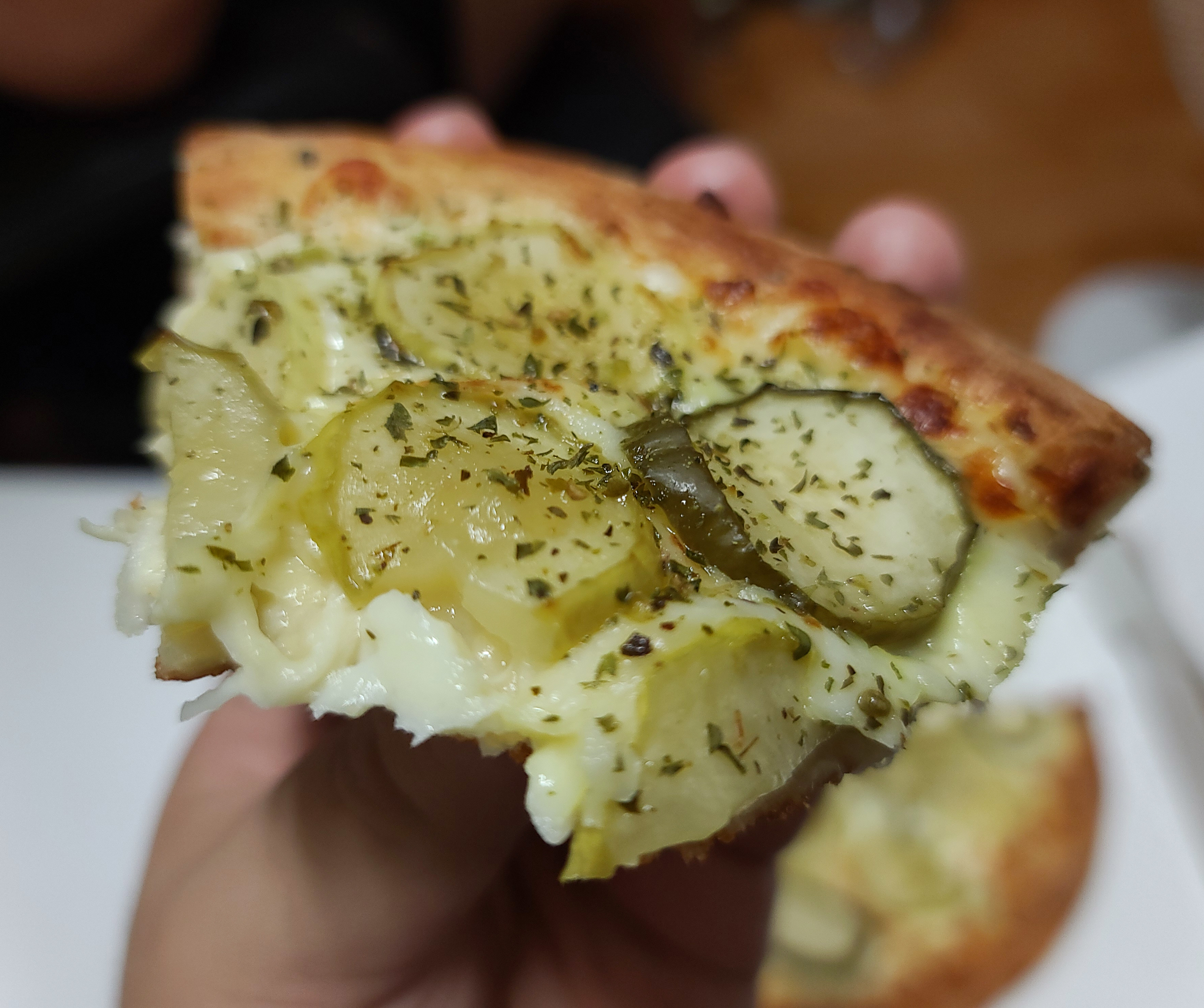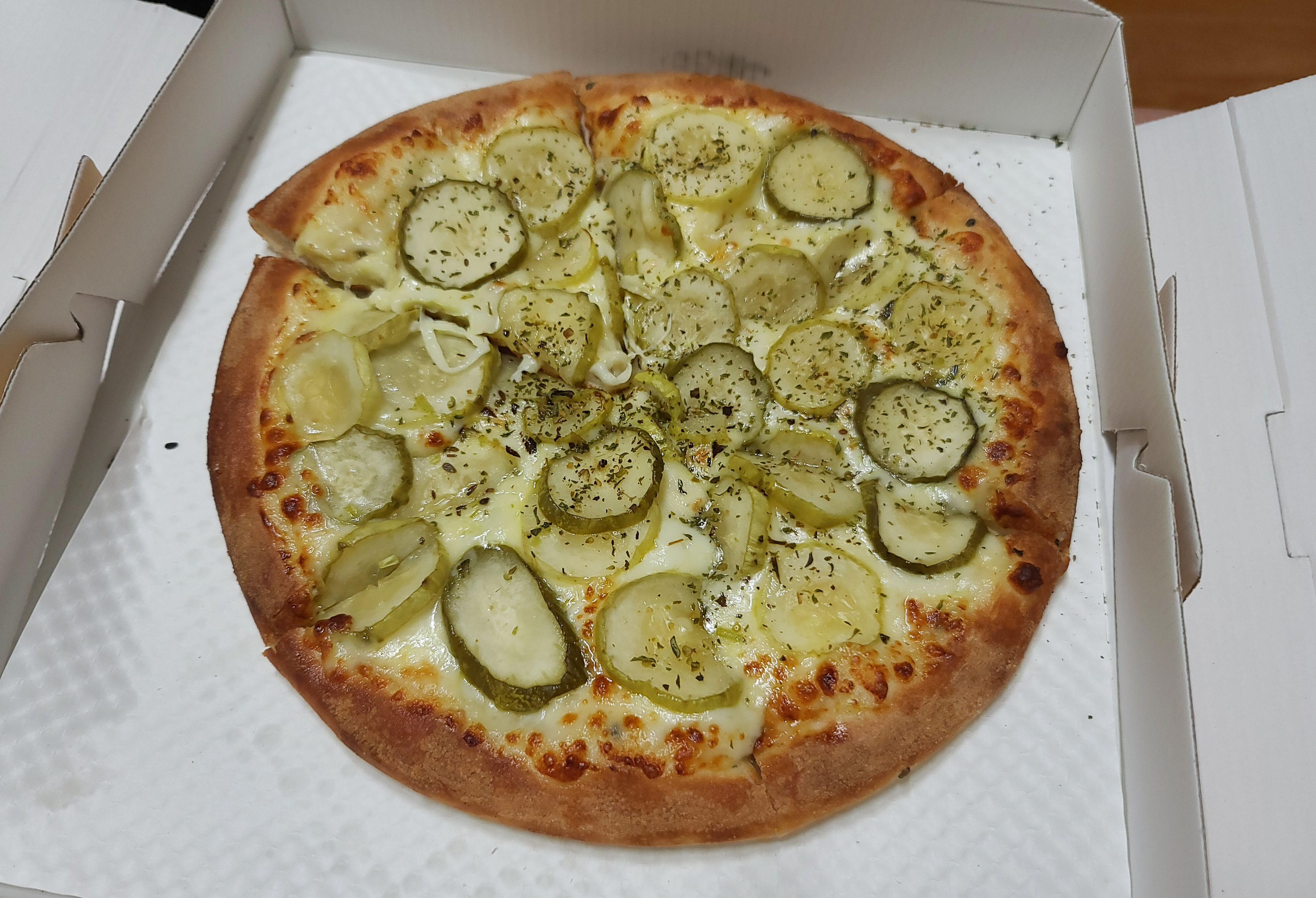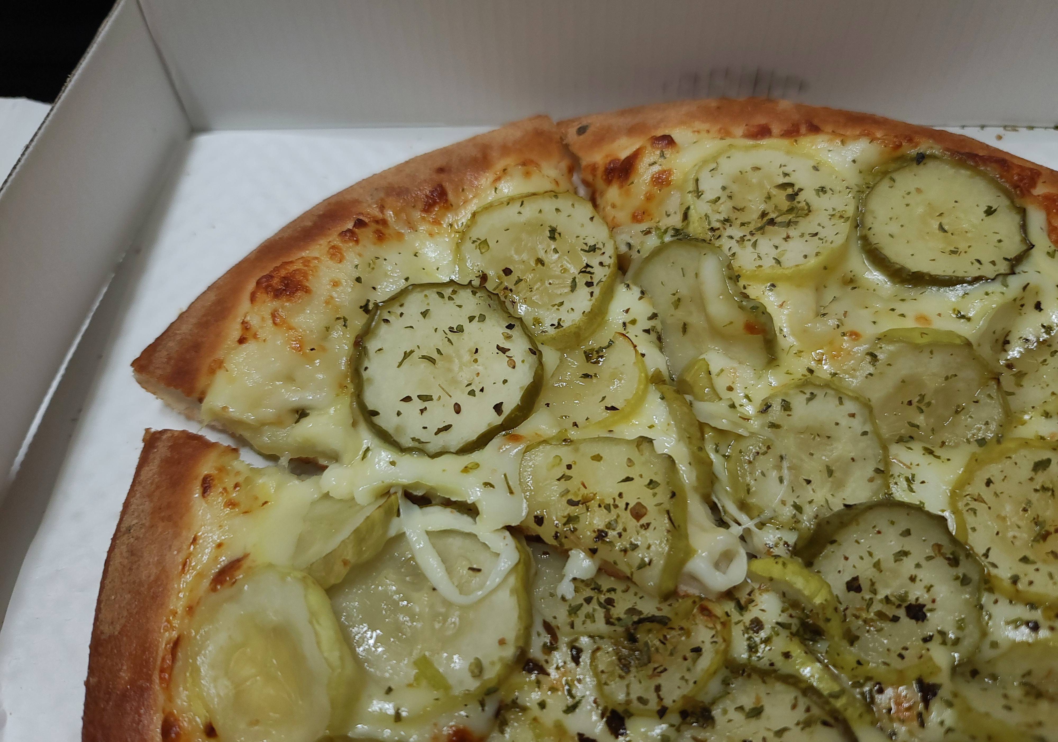 피자위에 토핑 된 피클들은 보기만 해도 거부감이 들었지만, 실제로 들고 먹어보니 의외로 나쁘지 않더라고요. 제 소셜 미디어에 게시글로 공유하니 친구들의 반응은 "기괴하다" 고 하기도 하고 "맛있냐?" 는 반응들이 많았습니다. 솔직히 말하자면 정말 의외로 맛있어서 놀랐습니다.