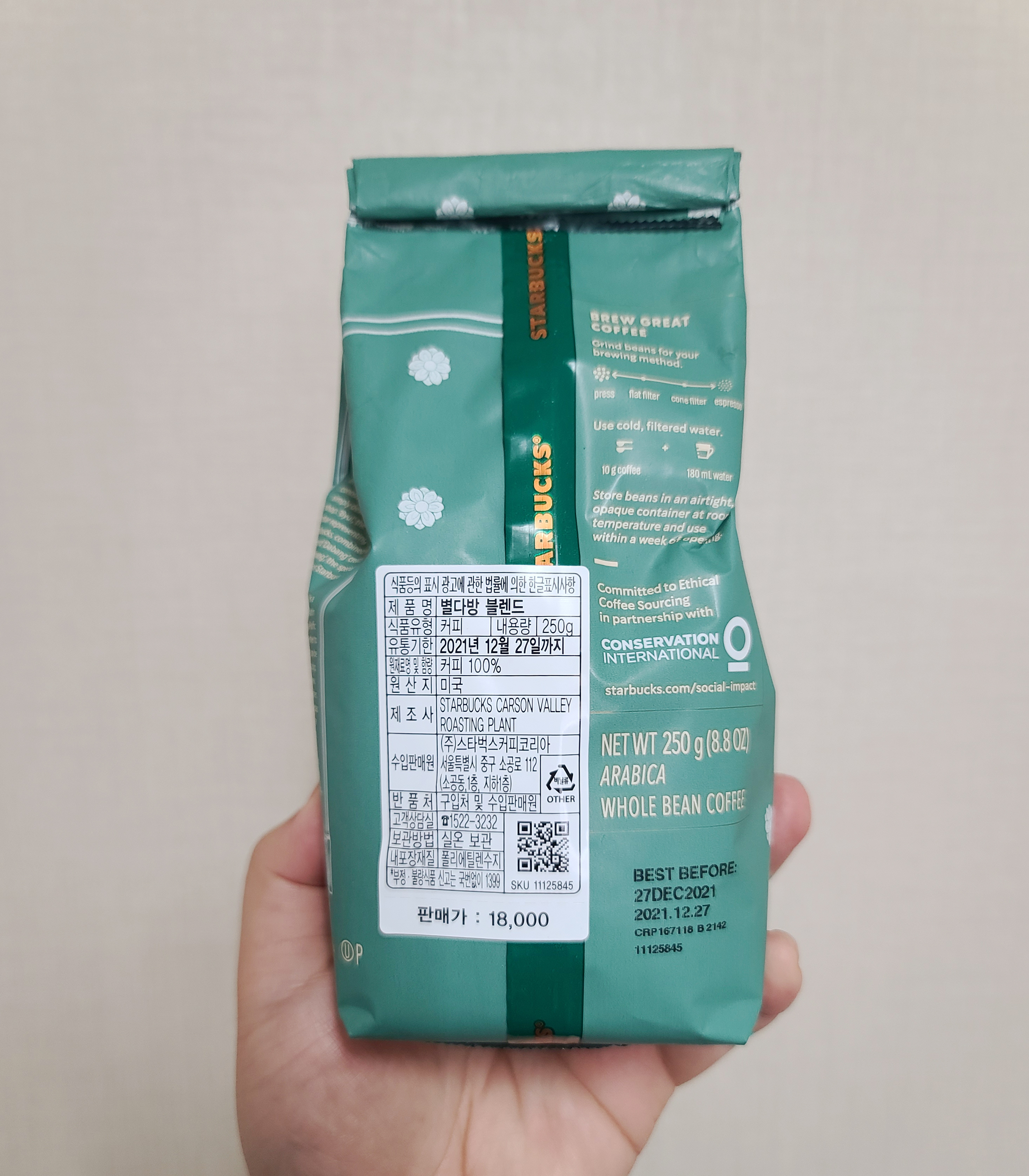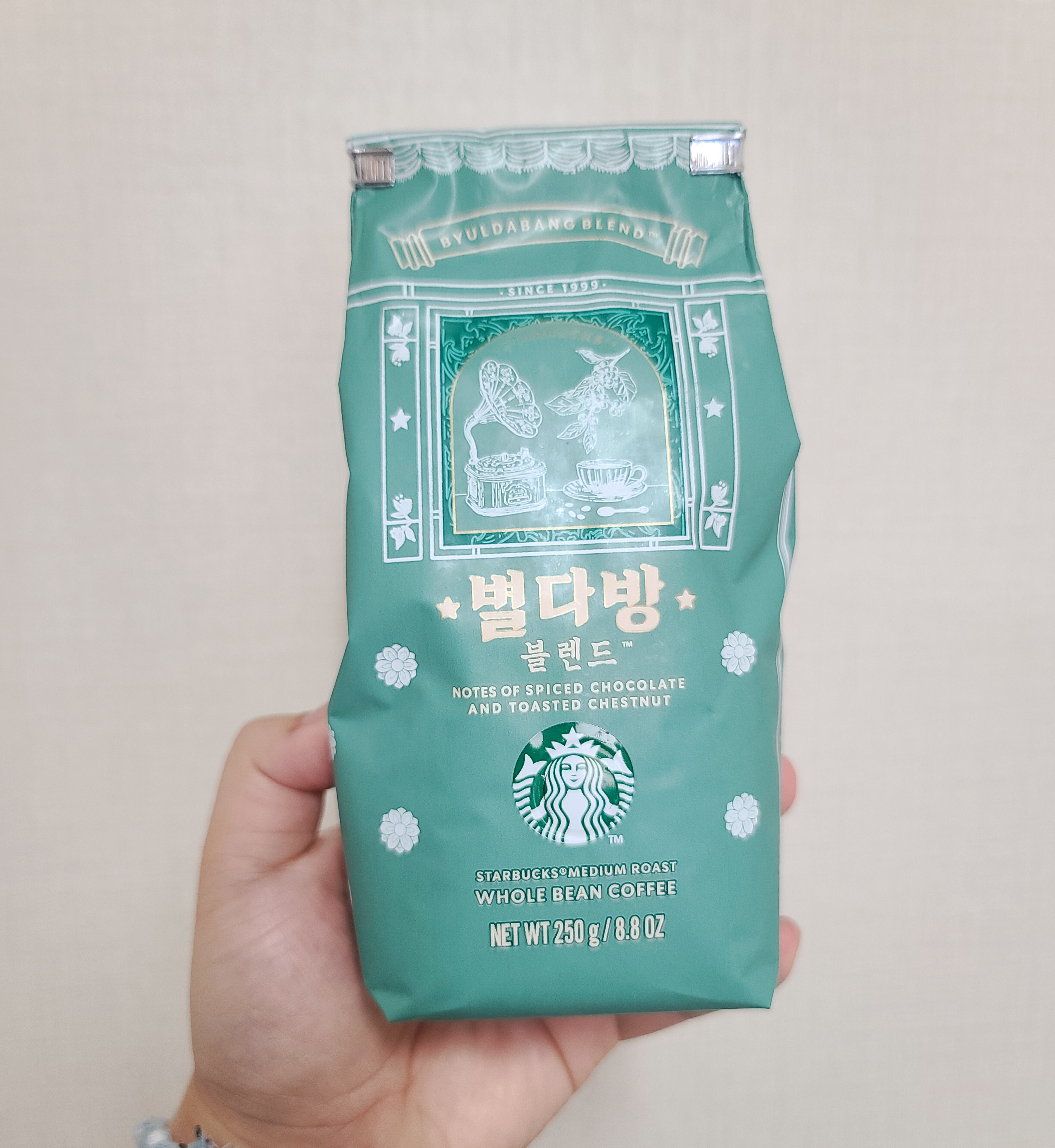 스타벅스 별다방블렌드는 스타벅스커피 코리아에서만 만날 수 있는 특별한 원두로, 라틴 아메리카 원두와 아시아 태평양 원두를 함께 로스팅하여 만들었다고 합니다. 커피의 맛은 말린 허브의 은은한 향과 풍부한 초콜릿의 향, 구운 체스트넛의 고소한 풍미와 더불어 기분 좋은 산미와 부드러운 바디까지 담겨있다고 합니다. 스타벅스 별다방 블렌드 원두의 가격은 18,000원 이었습니다.