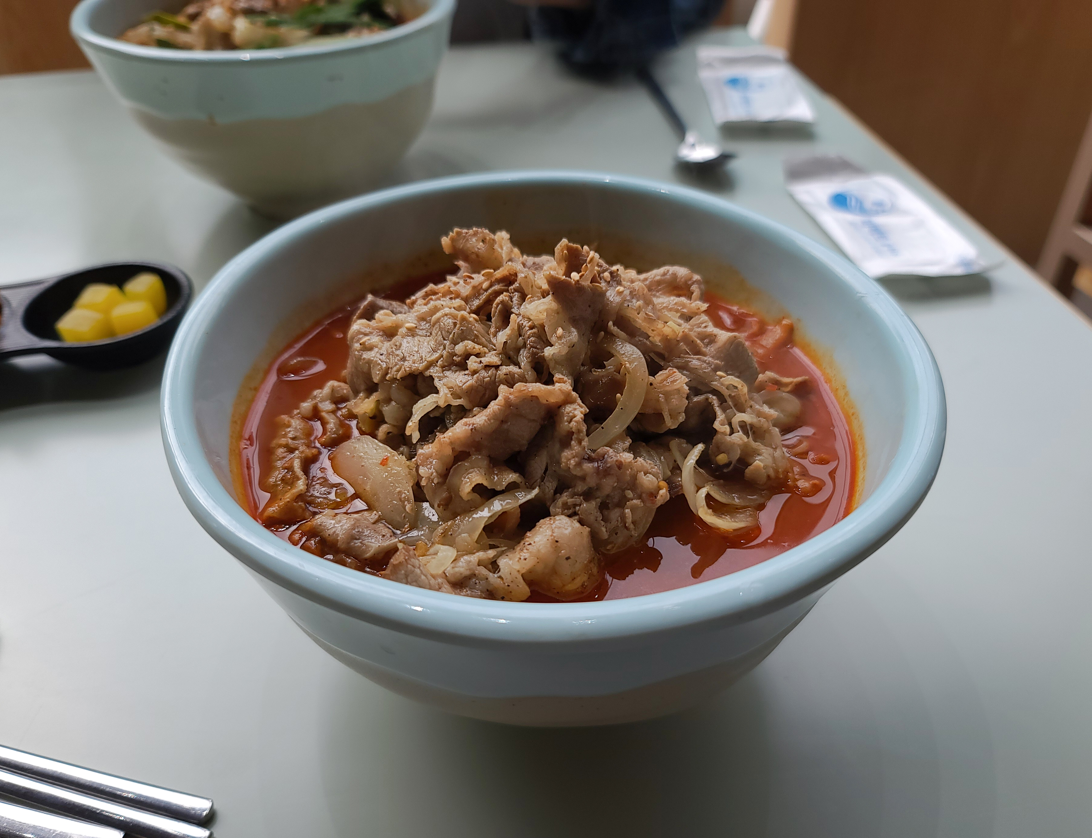 반찬은 셀프코너에서 직접 가져다 먹을 수 있도록 되어있었고, 자차이와 단무지를 반찬으로 제공하고 있었습니다. 자차이는 마치 오이지 같은 아삭아삭하는 식감이 있는 채소 절임인데 직접 담근 건지 맛있더라고요.