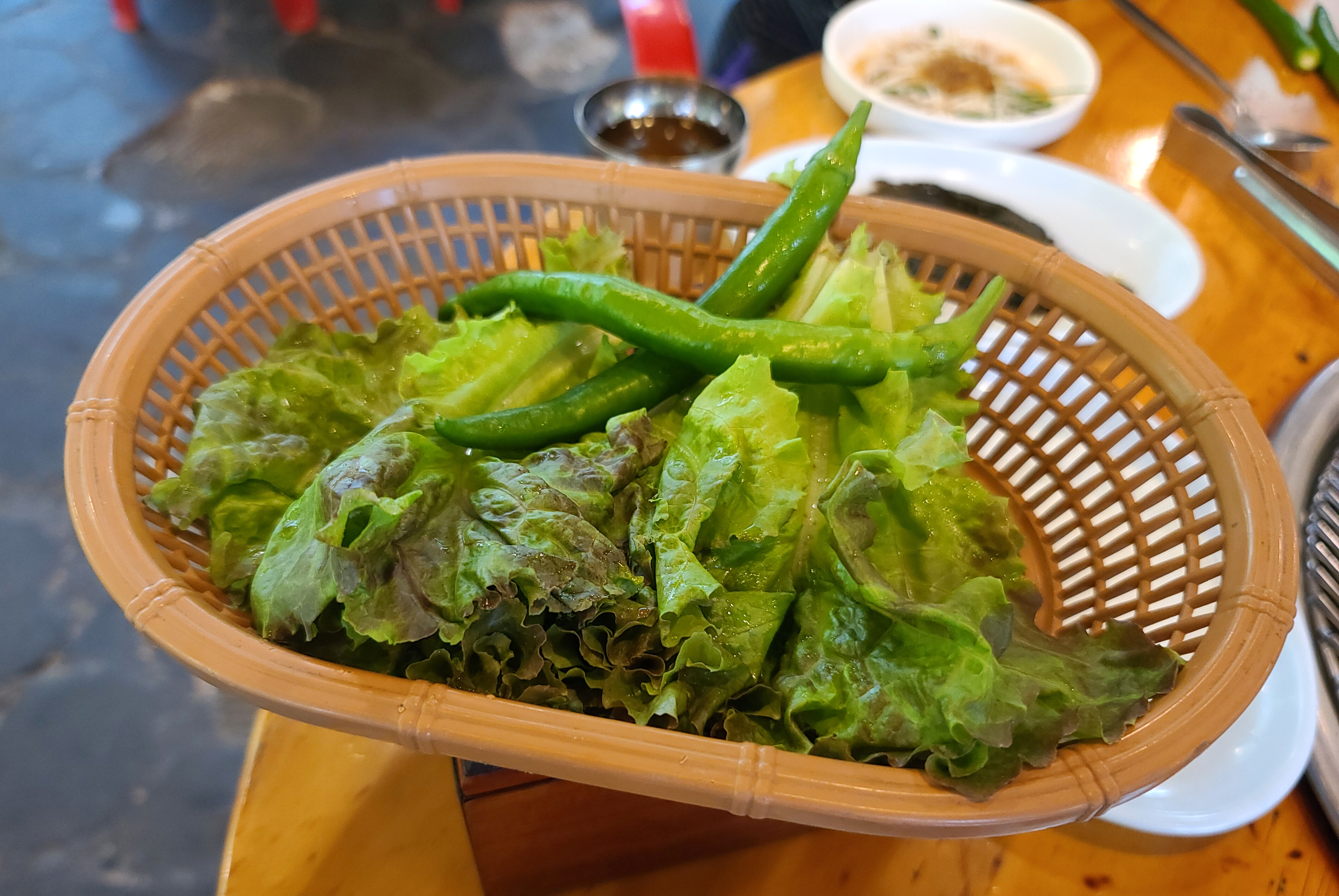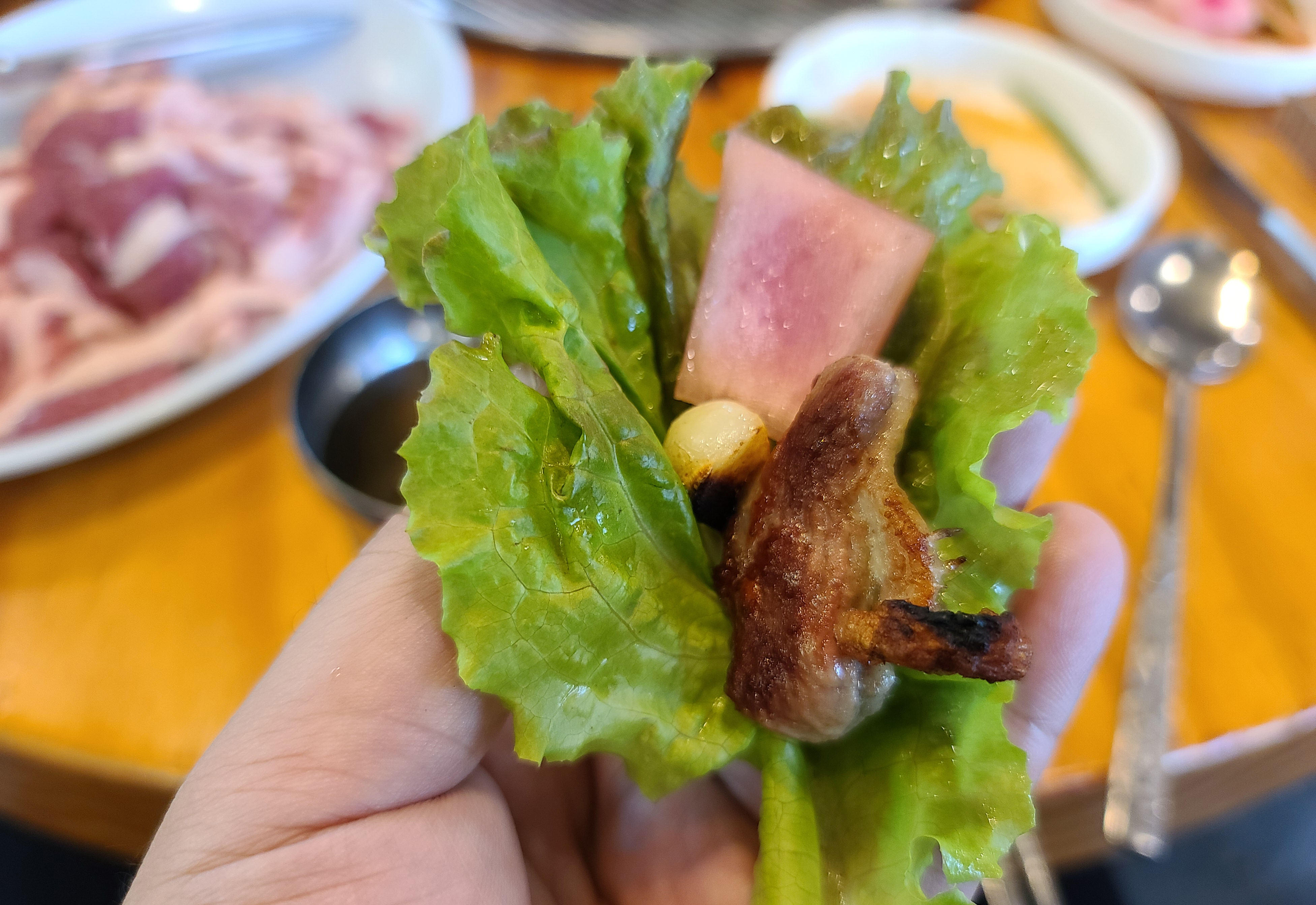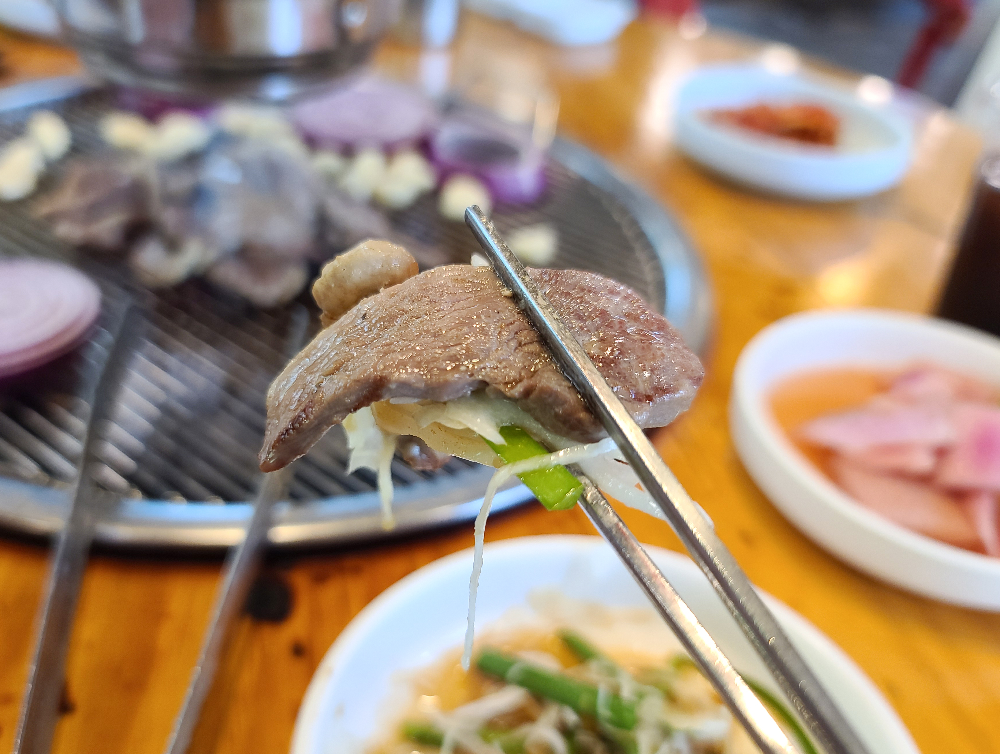 사실 가나안덕 숯불 오리구이 전문점을 일산에서도 다녀왔는데, 저는 개인적으로 하남점이 더 맛있는 것 같더라고요. 적양파도 불판 위에 올려서 같이 먹고, 양배추 샐러드와도 곁들여 먹고요. 쌈채소에 싸 먹는 것도 맛있었습니다.
