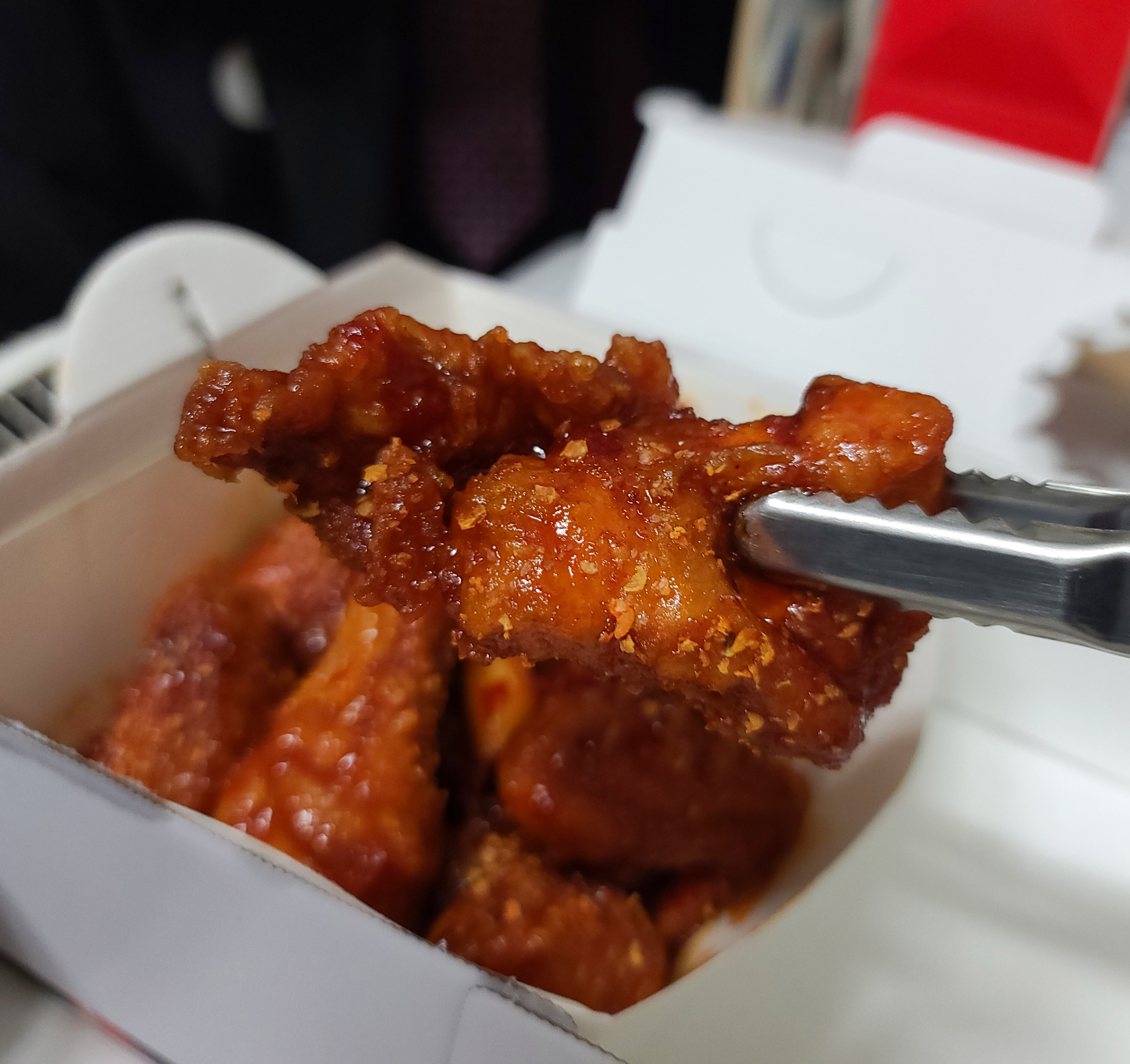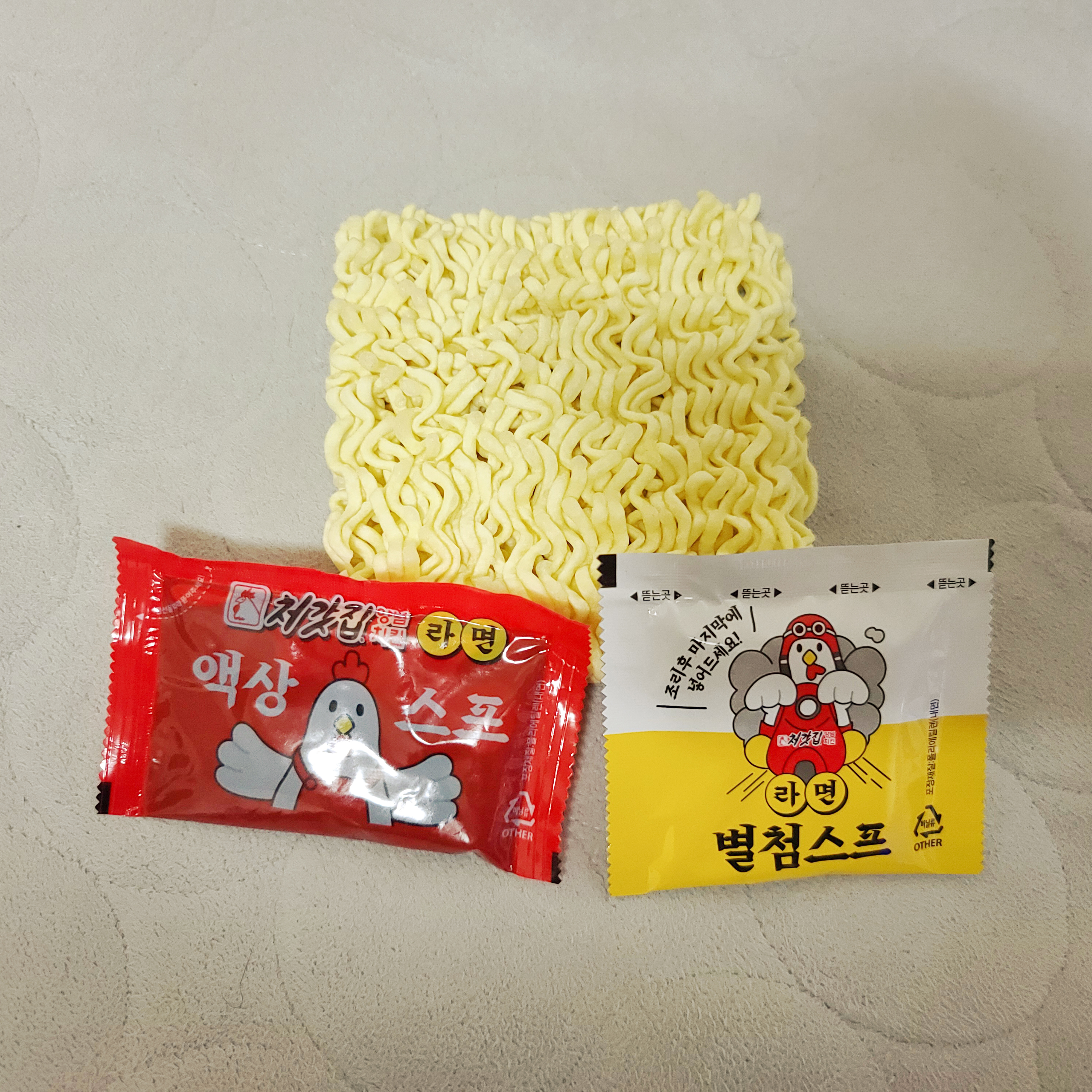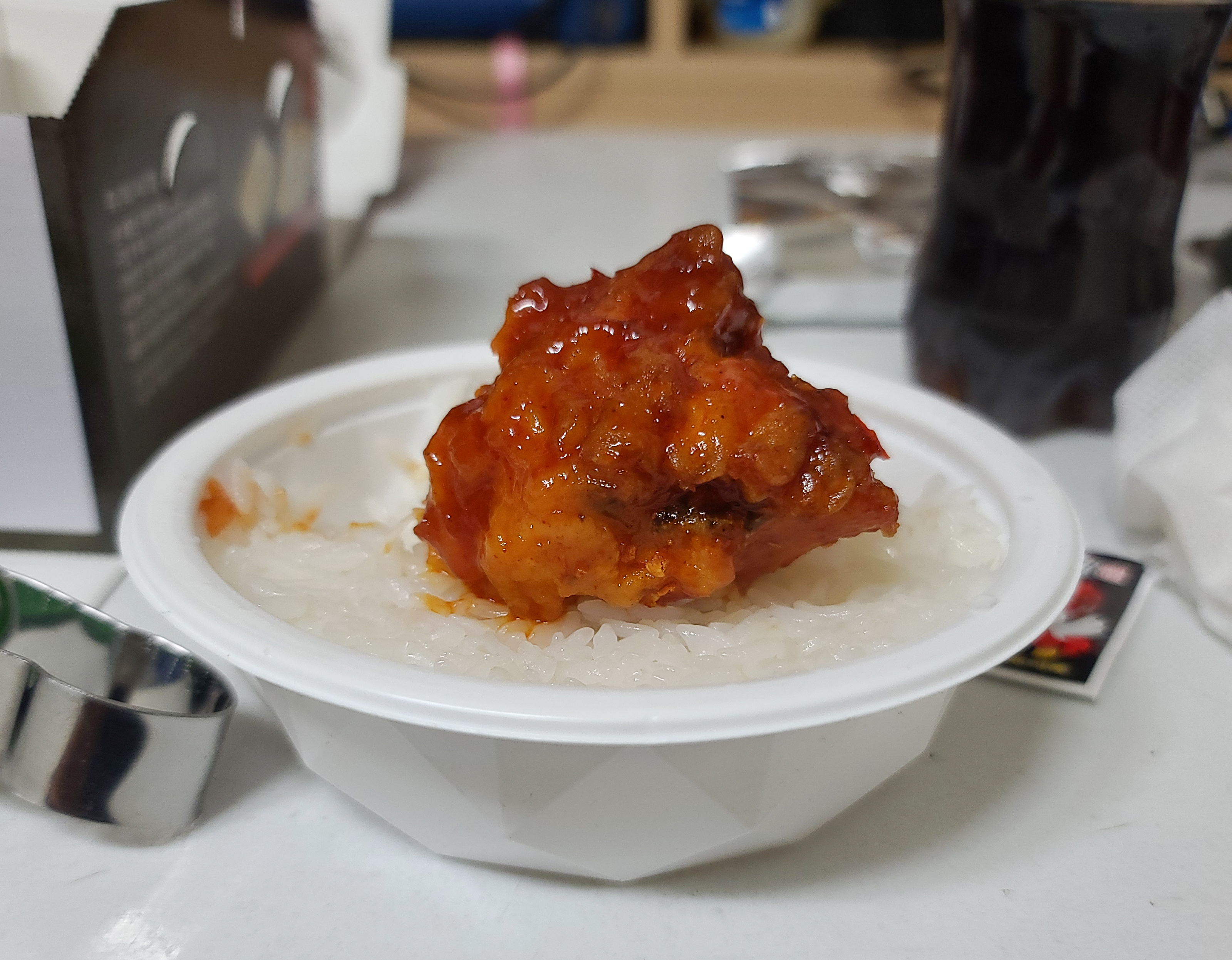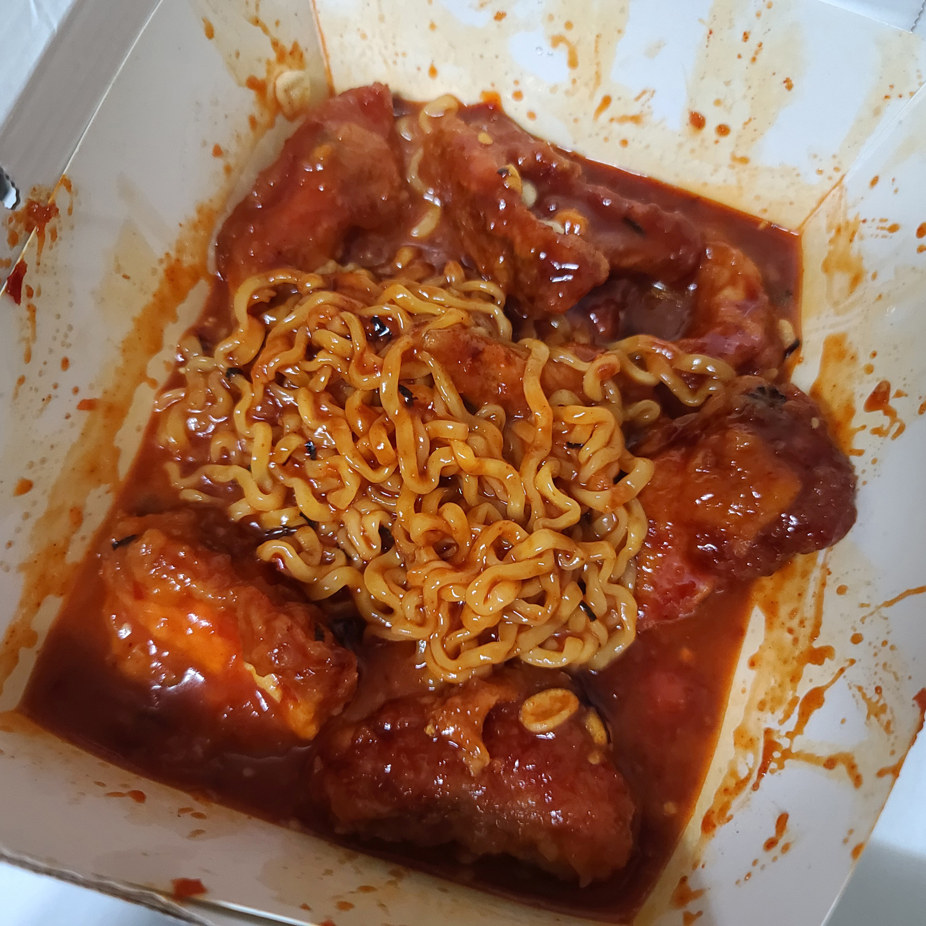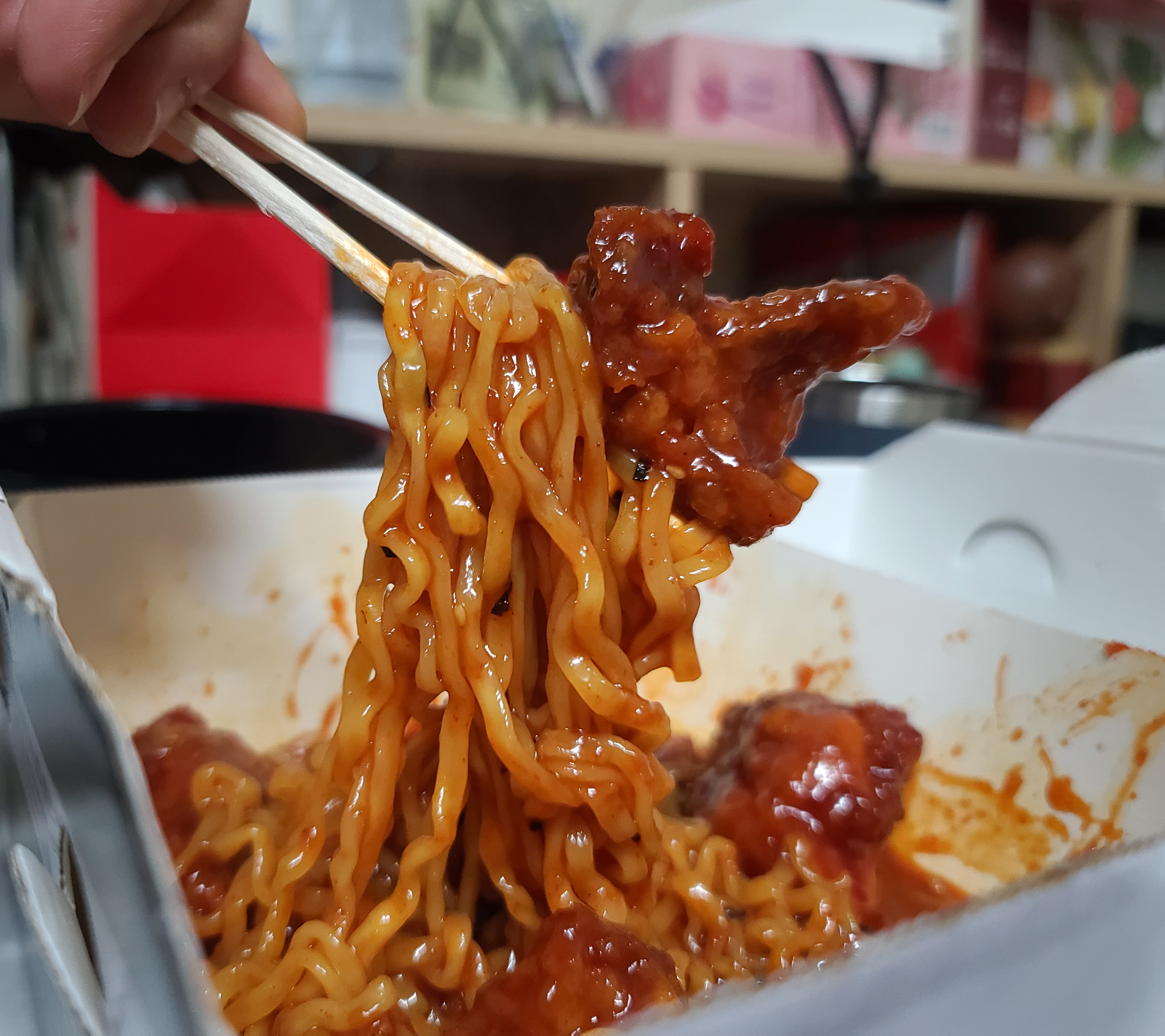 청양산 고추치킨 양념은 은근 중독성 있어서 치밥이나 치면으로도 어울릴 것 같더라고요. 그래서 갓 데운 햇반에 치킨을 함께 먹었죠. 햇반이랑 치킨도 꽤 잘 어울리더라고요. 물론 메뉴 주문할 때 같이 온 처갓집 양념치킨 라면도 잘 어울렸고요.