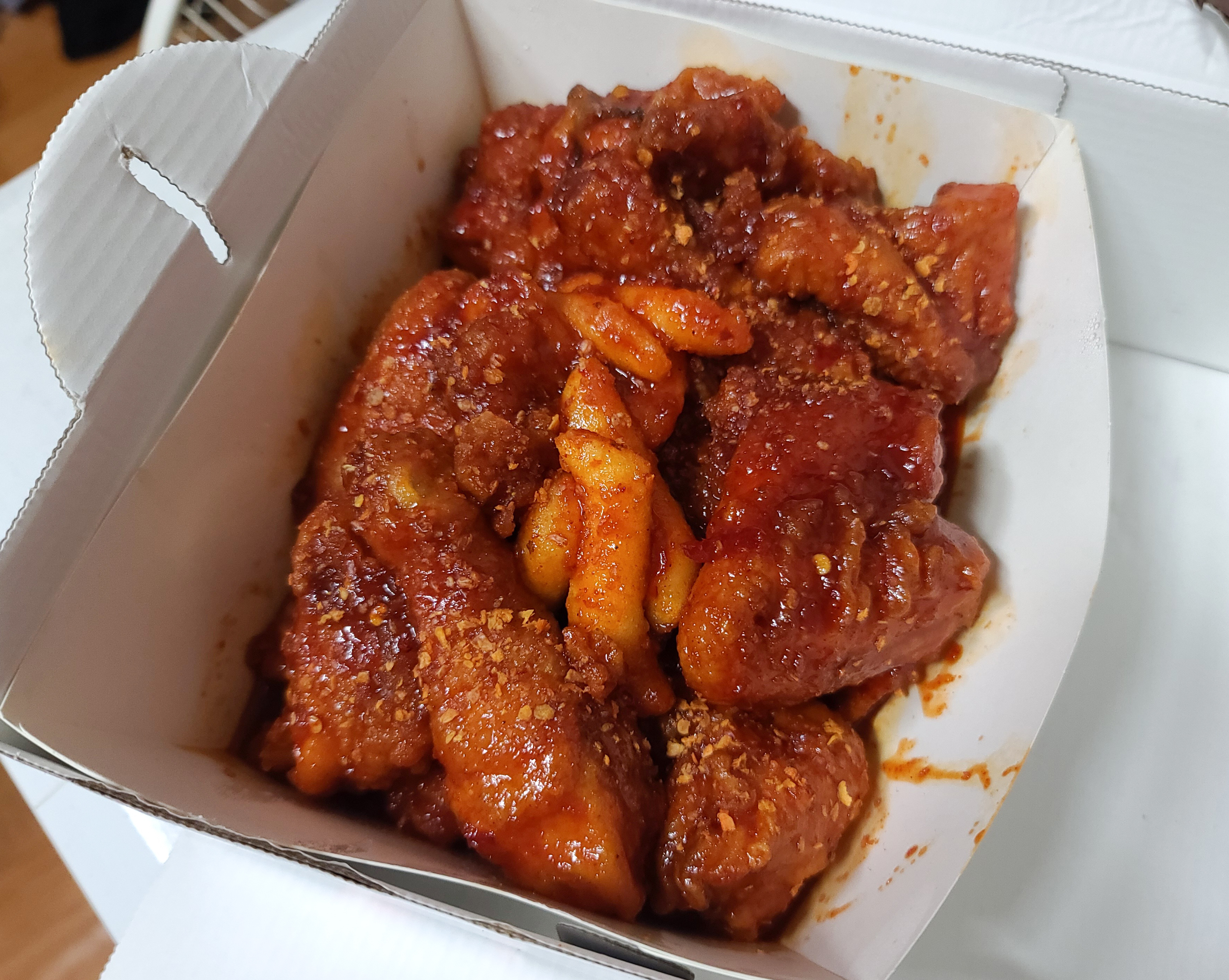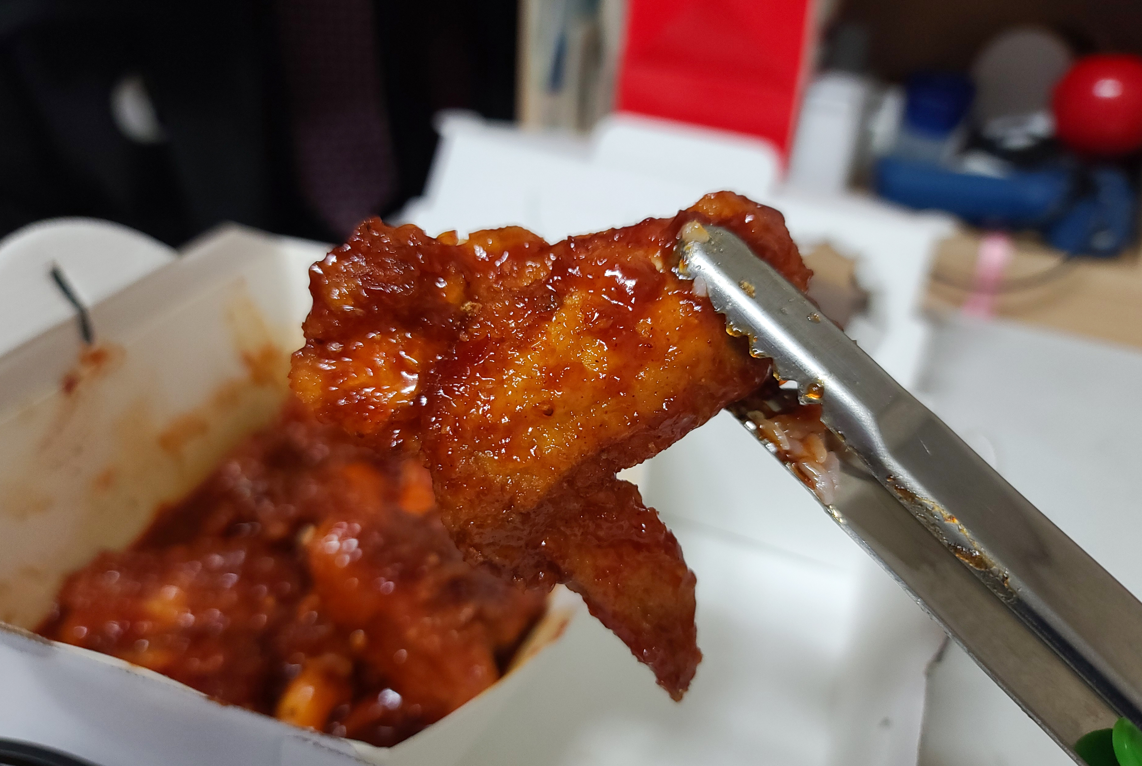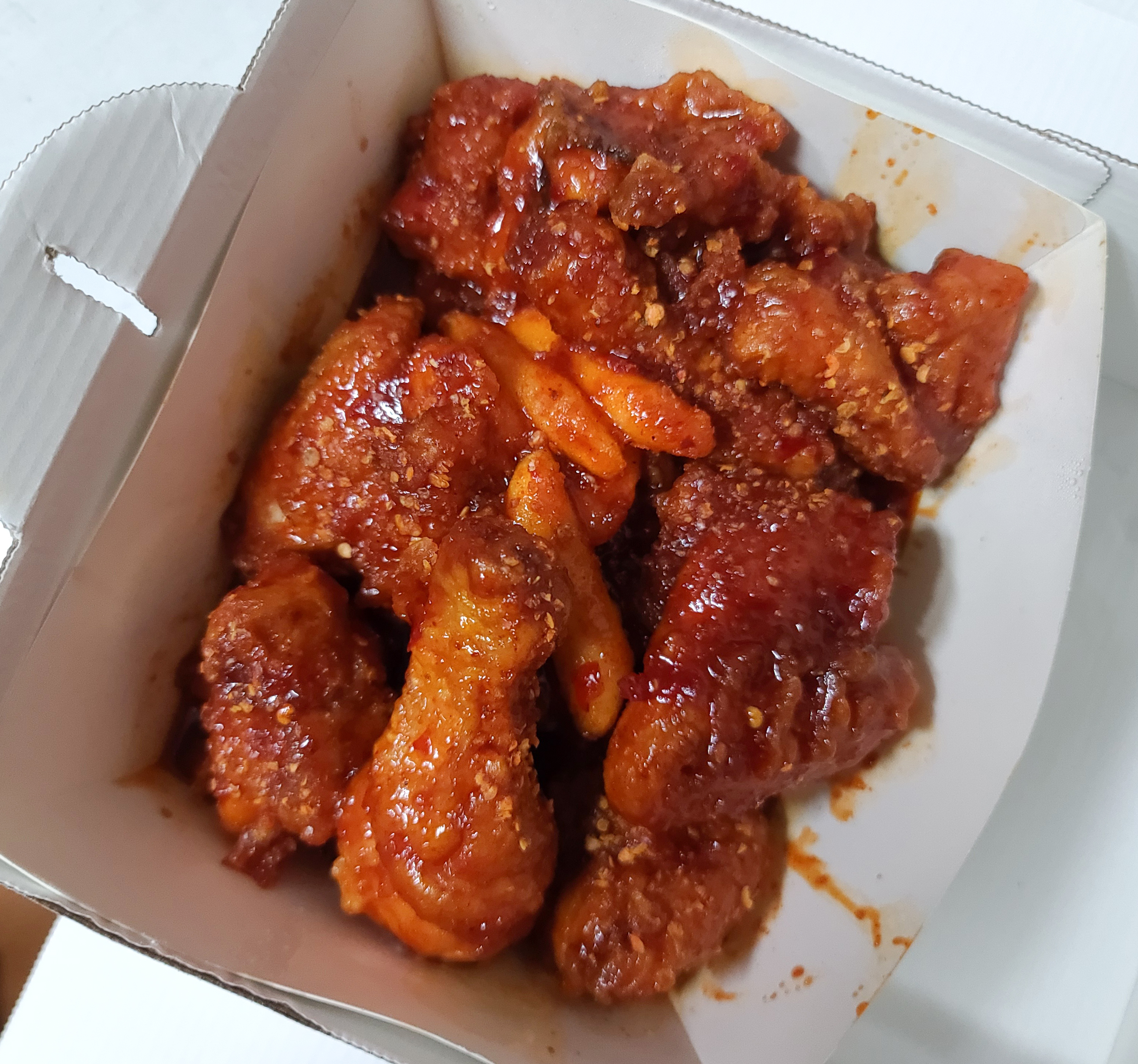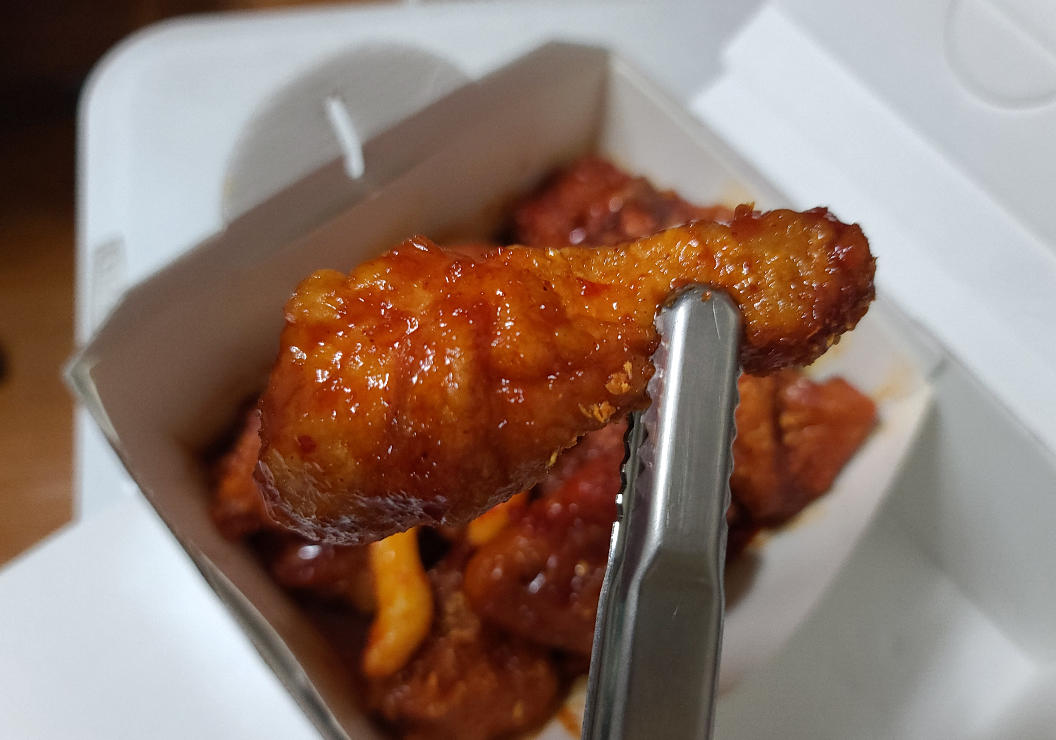 처갓집 양념치킨의 100% 청양산 고추치킨은 매콤한 양념에 튀긴 떡과 치킨이 잘 어우러진 메뉴였습니다. 기존의 처갓집 양념치킨 맛은 느껴지되 청양고추의 알싸한 매운맛이 더해진 치킨이었습니다. 처음 먹었을 때는 혀가 아리게 매운 느낌이었는데, 한두 점 먹다 보니 은근히 중독성 있는 게 자꾸만 먹게 되더라고요.