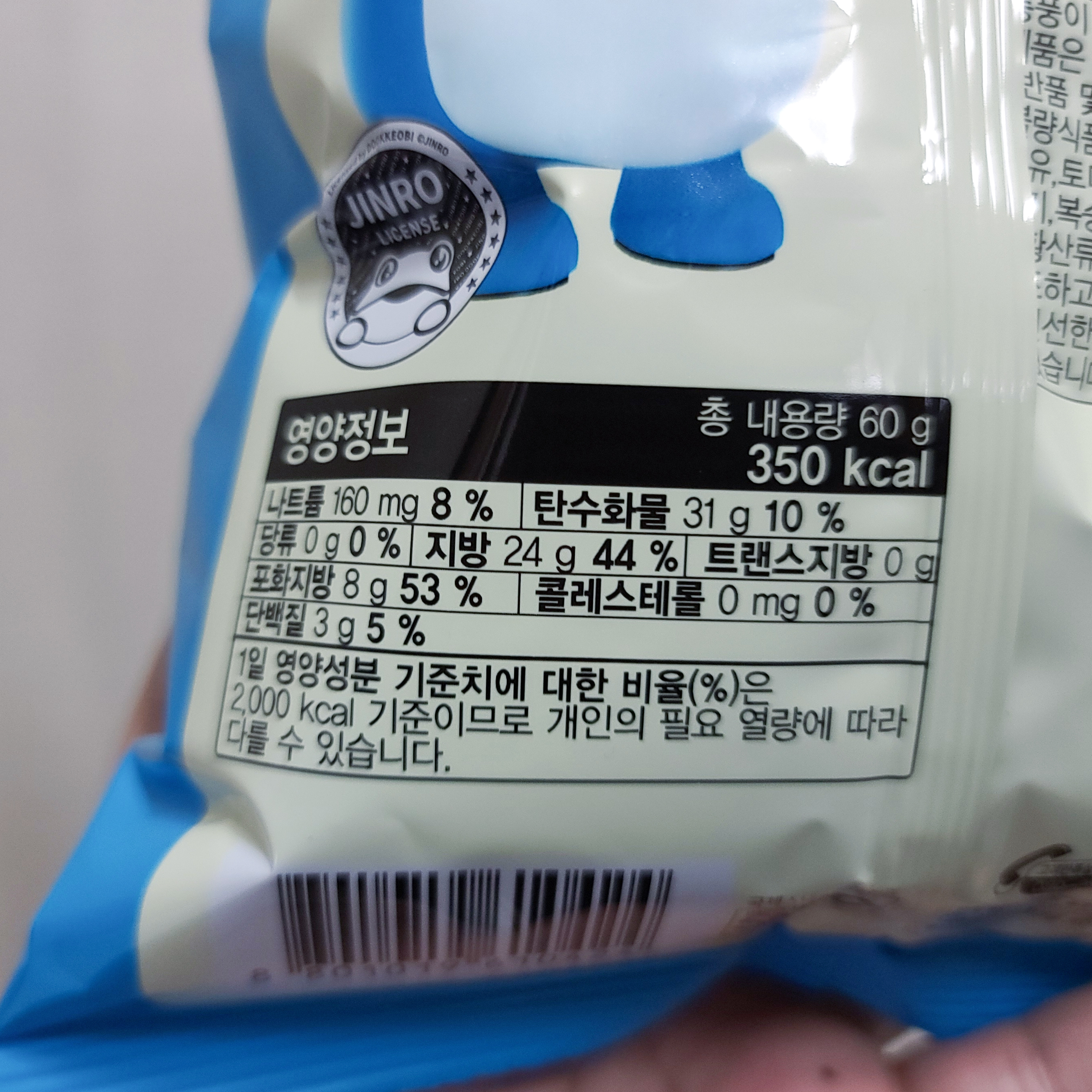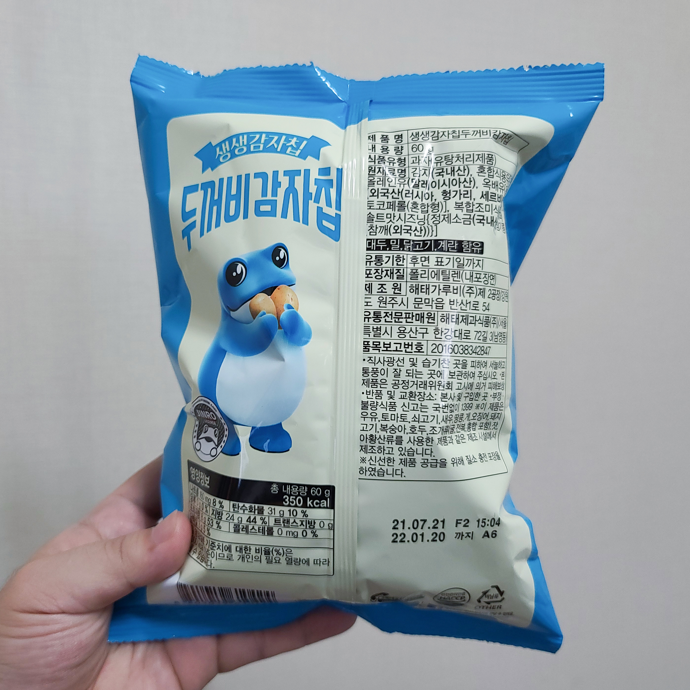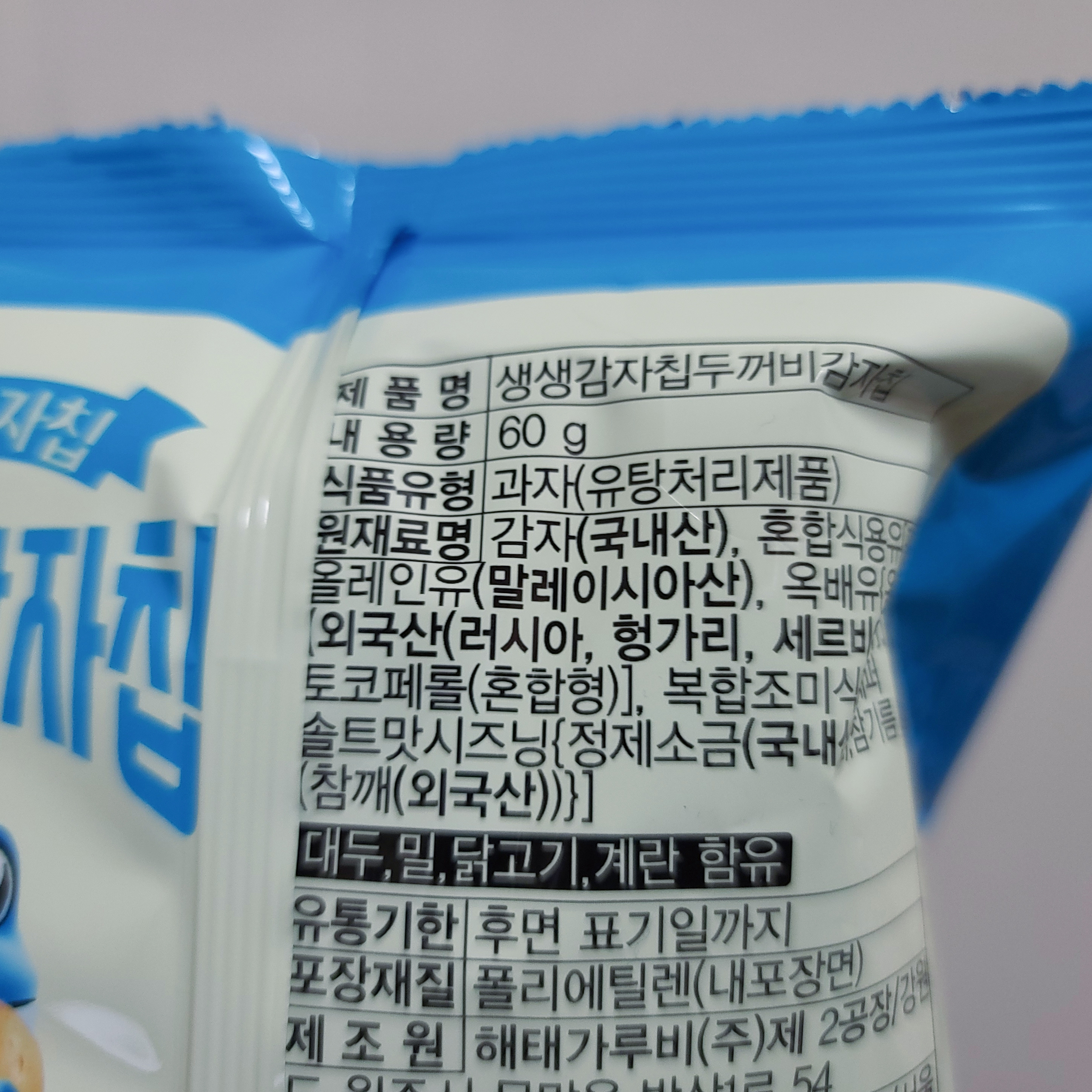 영양정보와 원재료명에 대한 정보는 이렇습니다. 두꺼비 감자칩은 총 내용량 60g에 열량은 350kcal 였습니다. 원재료명을 살펴보니 국내산 감자를 이용해 감자칩을 만든 것 같더라고요.