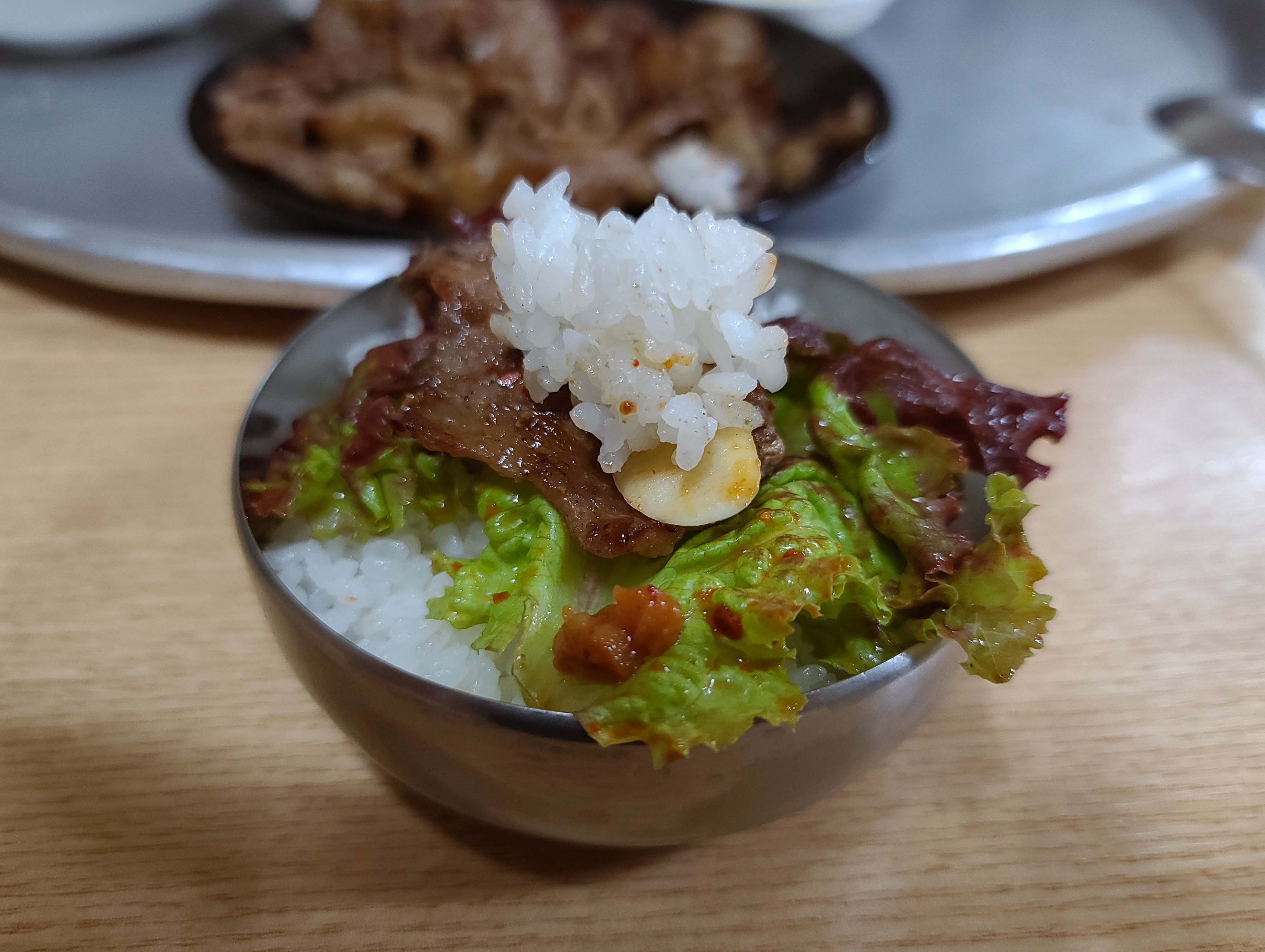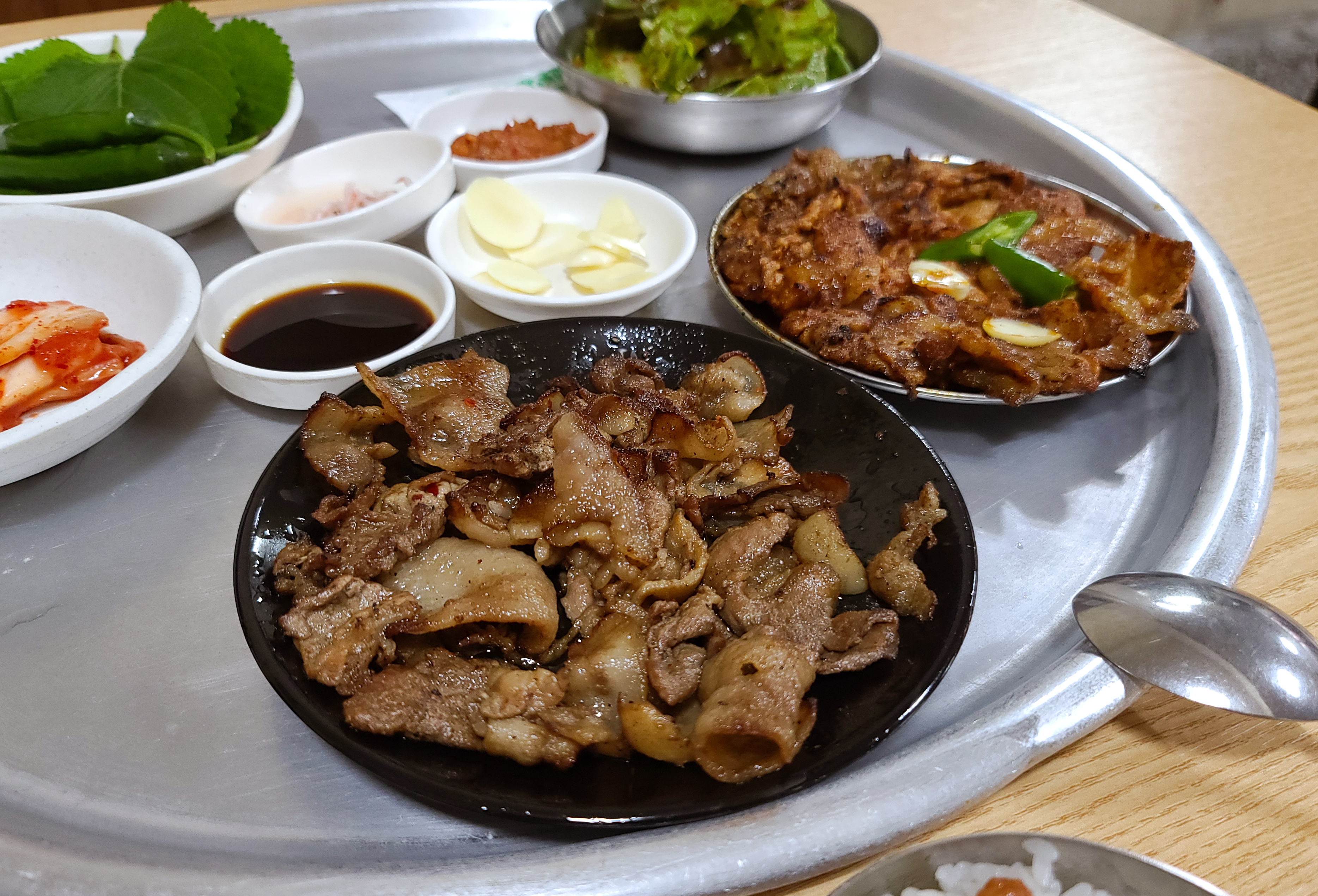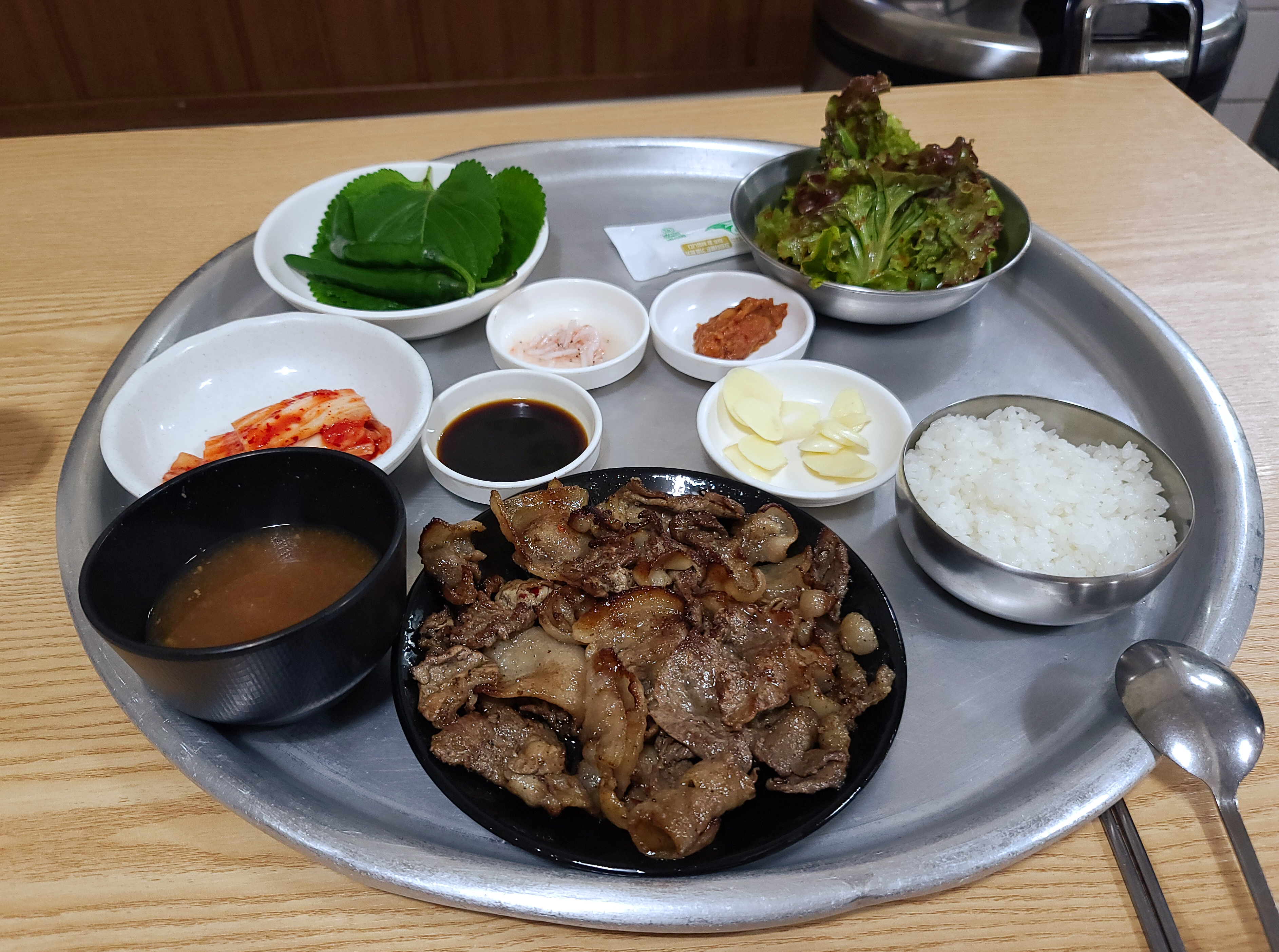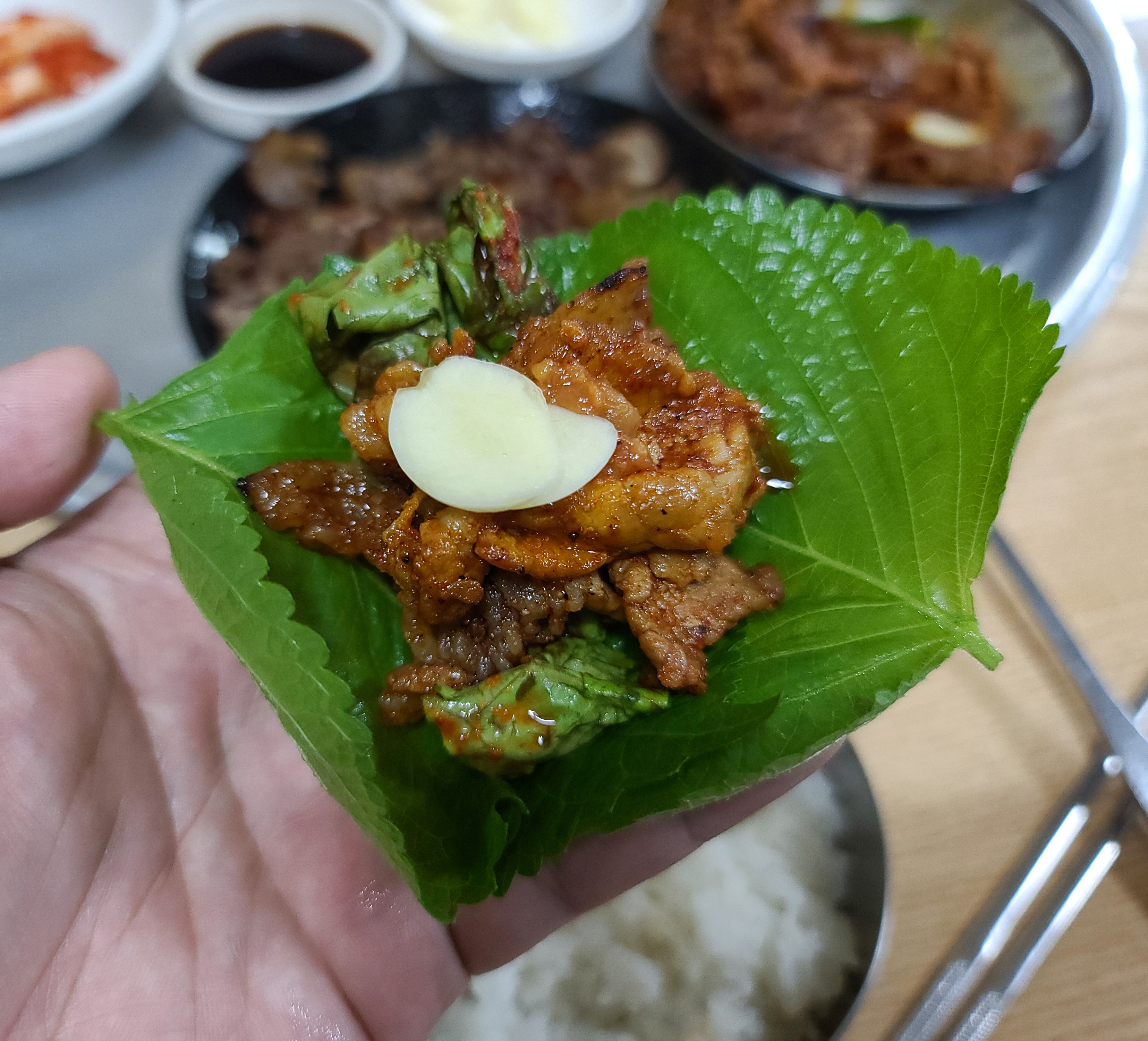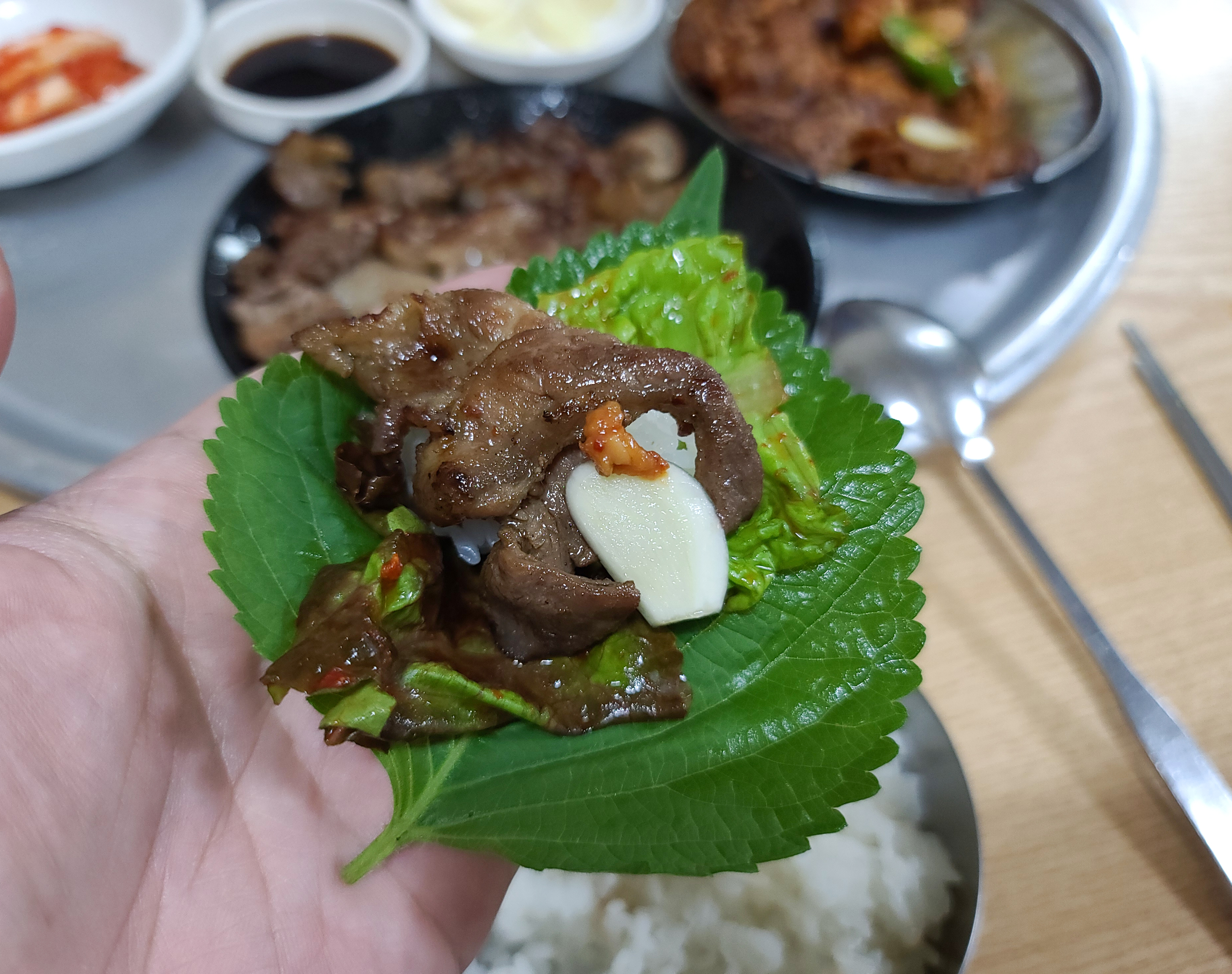 단골식당의 간장불고기를 쌈채소에 마늘과 쌈장과 밥까지 곁들여 쌈 싸 먹으니 더 맛있더라고요. 가격이 저렴해도 상추와 깻잎 둘 다 제공해주고 있어서 상추와 깻잎을 동시에 싸서 먹었죠.