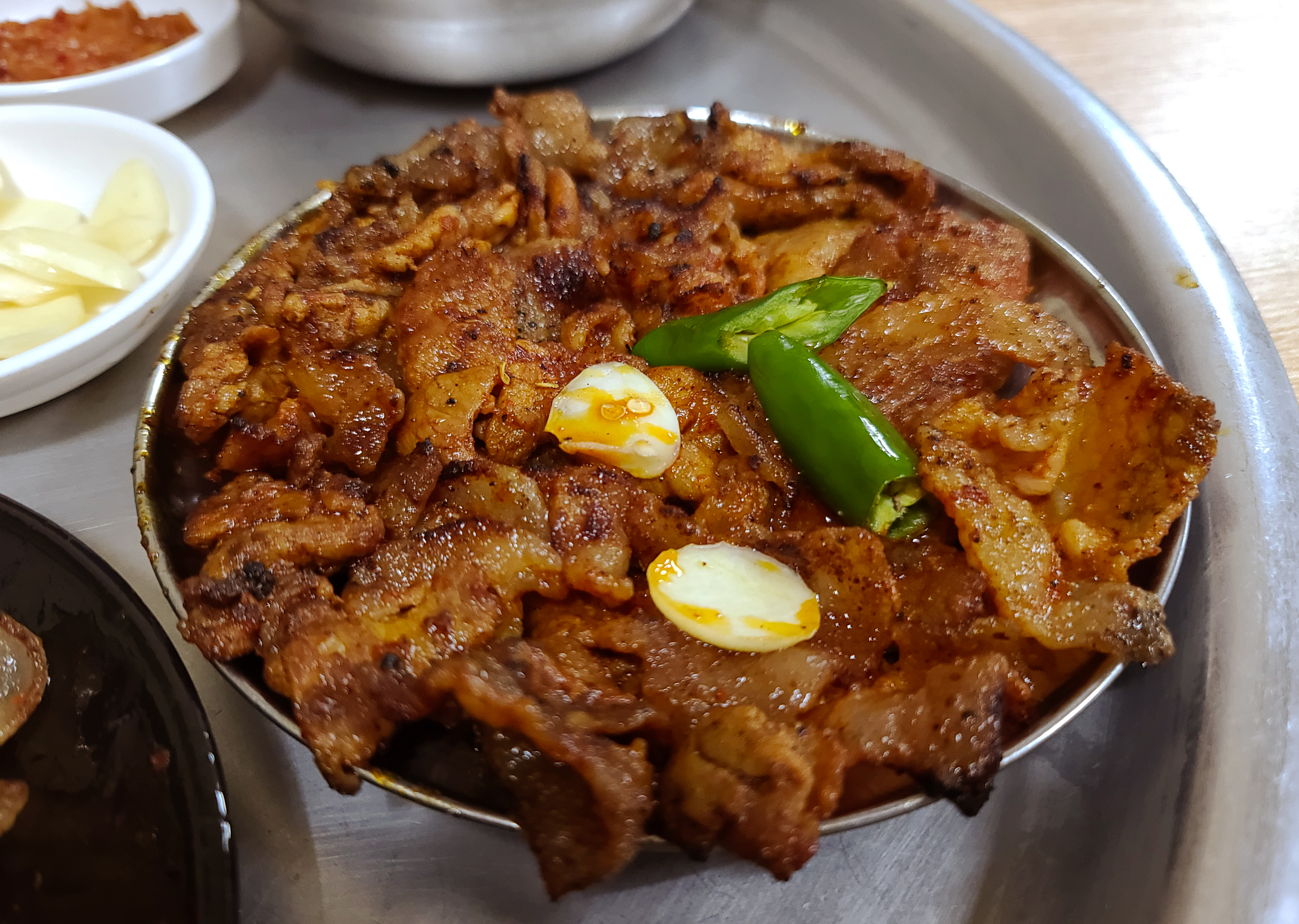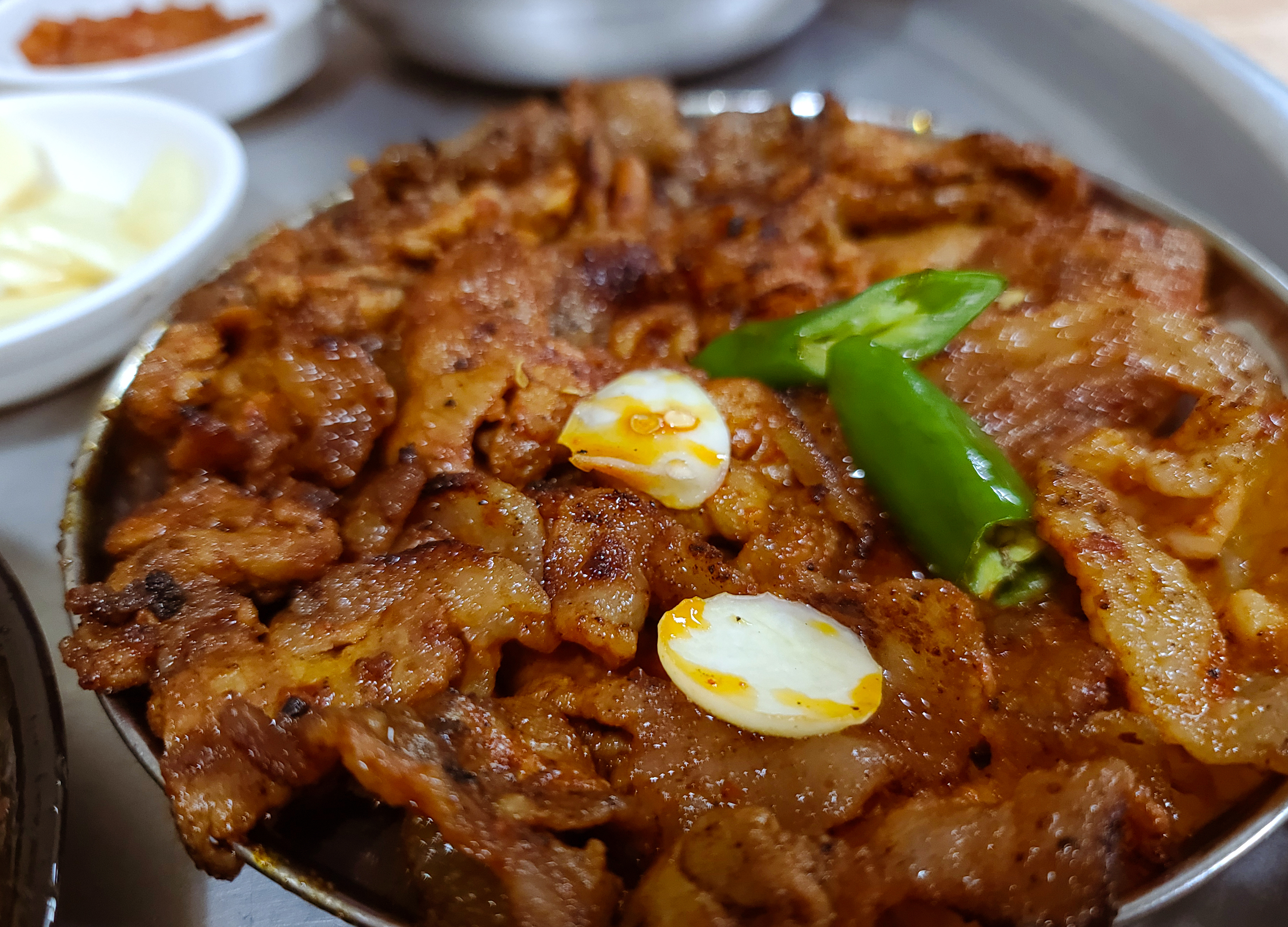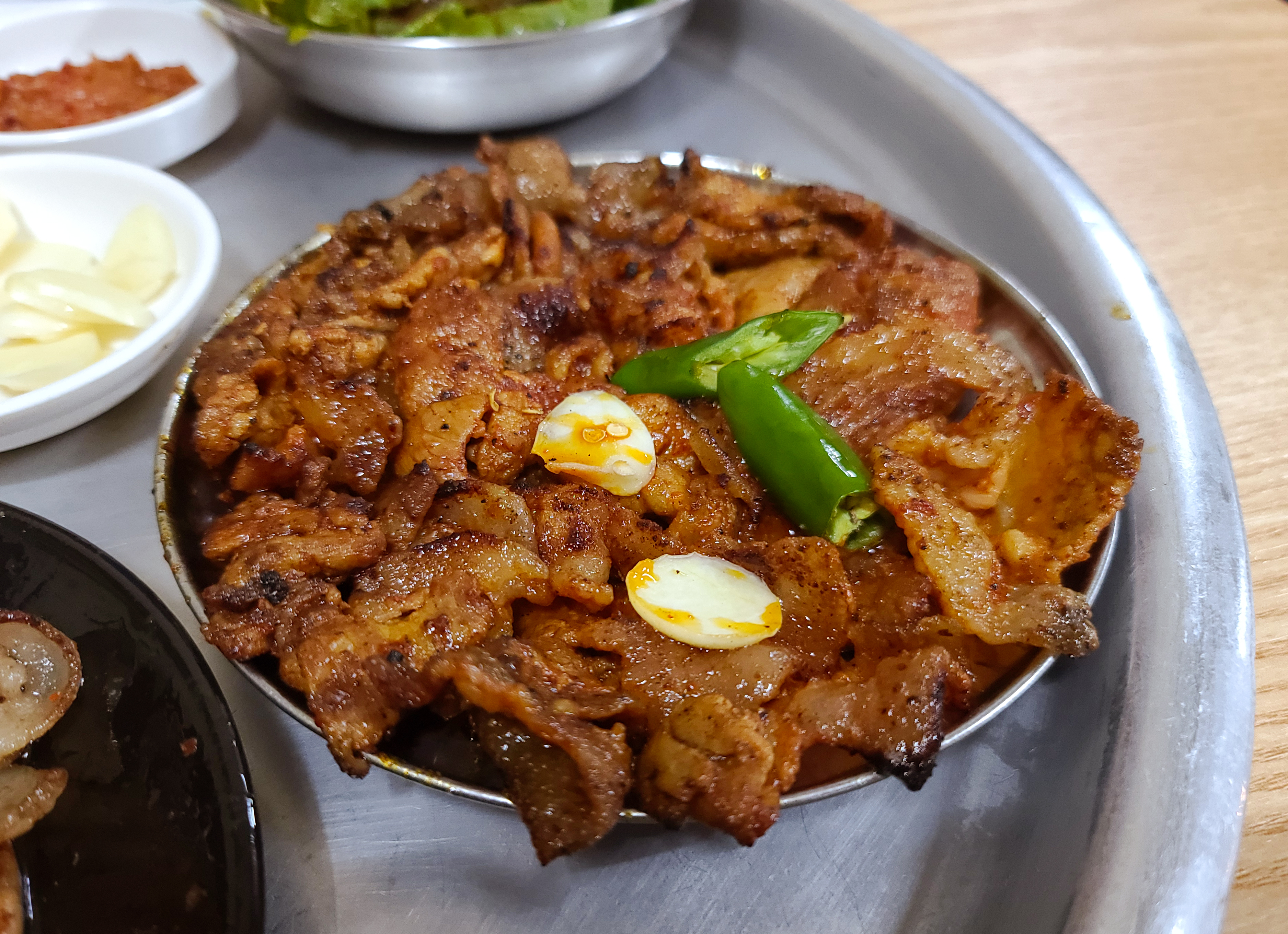 매콤한 맛의 고추장불고기도 단골식당의 별미였습니다. 고명으로 올라갔던 청양고추도 같이 곁들여서 한 쌈 해서 먹었습니다. 칠성시장 단골식당의 간장불고기도 맛있었지만 매콤한 음식이 당겼던 저는 고추장불고기를 더 맛있게 먹었던 것 같습니다.