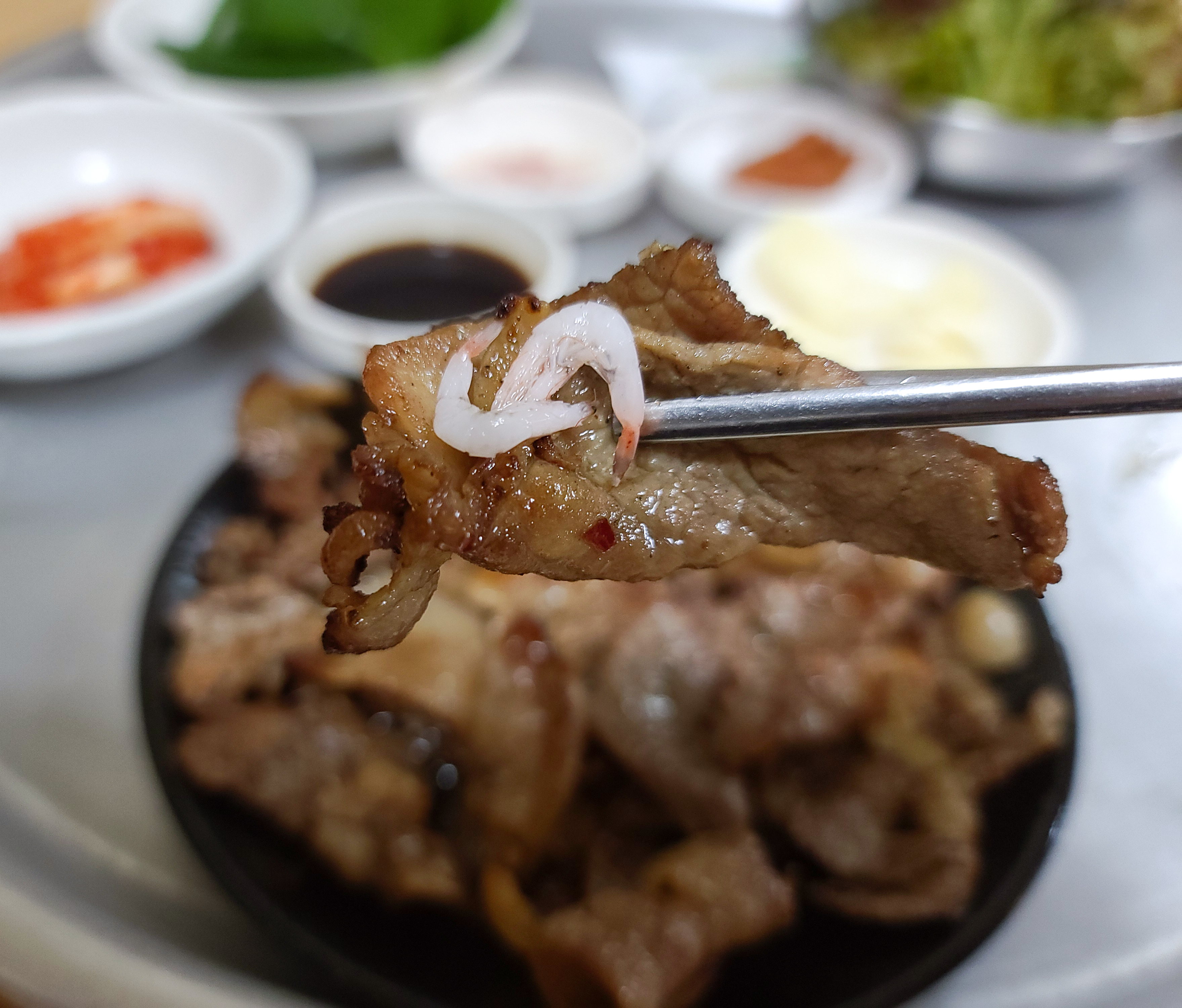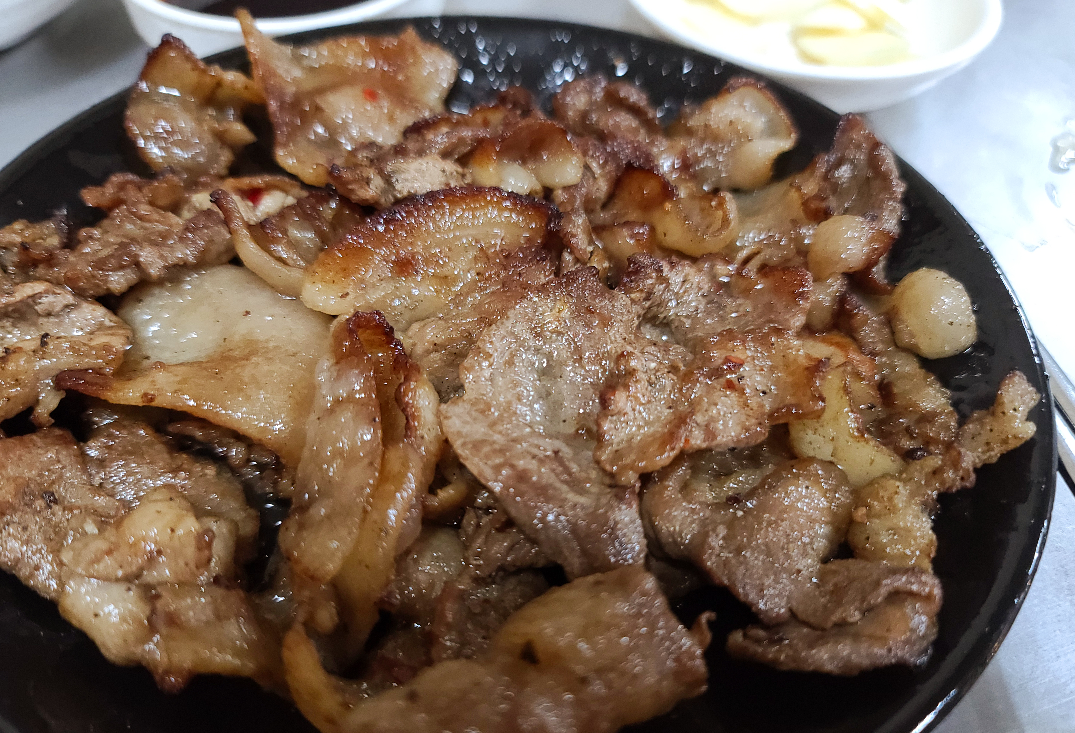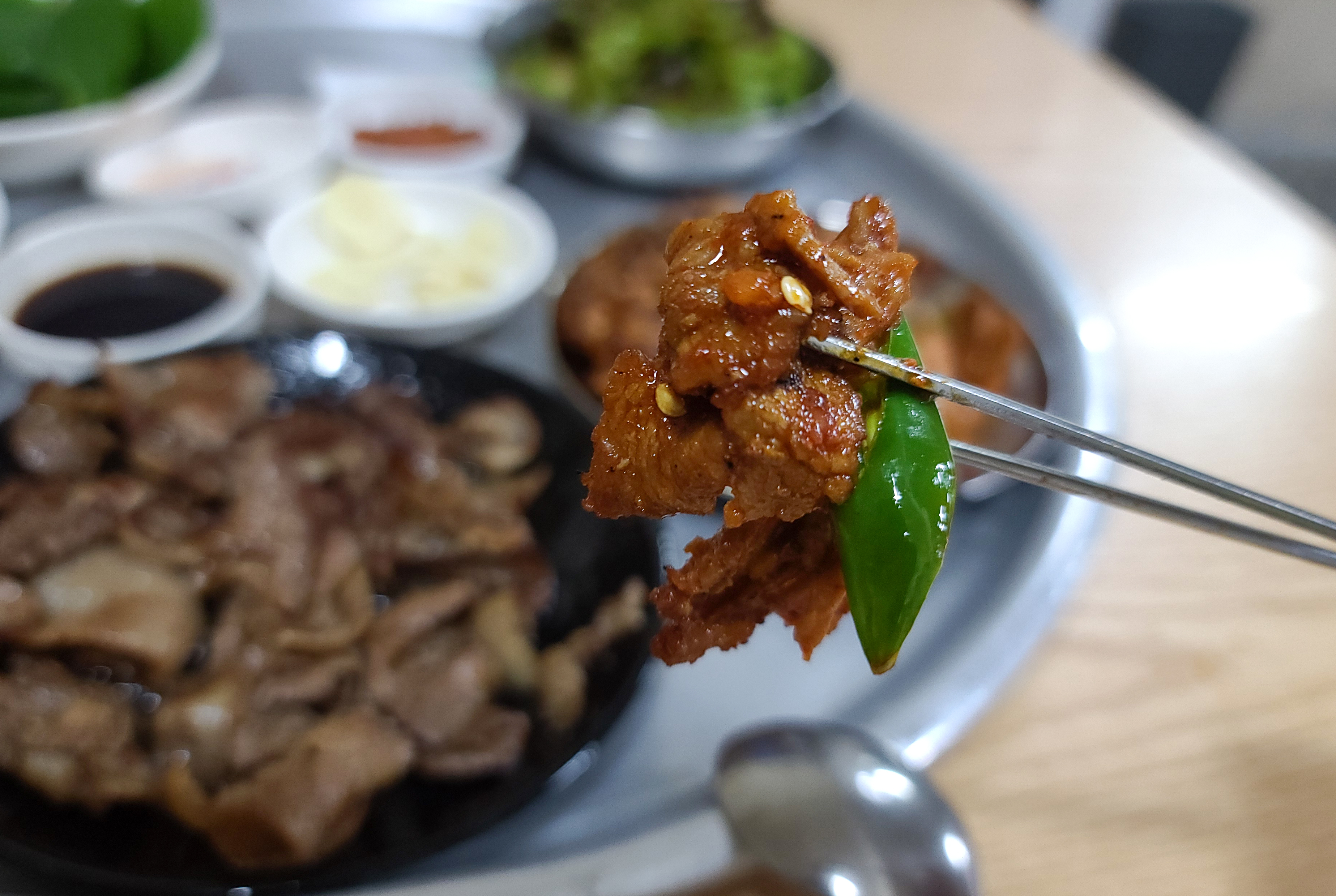 간장불고기의 모습은 이렇습니다. 얇은 돼지고기를 간장소스에 재워서 연탄불에 불맛 입혀 타지 않게 바싹 구워낸 불고기였는데, 담백하게 새우젓과 먹어도 좋았고, 같이 나온 쌈채소와 싸서 먹어도 맛있었습니다.