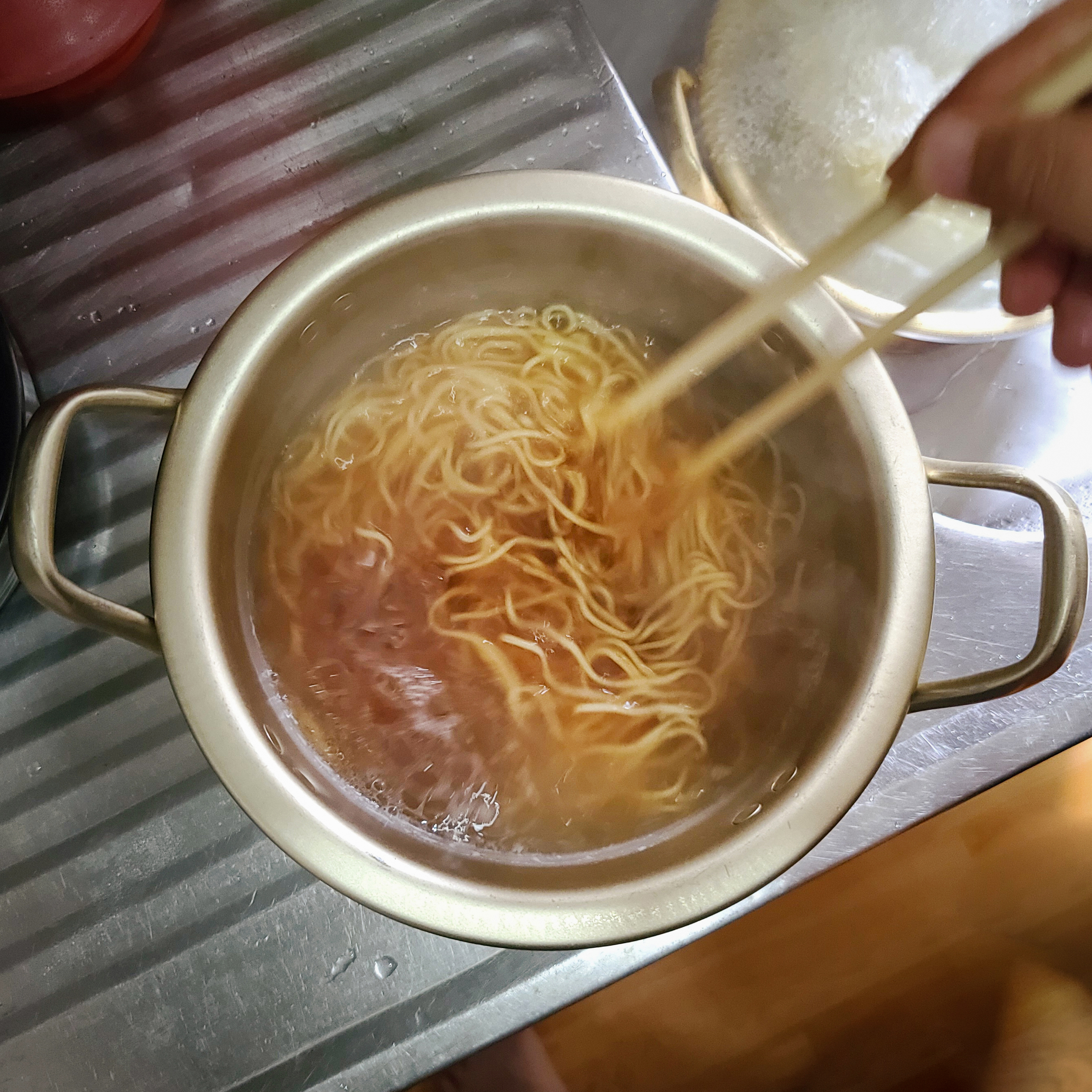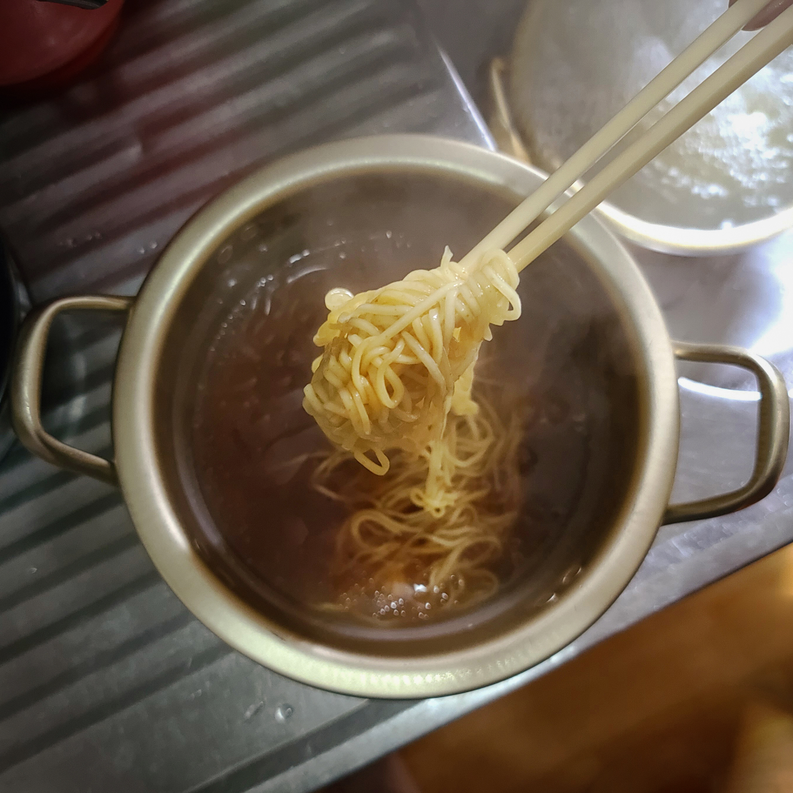 라면 물이 끓으면 면을 넣고 약 3분간 보글보글 끓여줍니다. 앞서 말씀드린 것처럼 면은 일본 라멘집에서 보는 것 같은 풀어지는 생면 느낌의 면이었습니다.